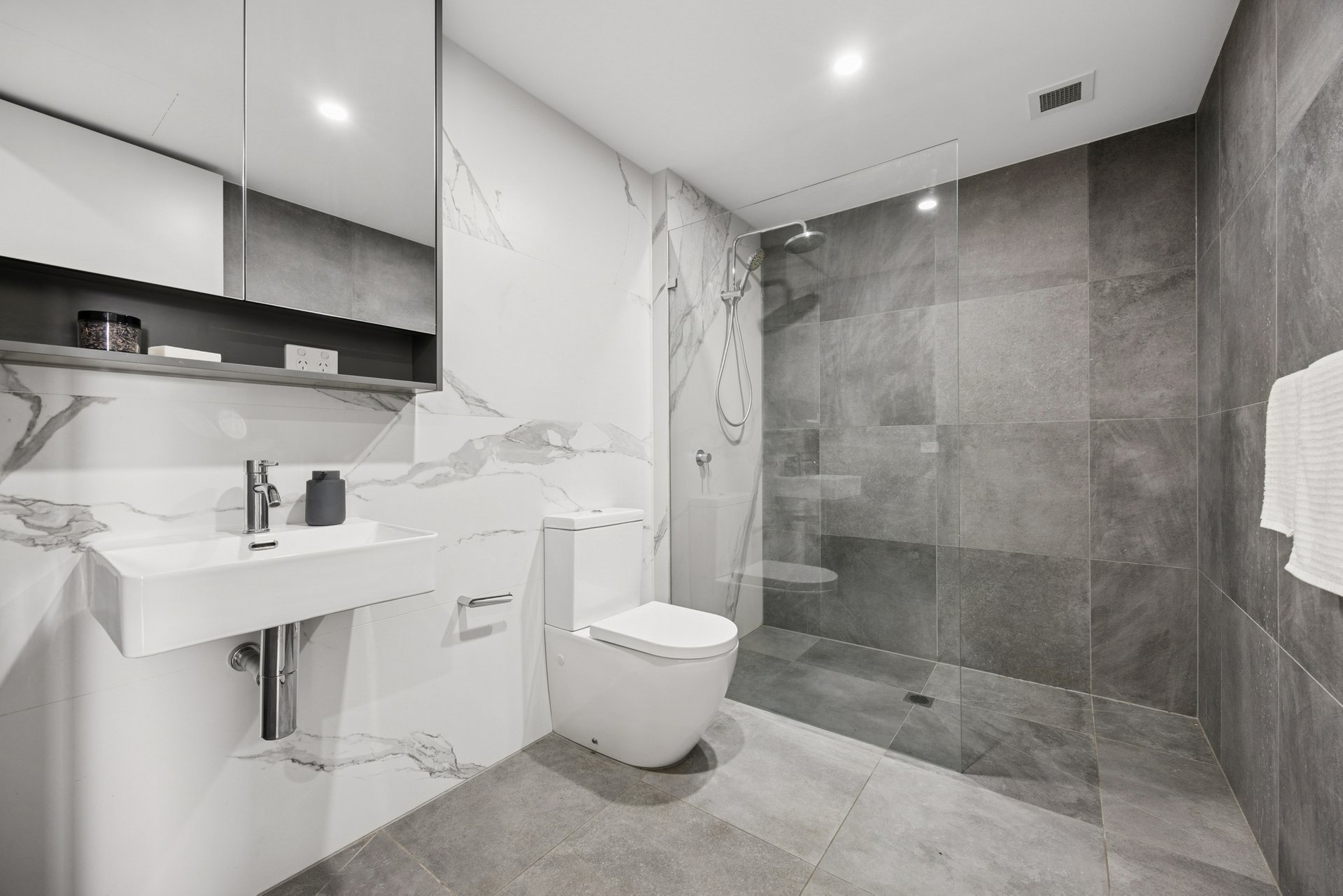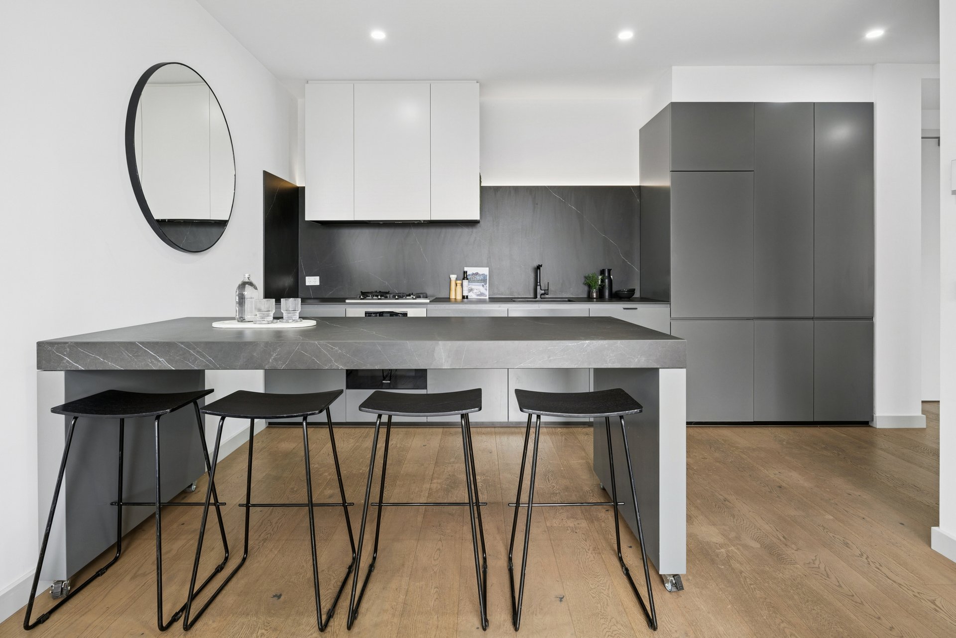 Living and dining sit together in a bright, open-plan setting with split-system heating and cooling and a built-in TV unit that keeps the room looking organised. Double sliding doors open to a full-width, north-facing balcony creating an easy indoor-outdoor connection. The kitchen features stone benchtops, quality cooking appliances, an integrated fridge and freezer, and dishwasher. A movable island bench rolls in for extra prep space and casual seating, then tucks away to open the room back up. It’s a simple design choice that adds great versatility.