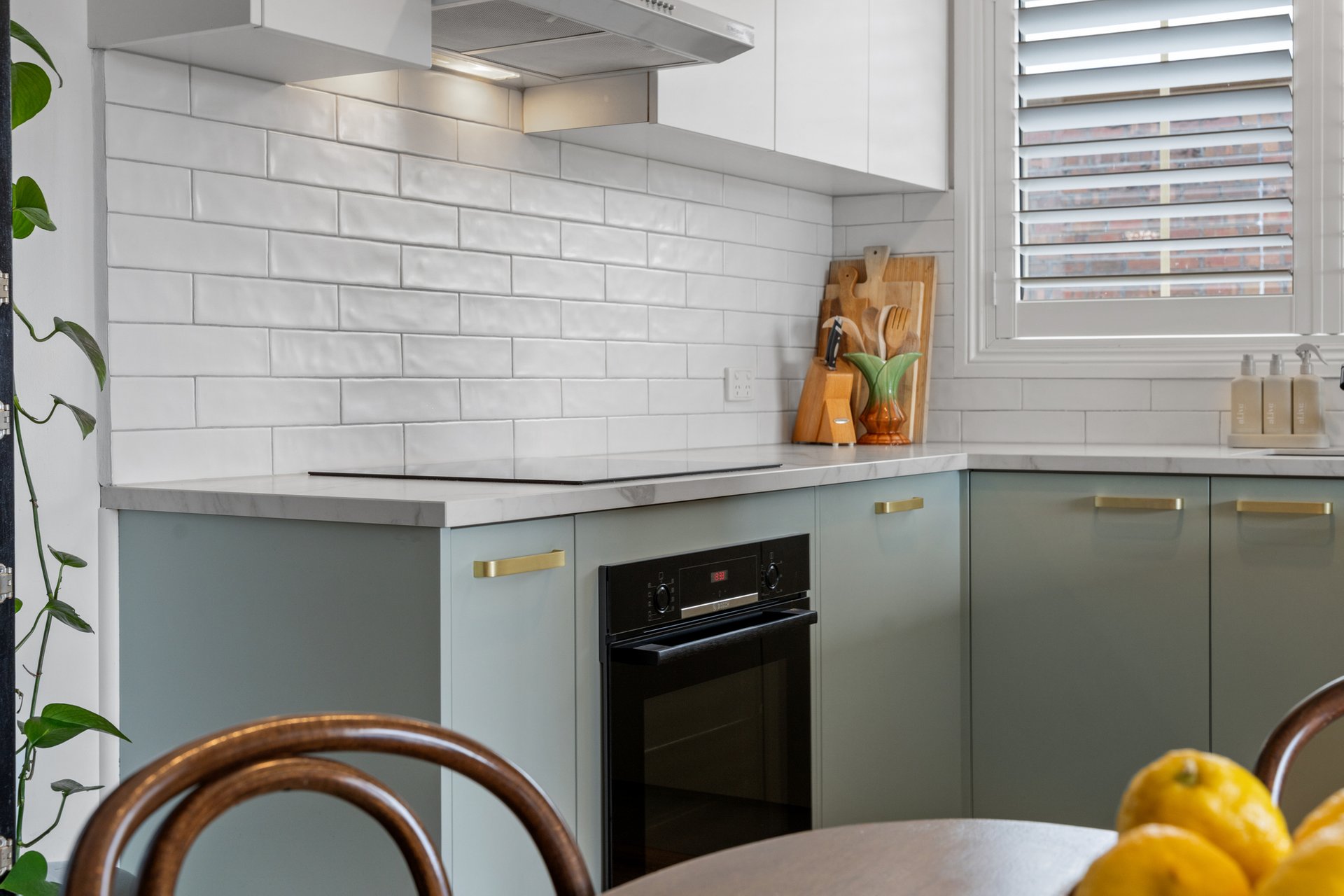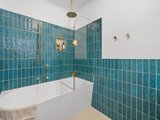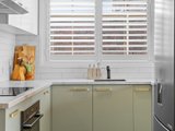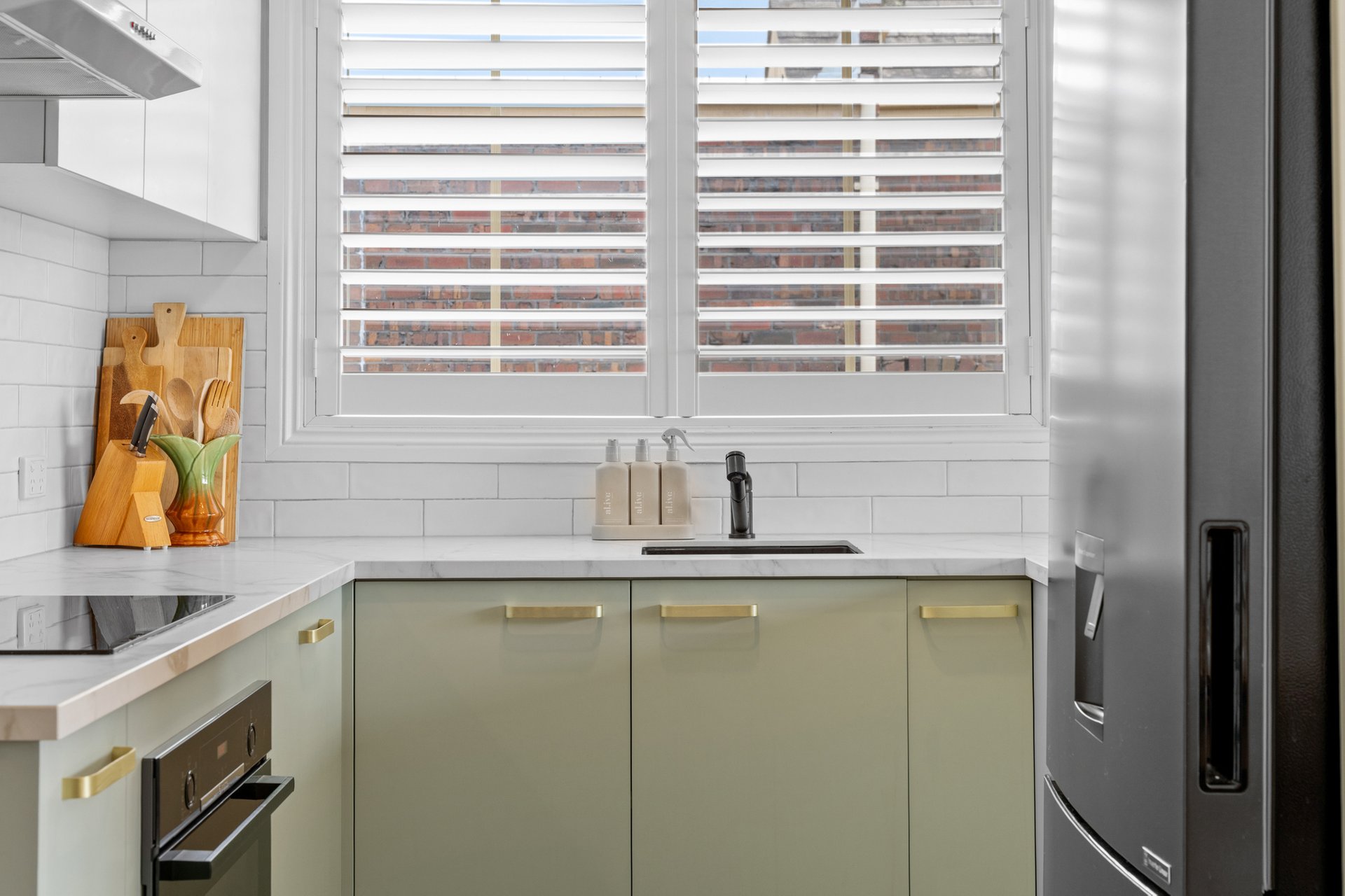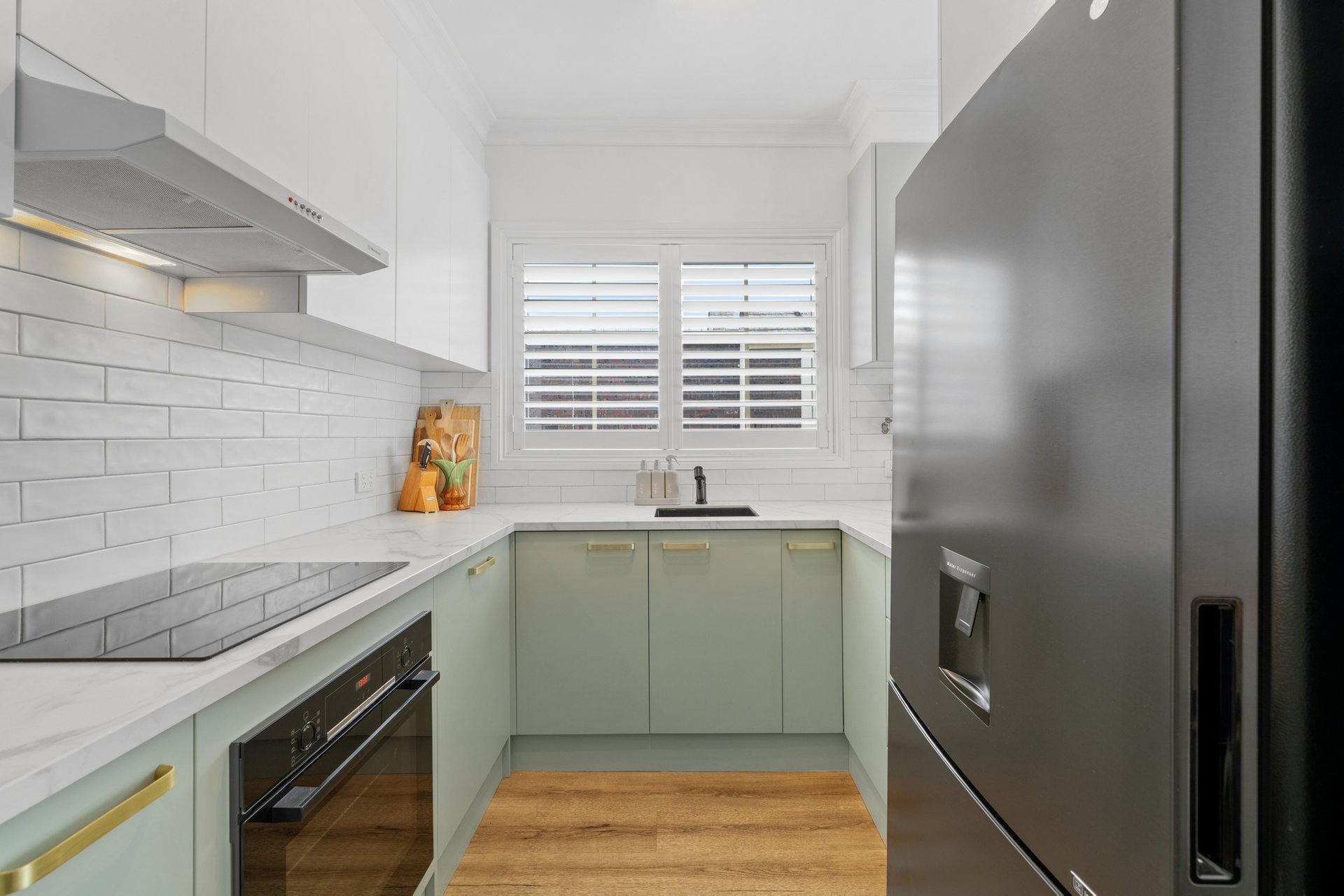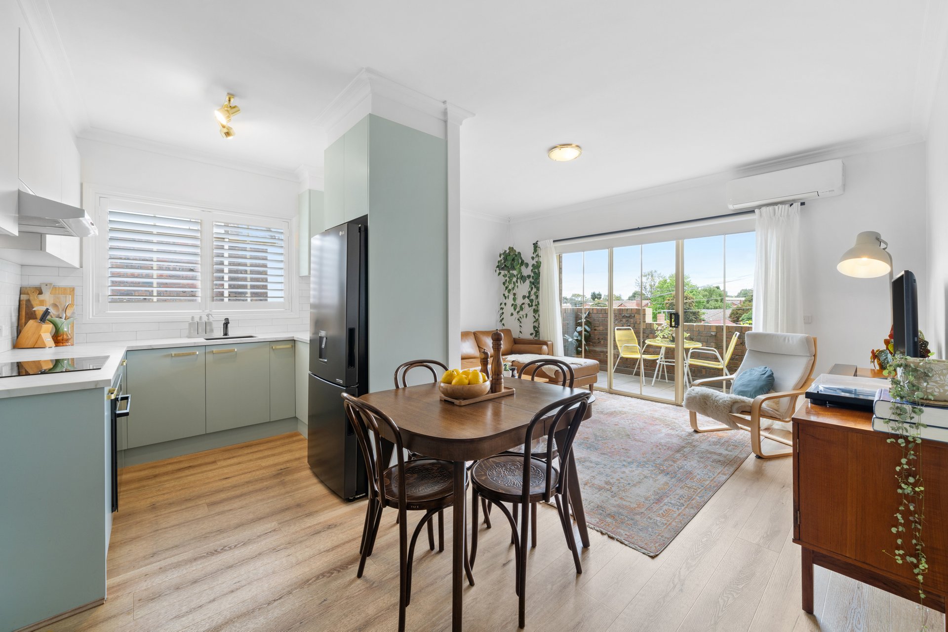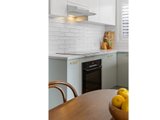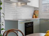 The recently renovated kitchen brings a touch of style and functionality, with stone look benchtops, Bosch appliances, soft sage green cabinetry, and brass hardware. The two spacious bedrooms feature plush carpets, ceiling fans, and plantation shutters, offering a calm retreat with soft neutral tones. A fully renovated bathroom impresses with teal feature tiles, a rainfall shower over bath, brass fittings, and a floating vanity, complemented by an integrated European-style laundry.