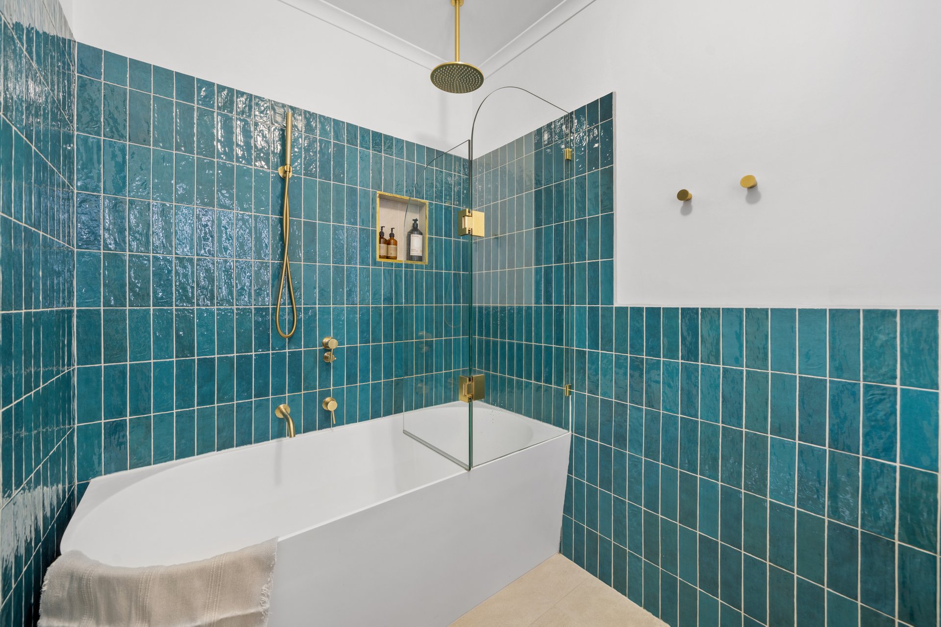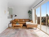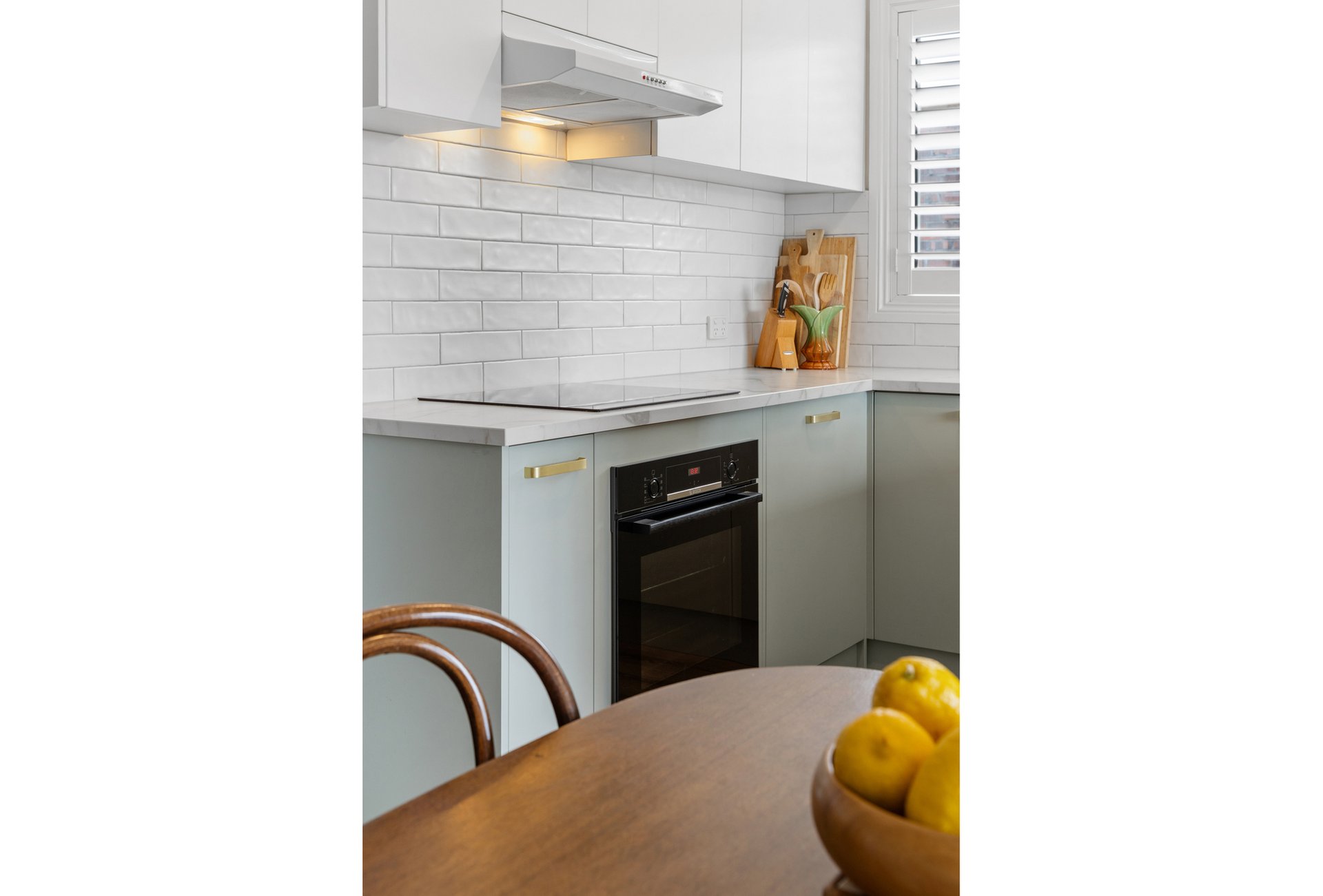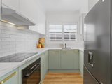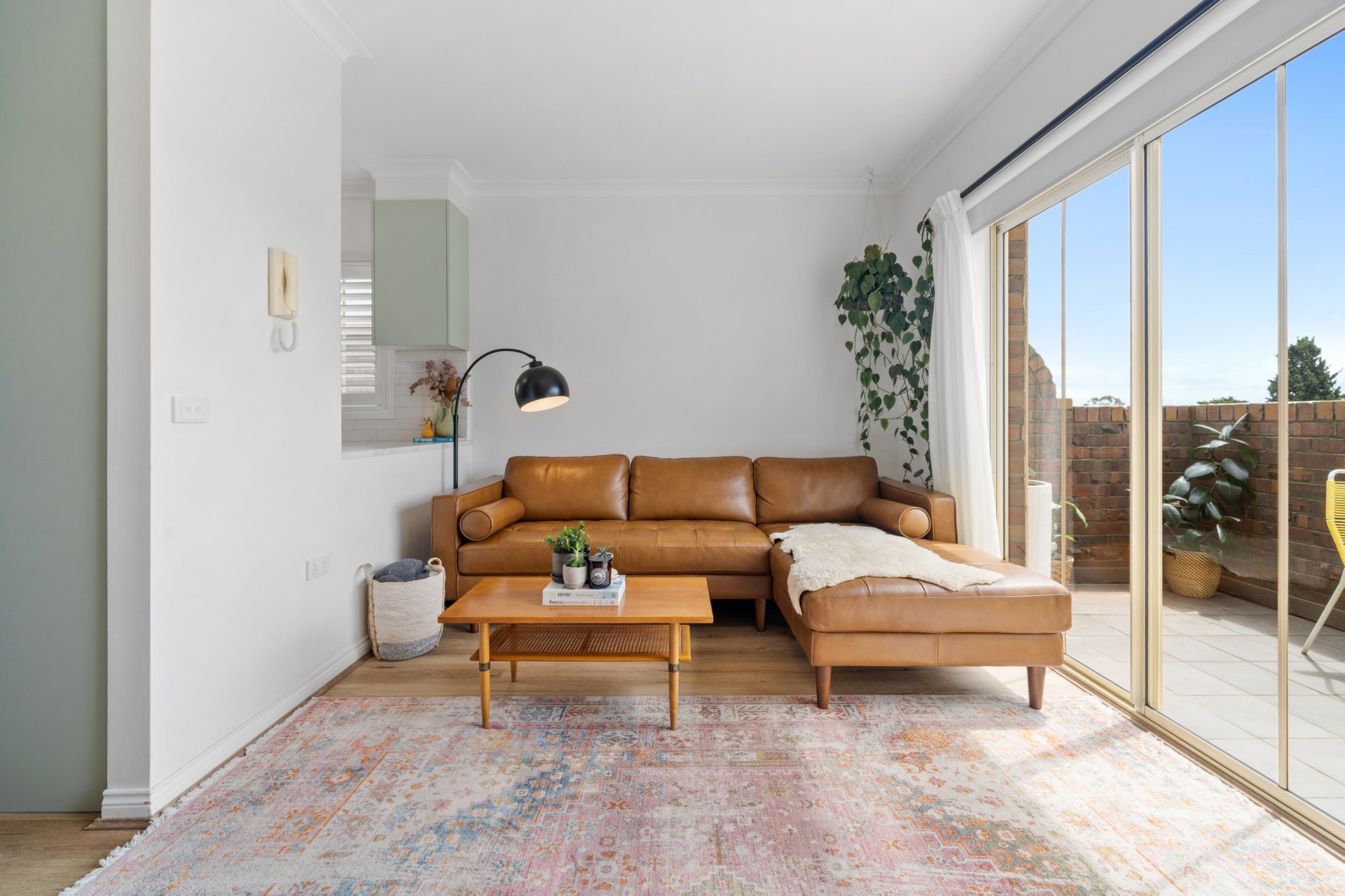 The recently renovated kitchen brings a touch of style and functionality, with stone look benchtops, Bosch appliances, soft sage green cabinetry, and brass hardware. The two spacious bedrooms feature plush carpets, ceiling fans, and plantation shutters, offering a calm retreat with soft neutral tones. A fully renovated bathroom impresses with teal feature tiles, a rainfall shower over bath, brass fittings, and a floating vanity, complemented by an integrated European-style laundry.