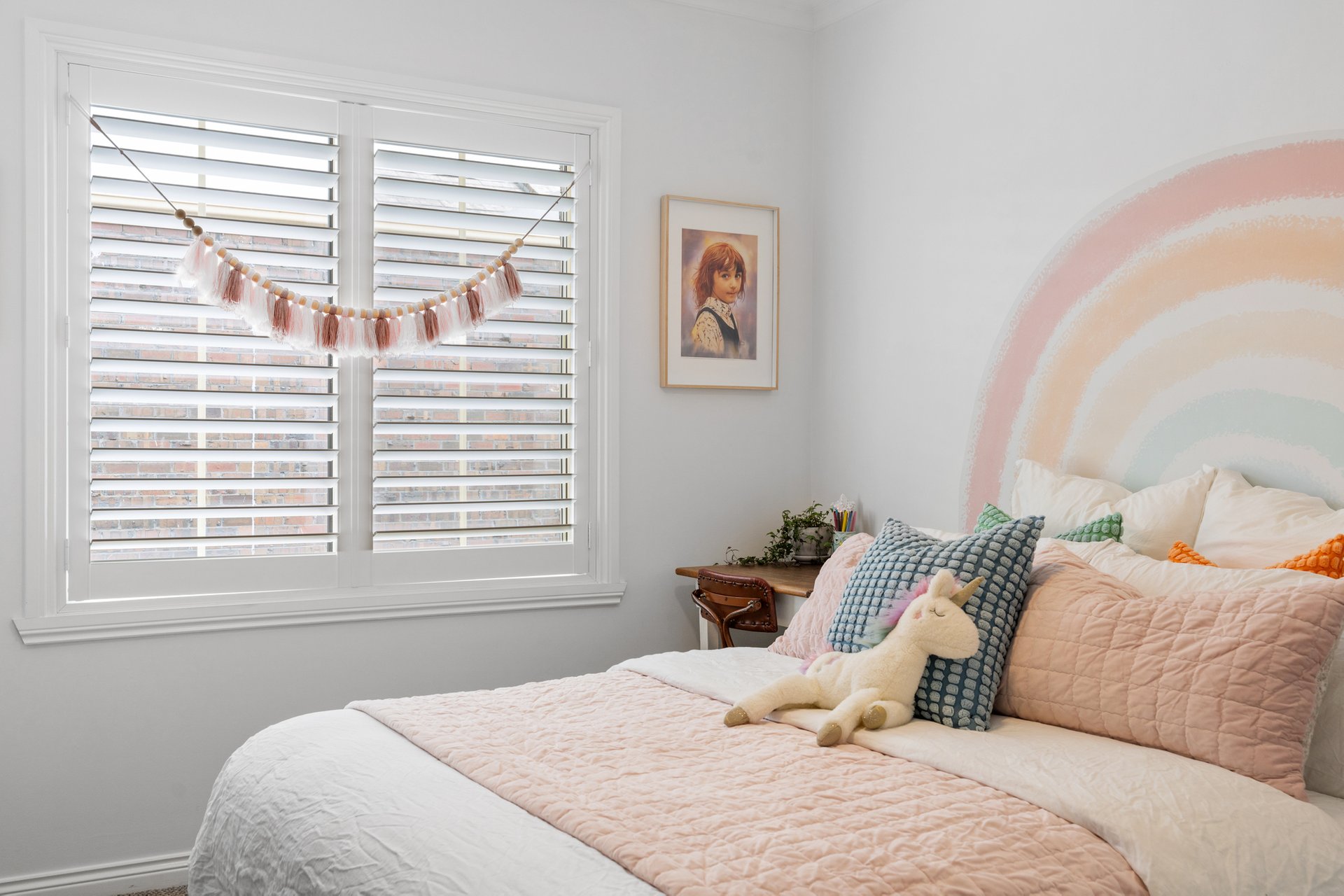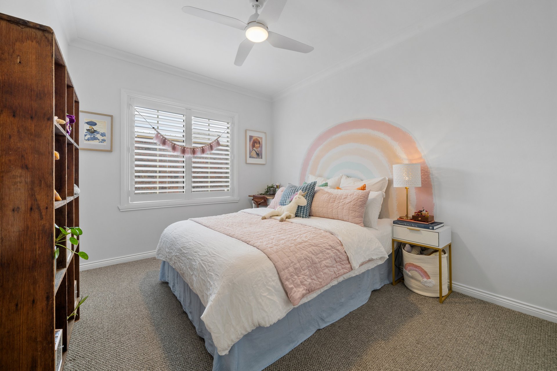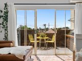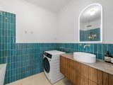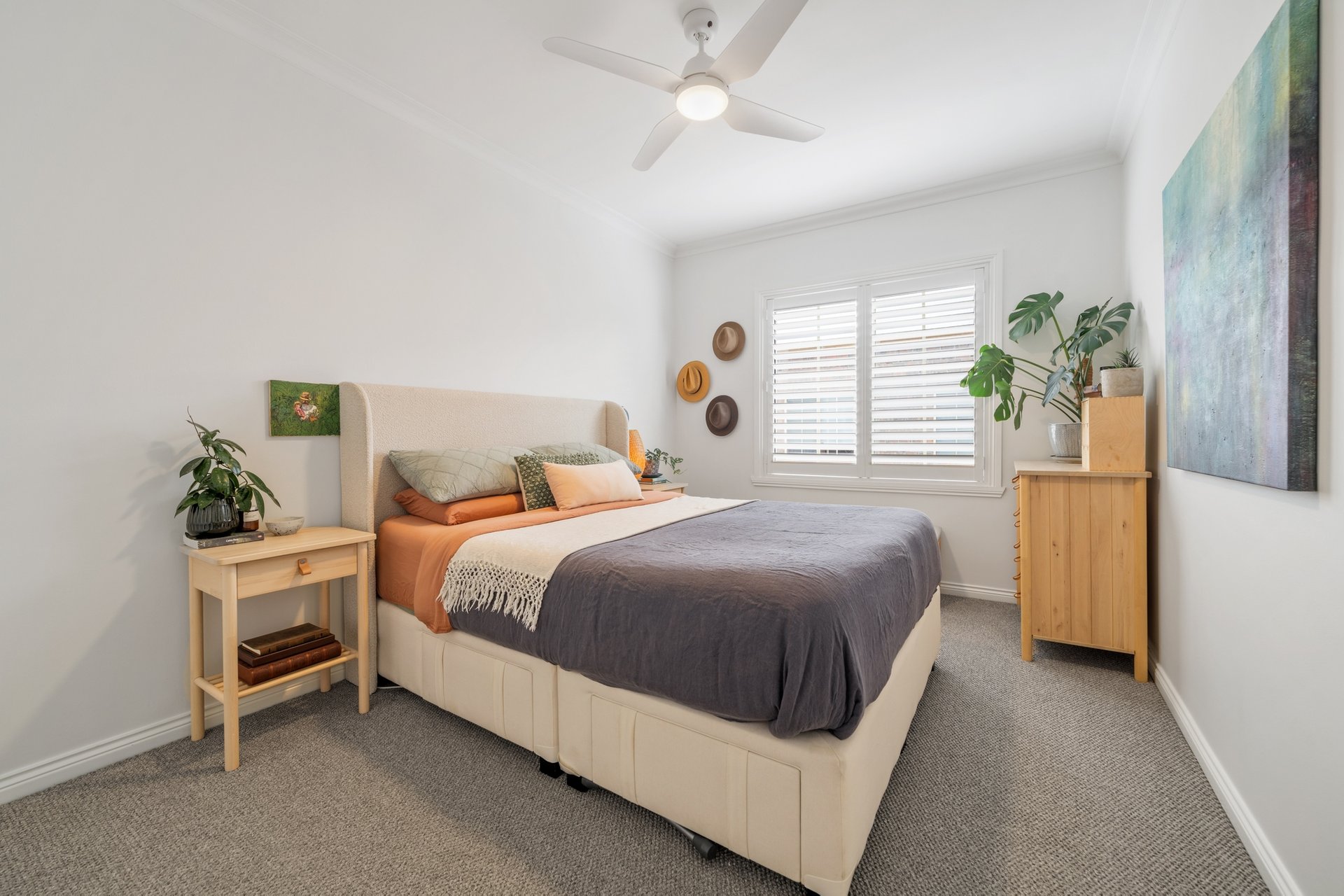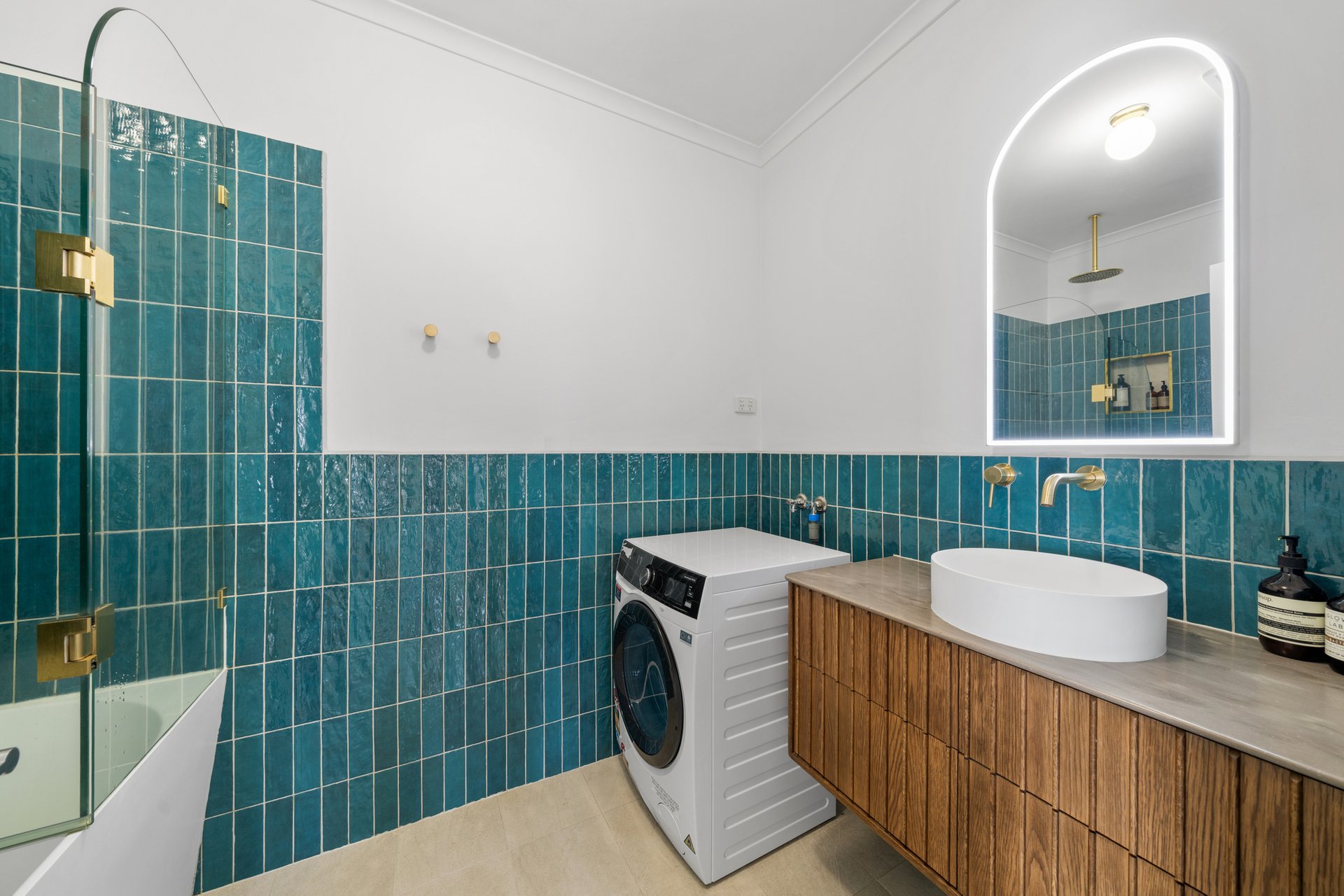 The recently renovated kitchen brings a touch of style and functionality, with stone look benchtops, Bosch appliances, soft sage green cabinetry, and brass hardware. The two spacious bedrooms feature plush carpets, ceiling fans, and plantation shutters, offering a calm retreat with soft neutral tones. A fully renovated bathroom impresses with teal feature tiles, a rainfall shower over bath, brass fittings, and a floating vanity, complemented by an integrated European-style laundry.
