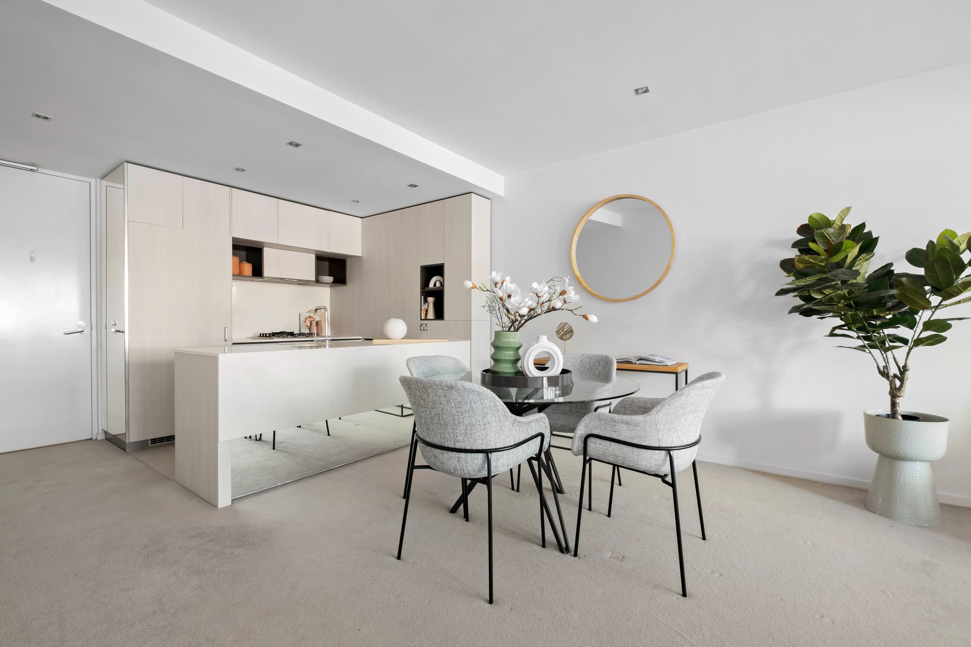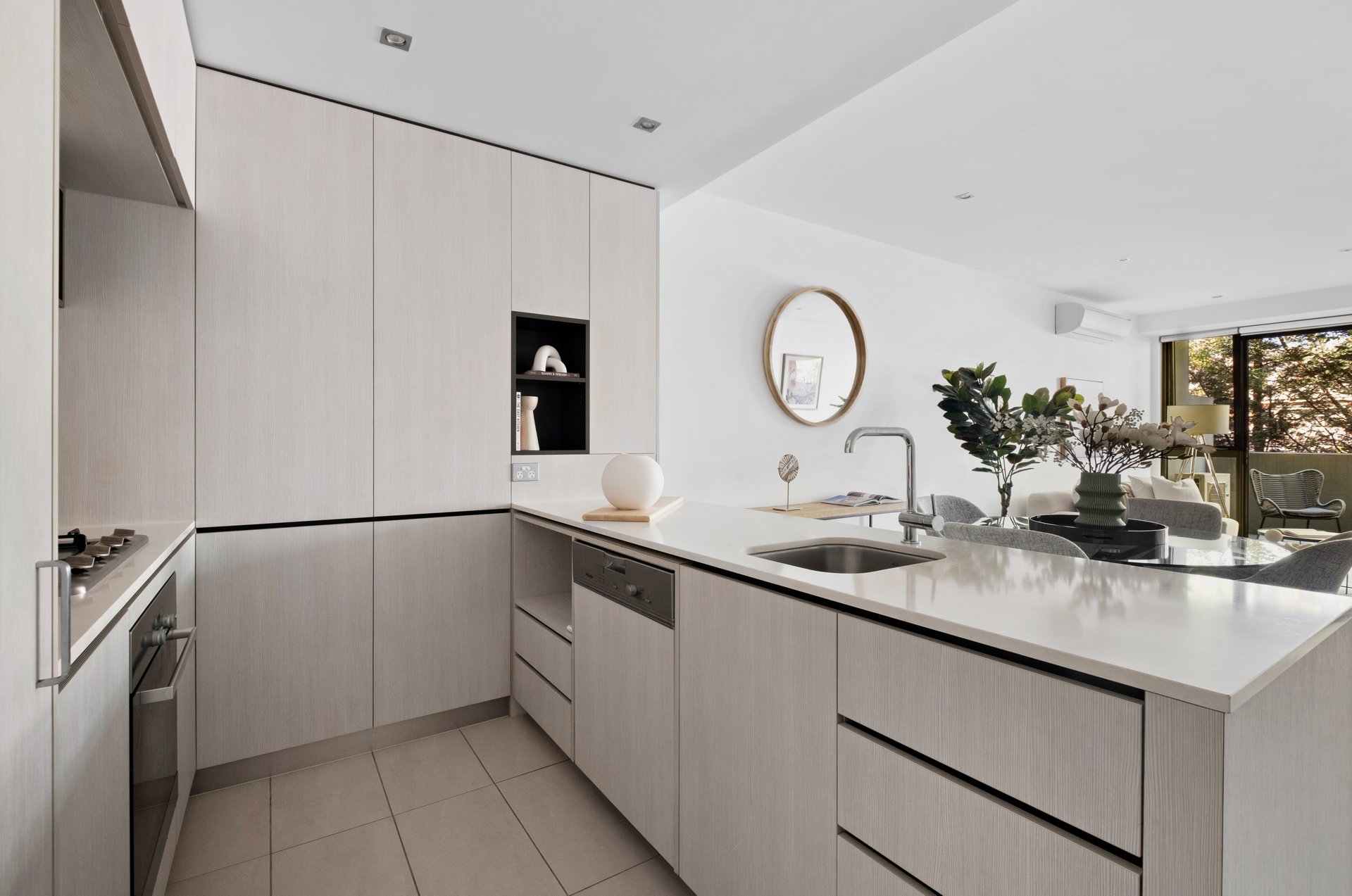 The expansive open-plan living and dining zone is both a quiet retreat and accommodating entertaining space and superbly extended by the deep terrace where you can entertain guests in leafy privacy. The luxurious kitchen hosts high end Miele appliances including a dishwasher, concealed fridge space, pantry and Caesarstone benchtops.