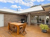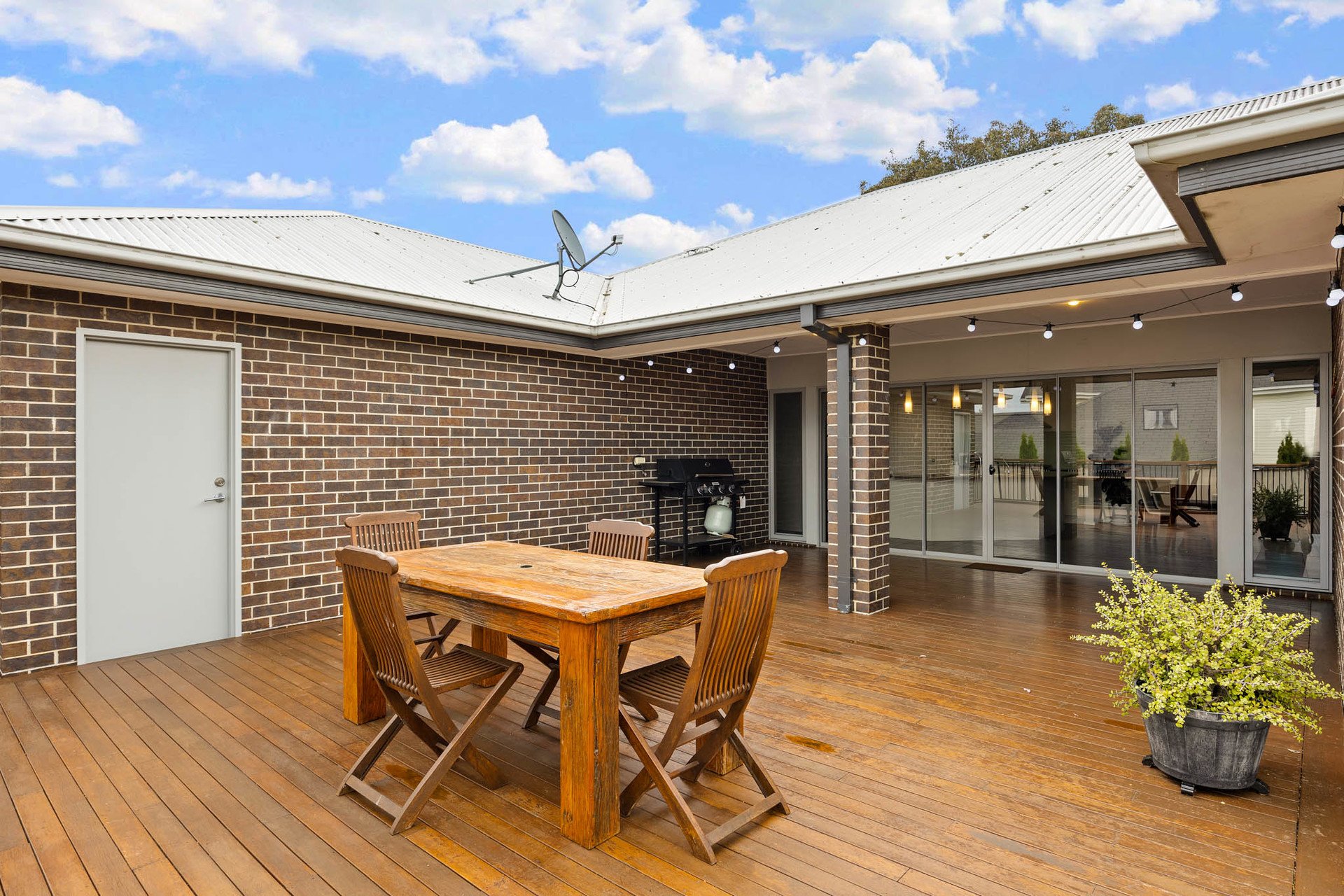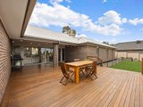 Assuring effortless indoor–outdoor living, a wall of glass stacker doors opens to a Merbau-decked alfresco and sun deck capturing leafy district views. From here, the layout steps down to a lawned rear yard framed by Colorbond fencing, with terraced garden beds and a garden shed.