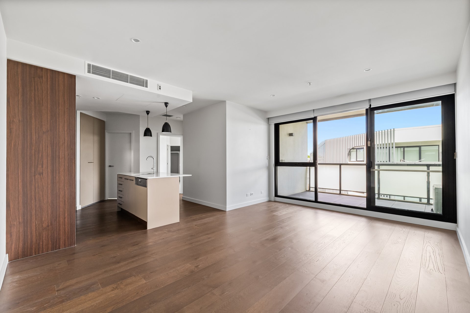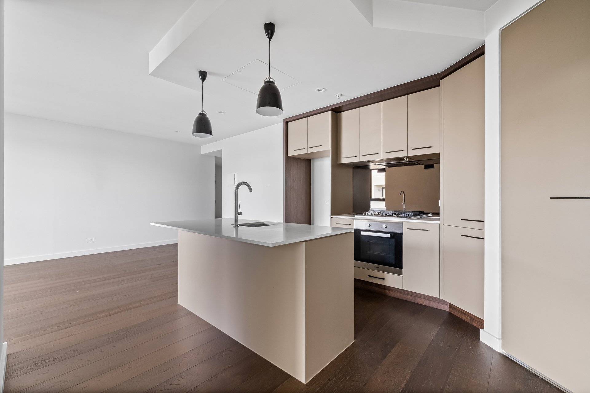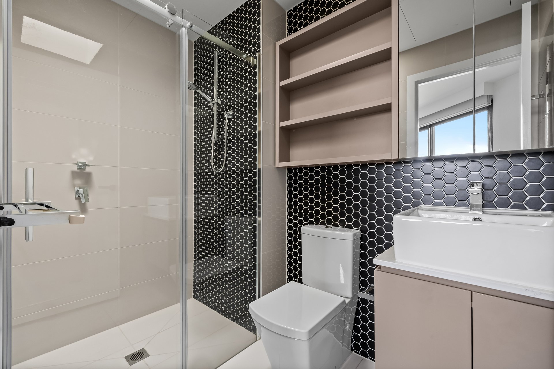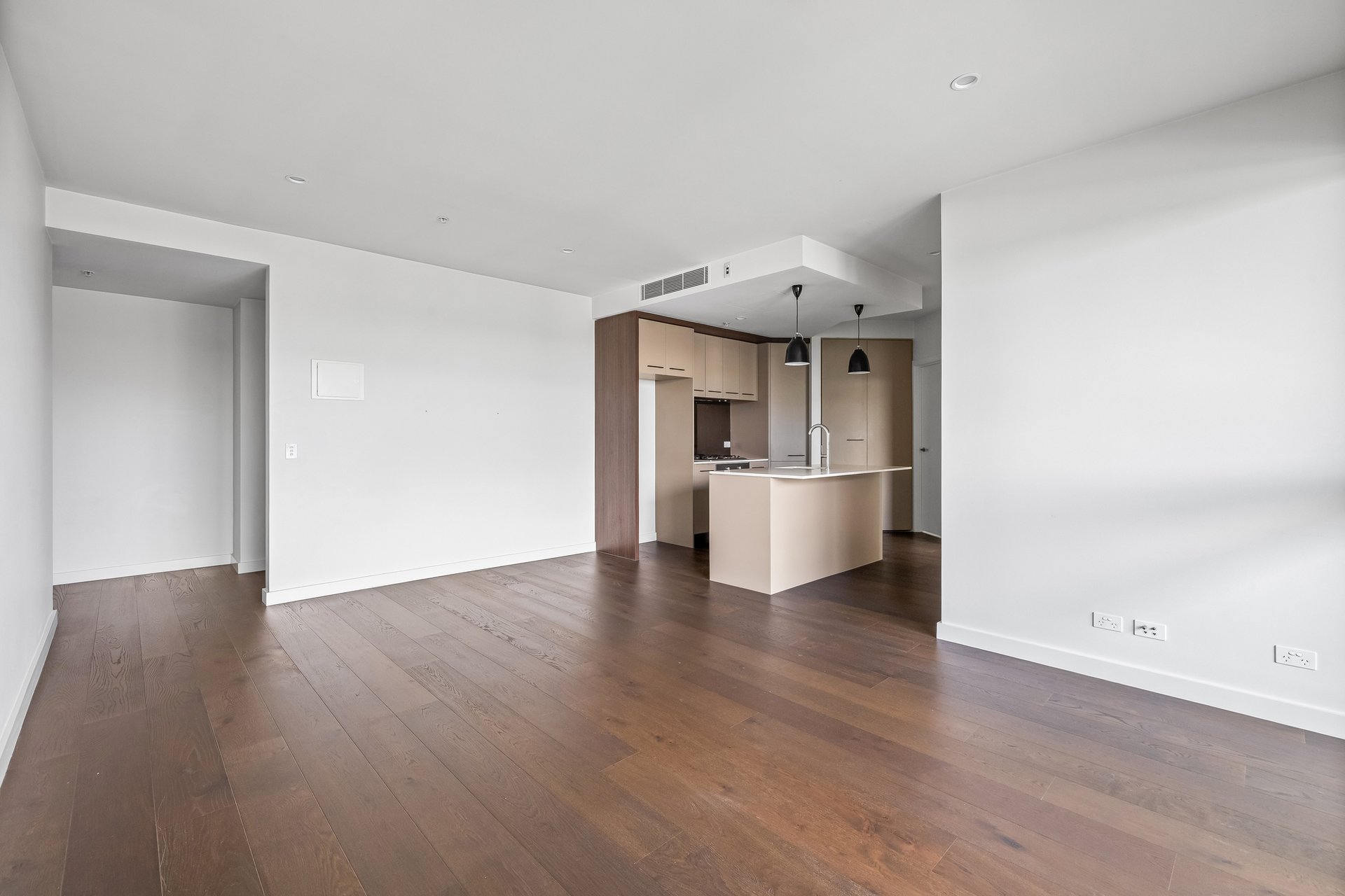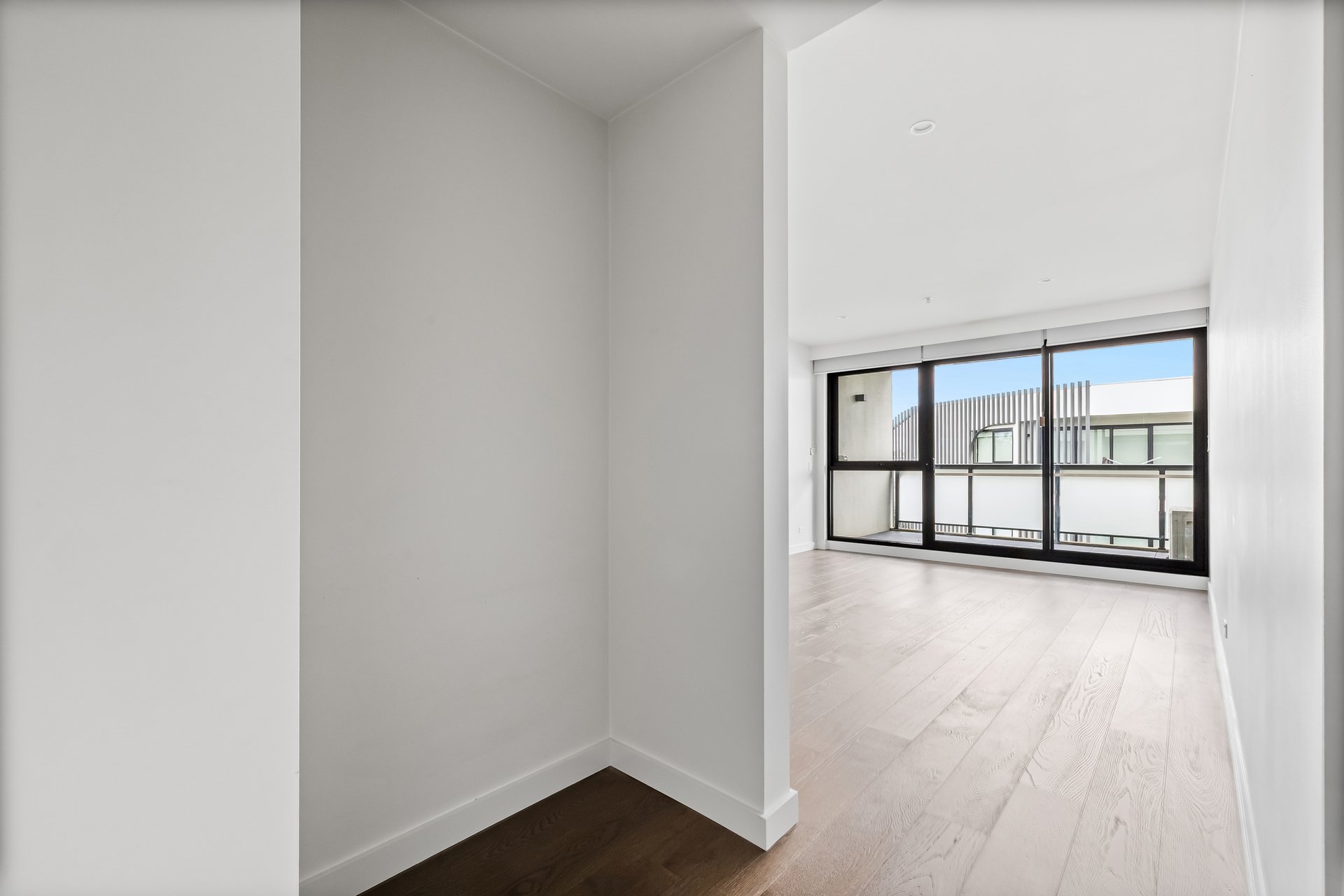 This refined two-bedroom, two-bathroom apartment delivers a practical yet upscale layout tailored for modern living. As you enter, a dedicated study/office nook sits at the end of the hallway, creating an ideal space for working from home. Beyond this, a generous open-plan living and dining area unfolds, framed by full-height windows that bathe the space in natural light.