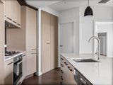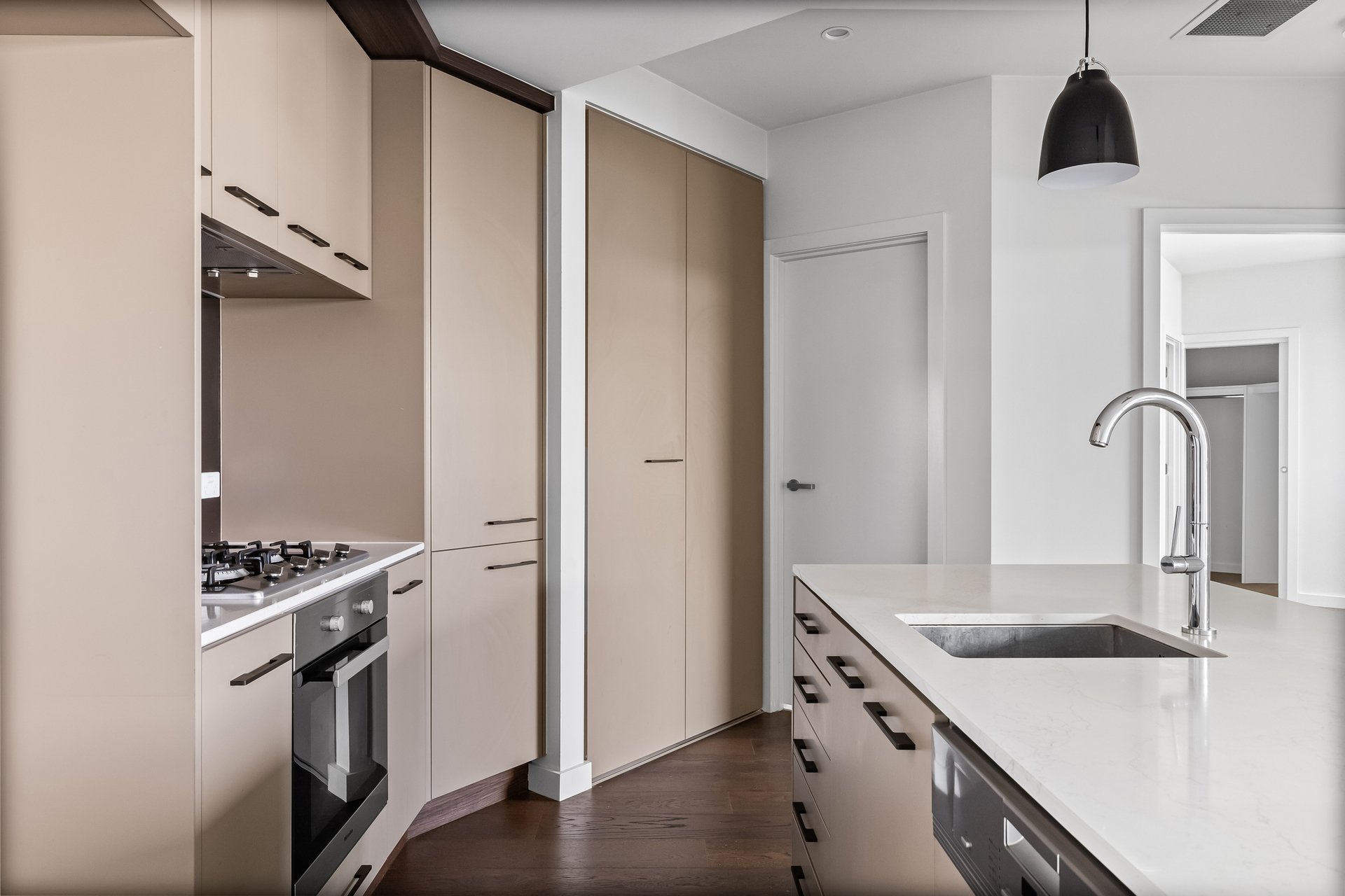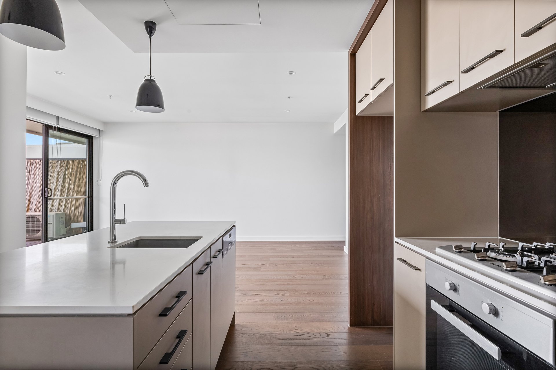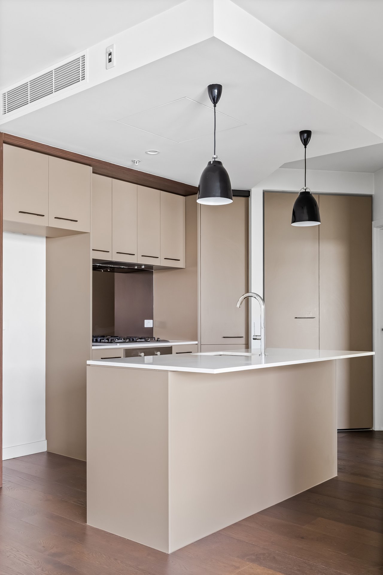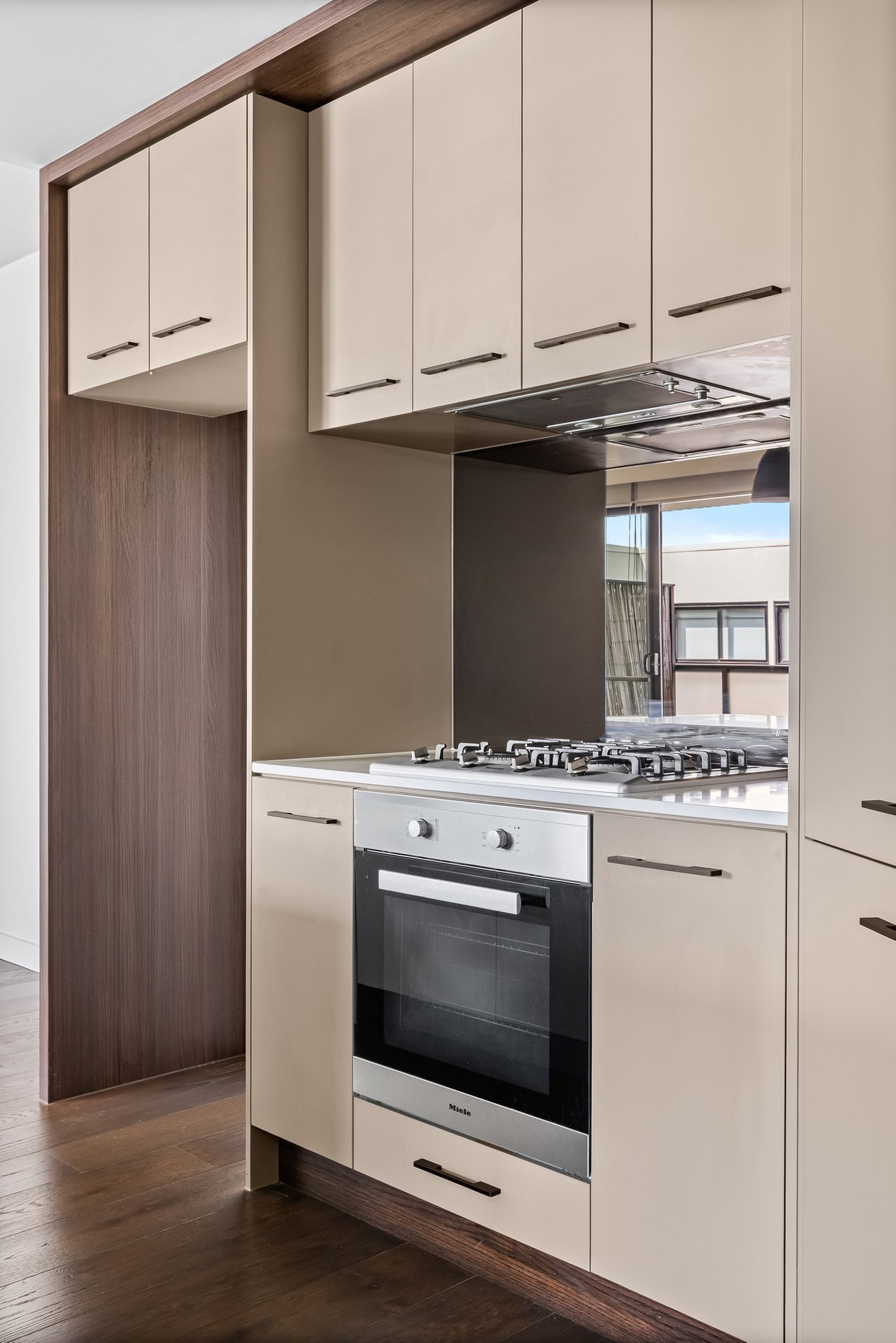The stylish and functional kitchen features stone benchtops, soft-close cabinetry, premium Miele appliances (including the stove and dishwasher), and an island breakfast bar, perfect for casual meals or entertaining guests.