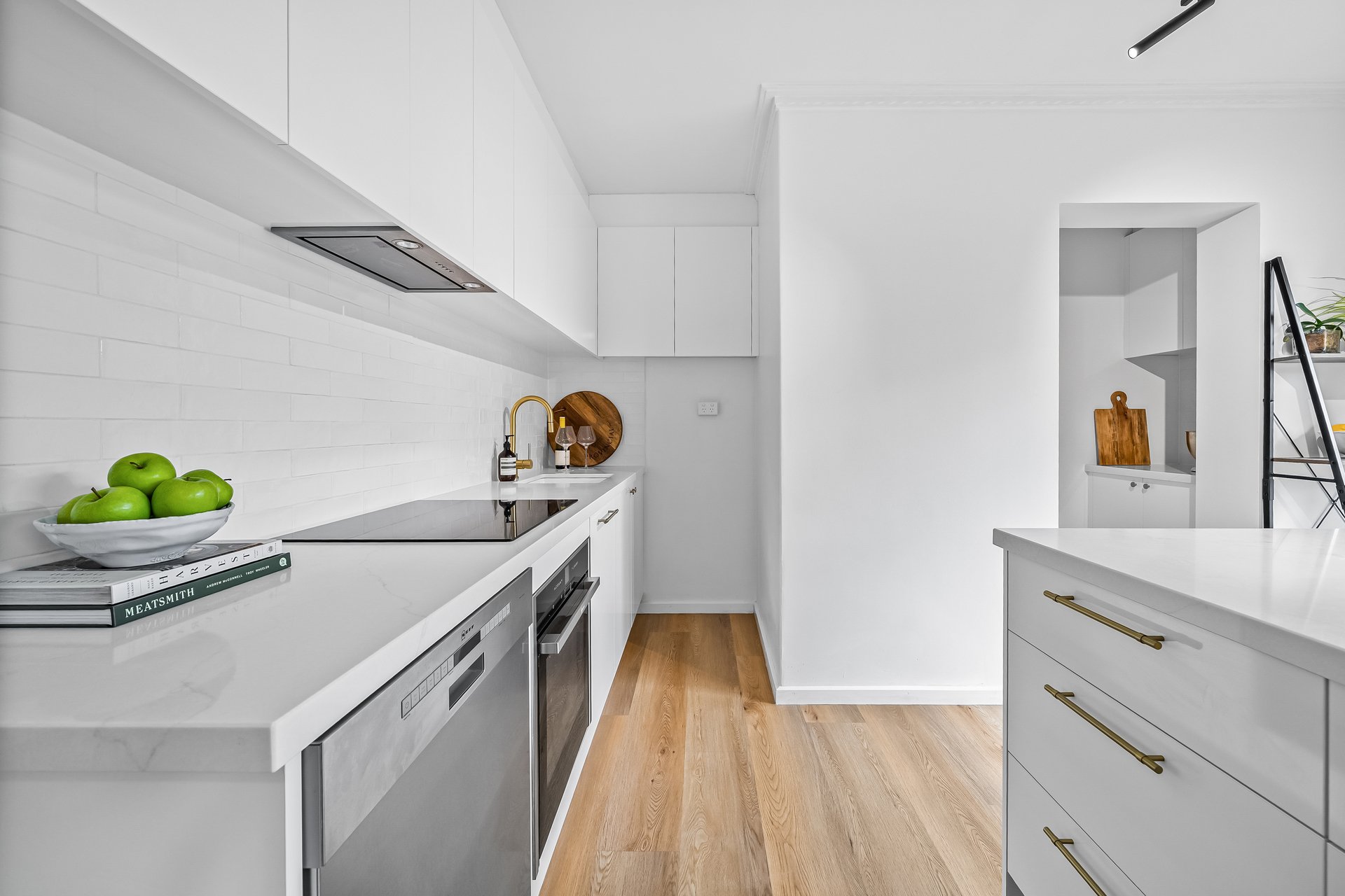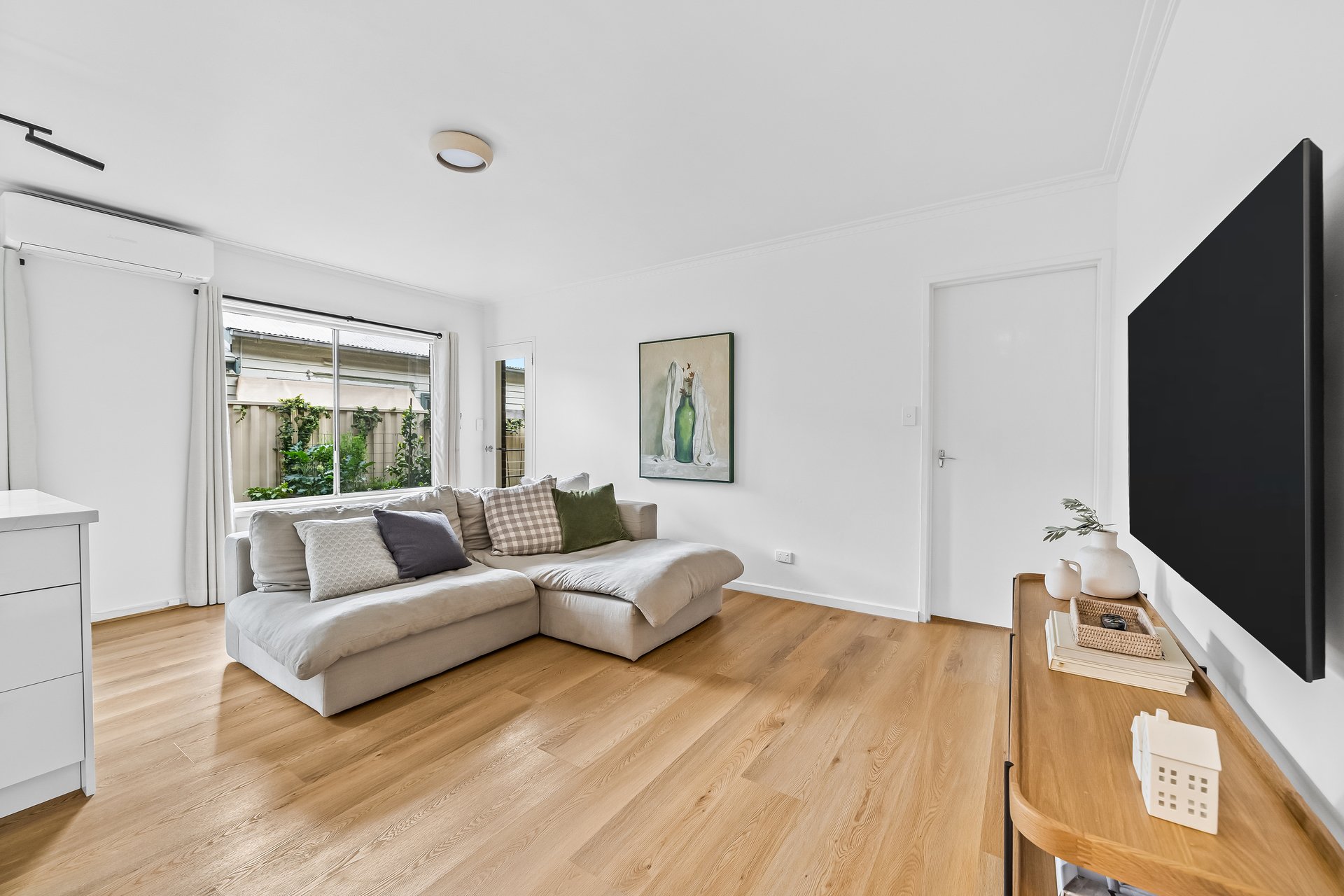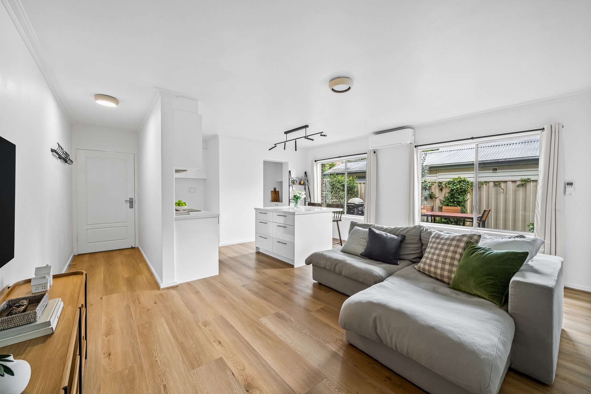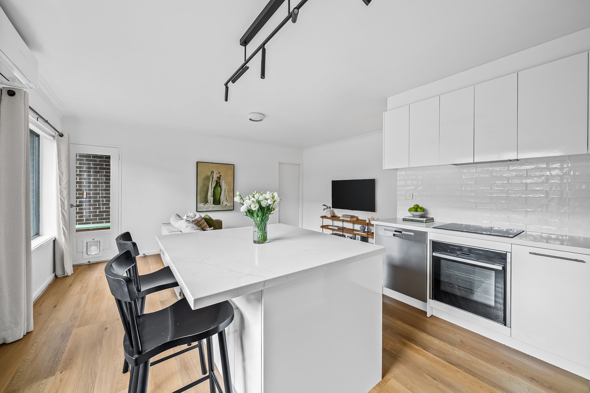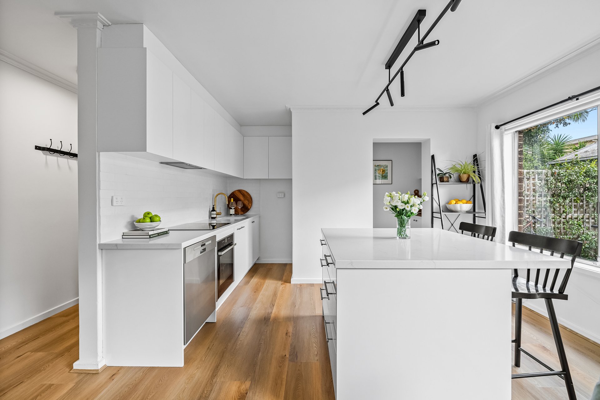 Inside, the sunlit open-plan living and dining area enjoys a prized north-facing aspect and flows seamlessly to a sleek island kitchen, superbly appointed with premium NEFF appliances, a walk-in pantry, and generous storage. Split-system heating and cooling provide year-round comfort.
