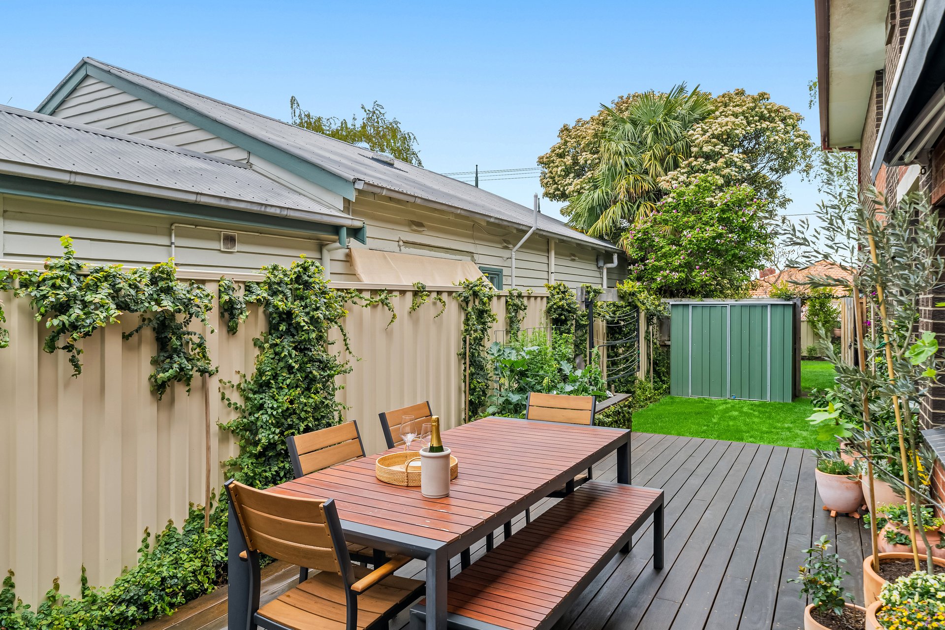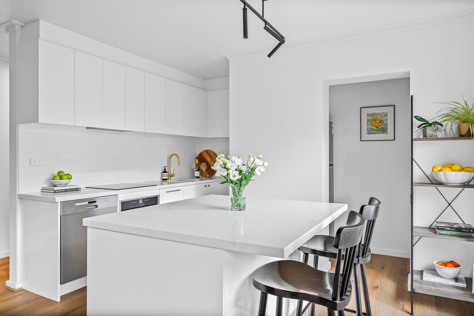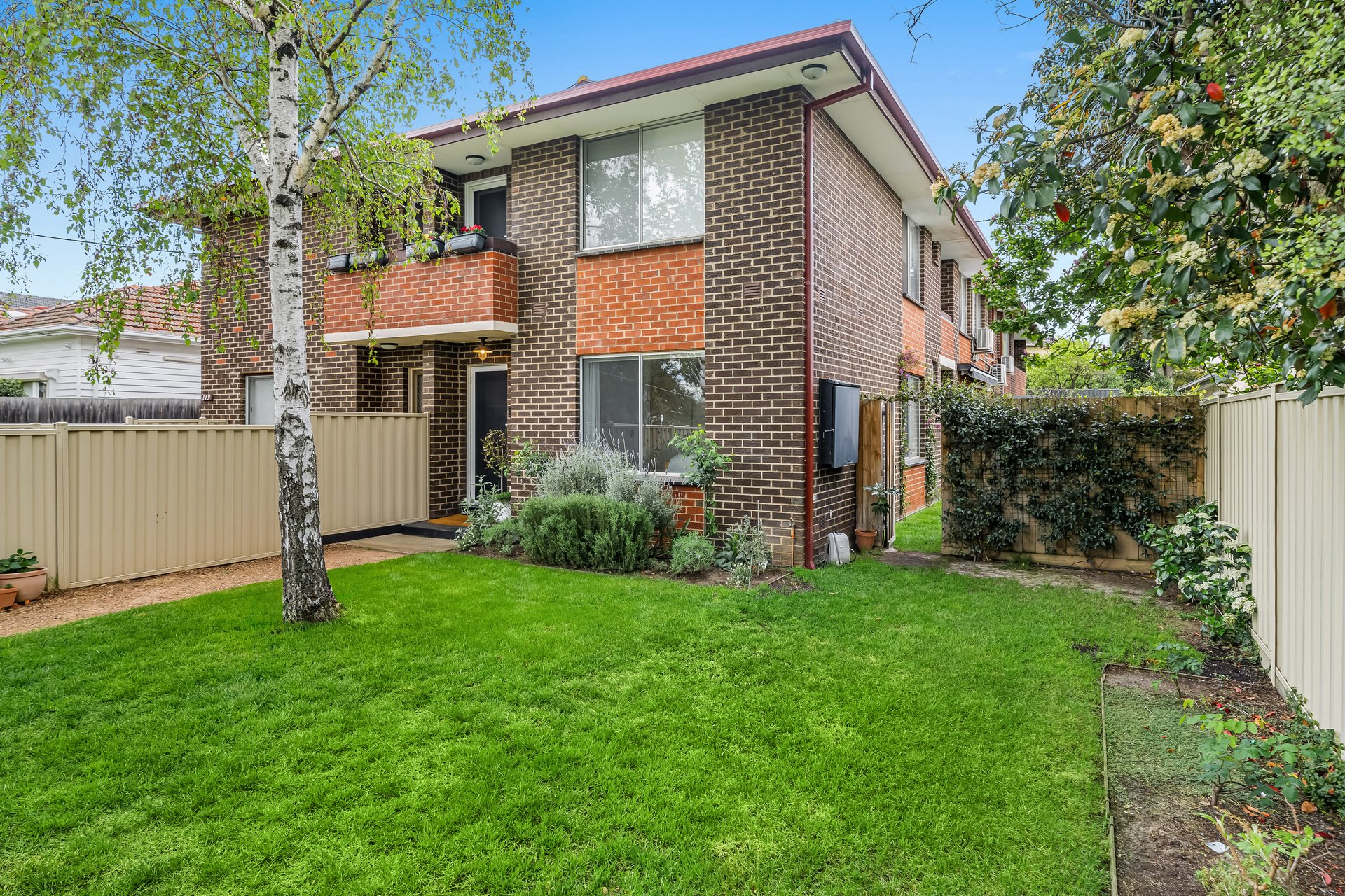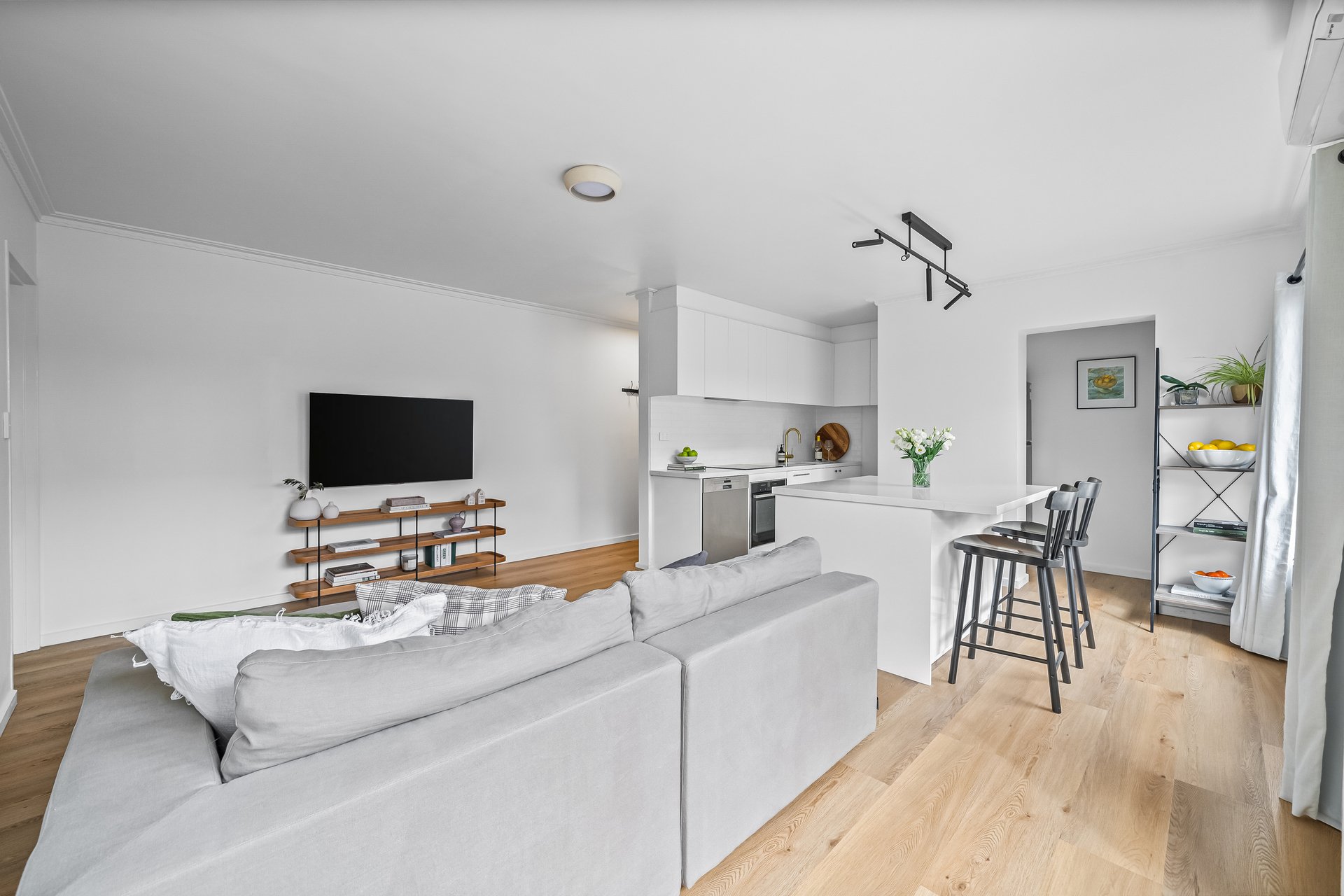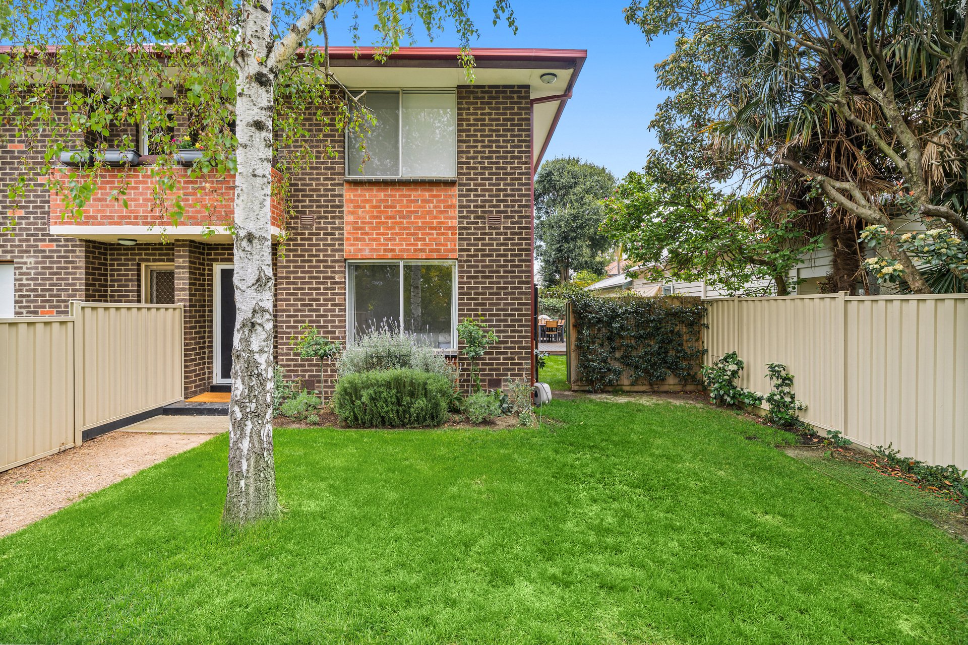 Inside, the sunlit open-plan living and dining area enjoys a prized north-facing aspect and flows seamlessly to a sleek island kitchen, superbly appointed with premium NEFF appliances, a walk-in pantry, and generous storage. Split-system heating and cooling provide year-round comfort.