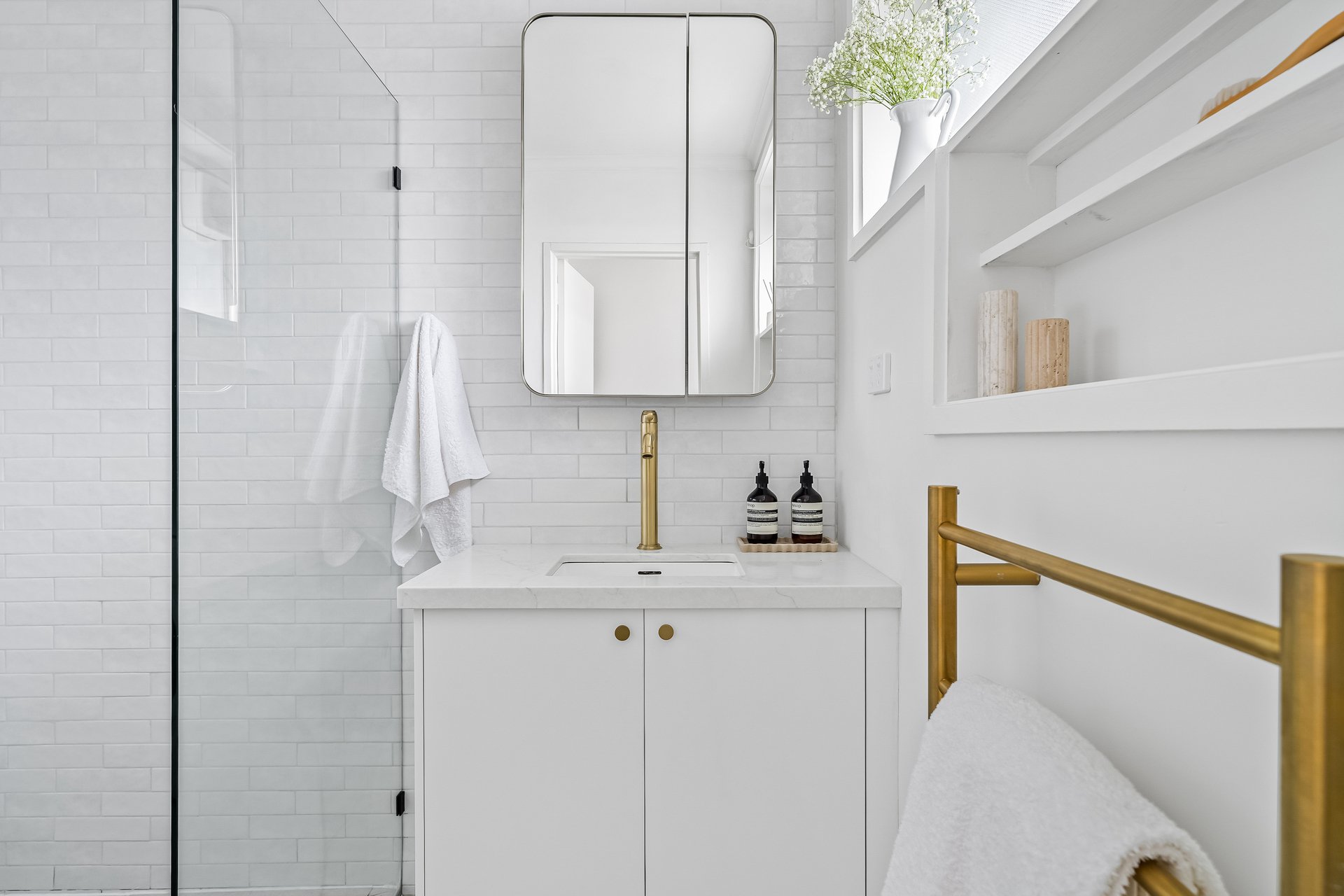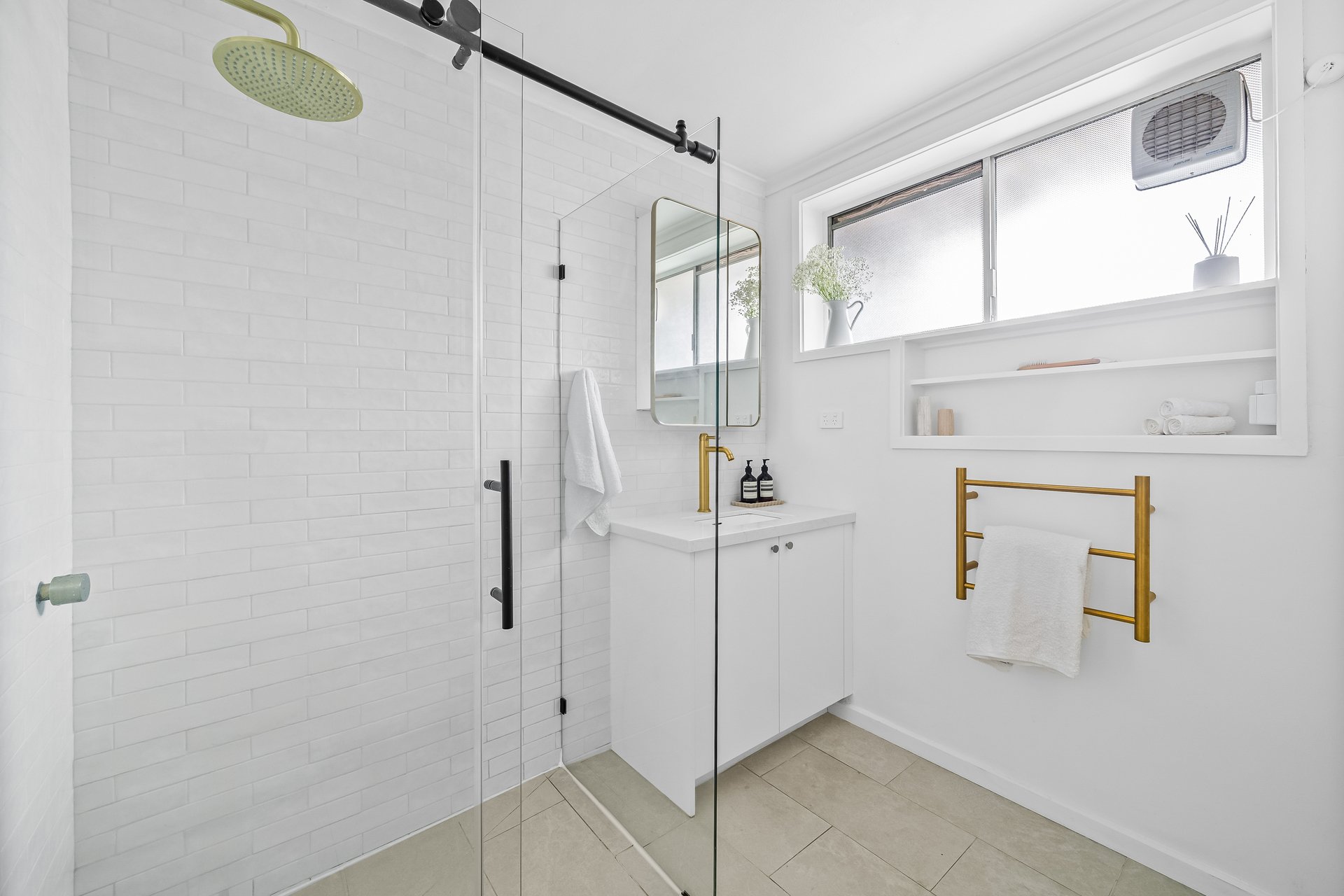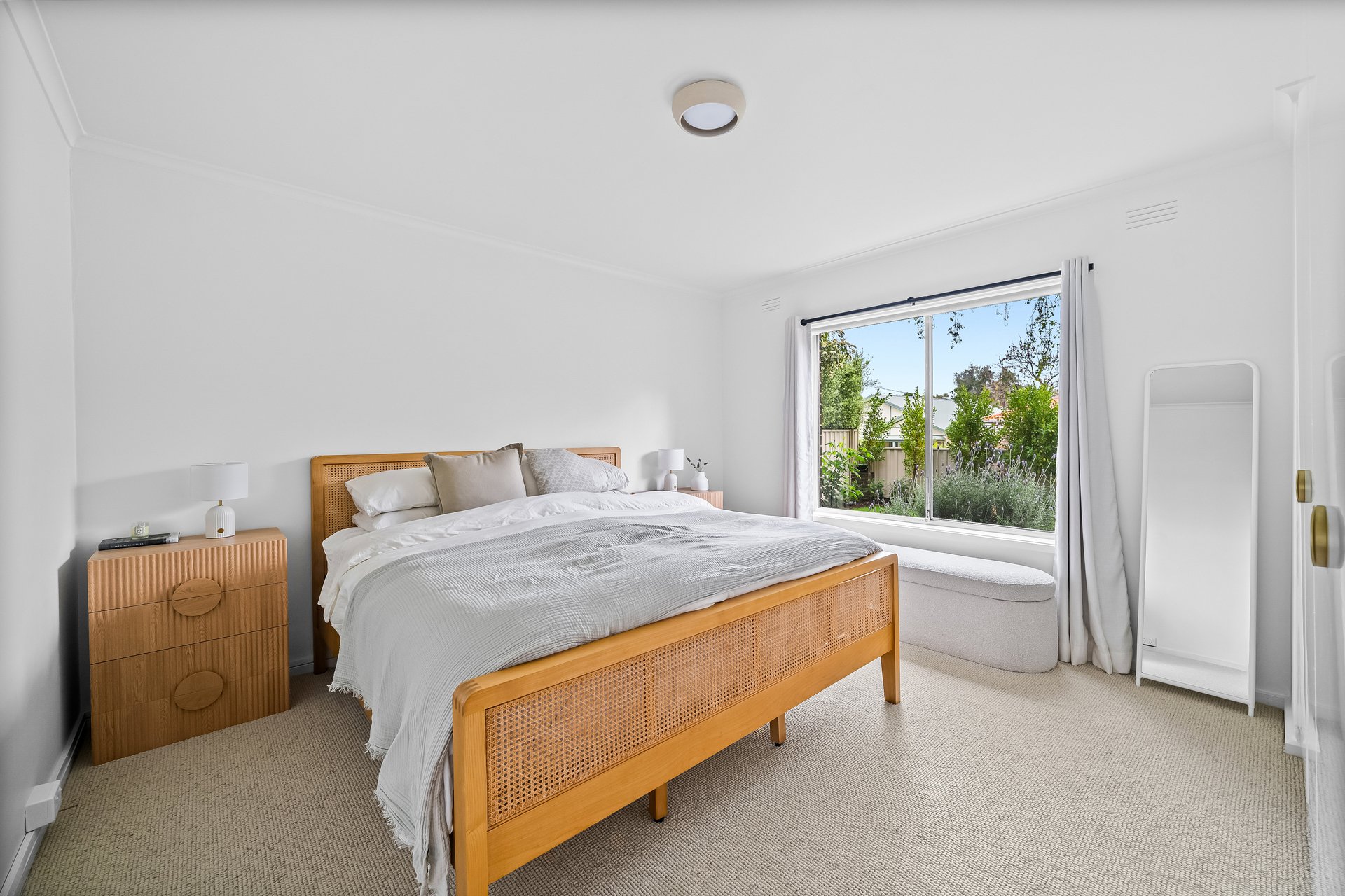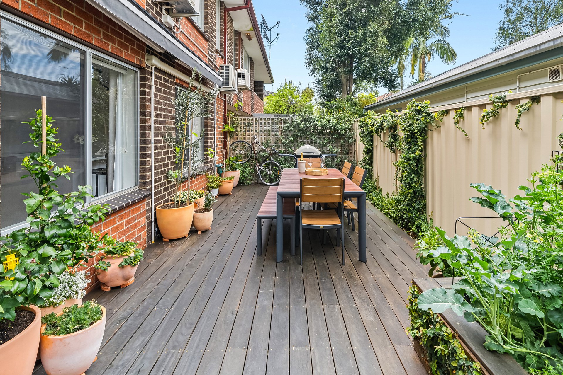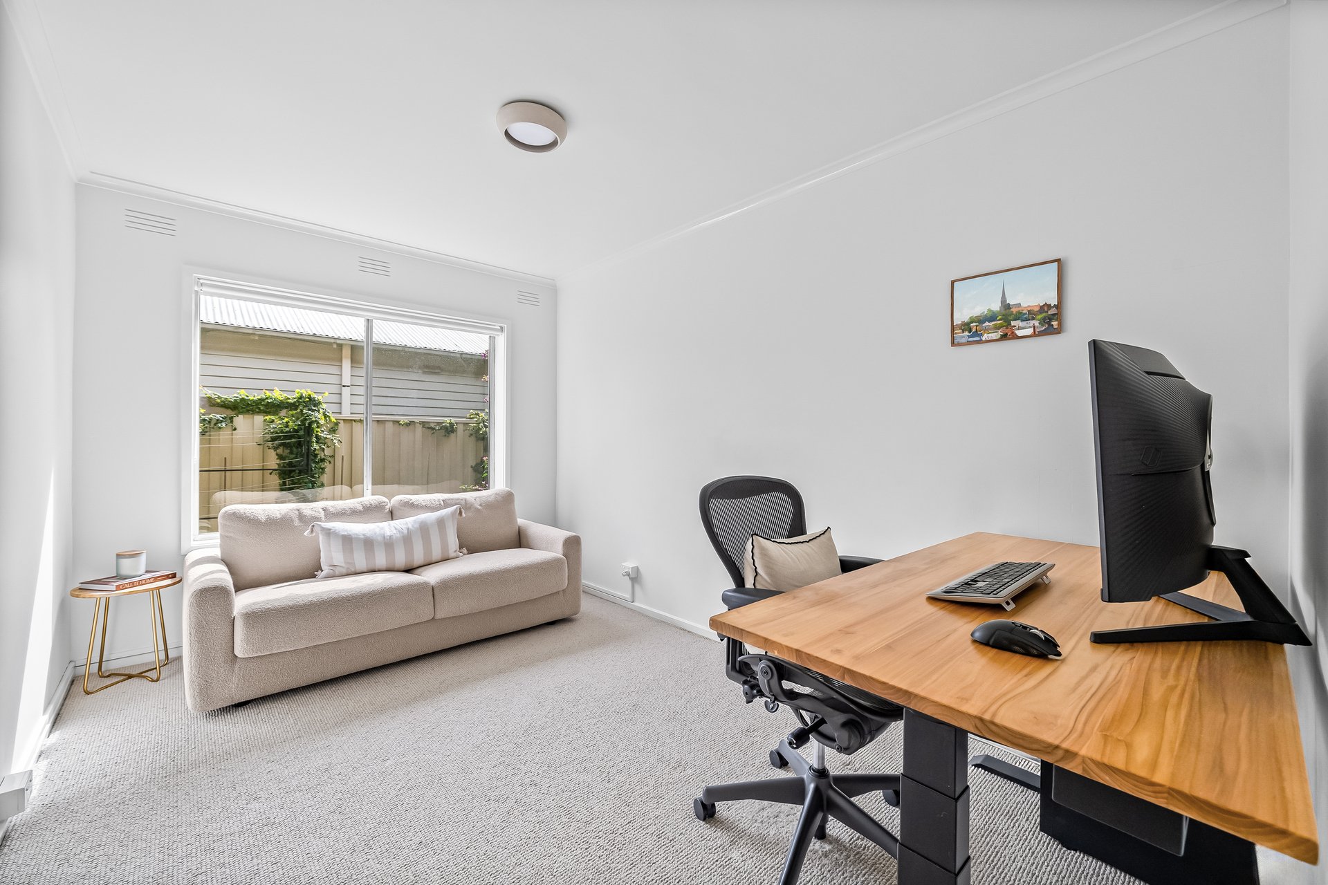 Inside, the sunlit open-plan living and dining area enjoys a prized north-facing aspect and flows seamlessly to a sleek island kitchen, superbly appointed with premium NEFF appliances, a walk-in pantry, and generous storage. Split-system heating and cooling provide year-round comfort.
