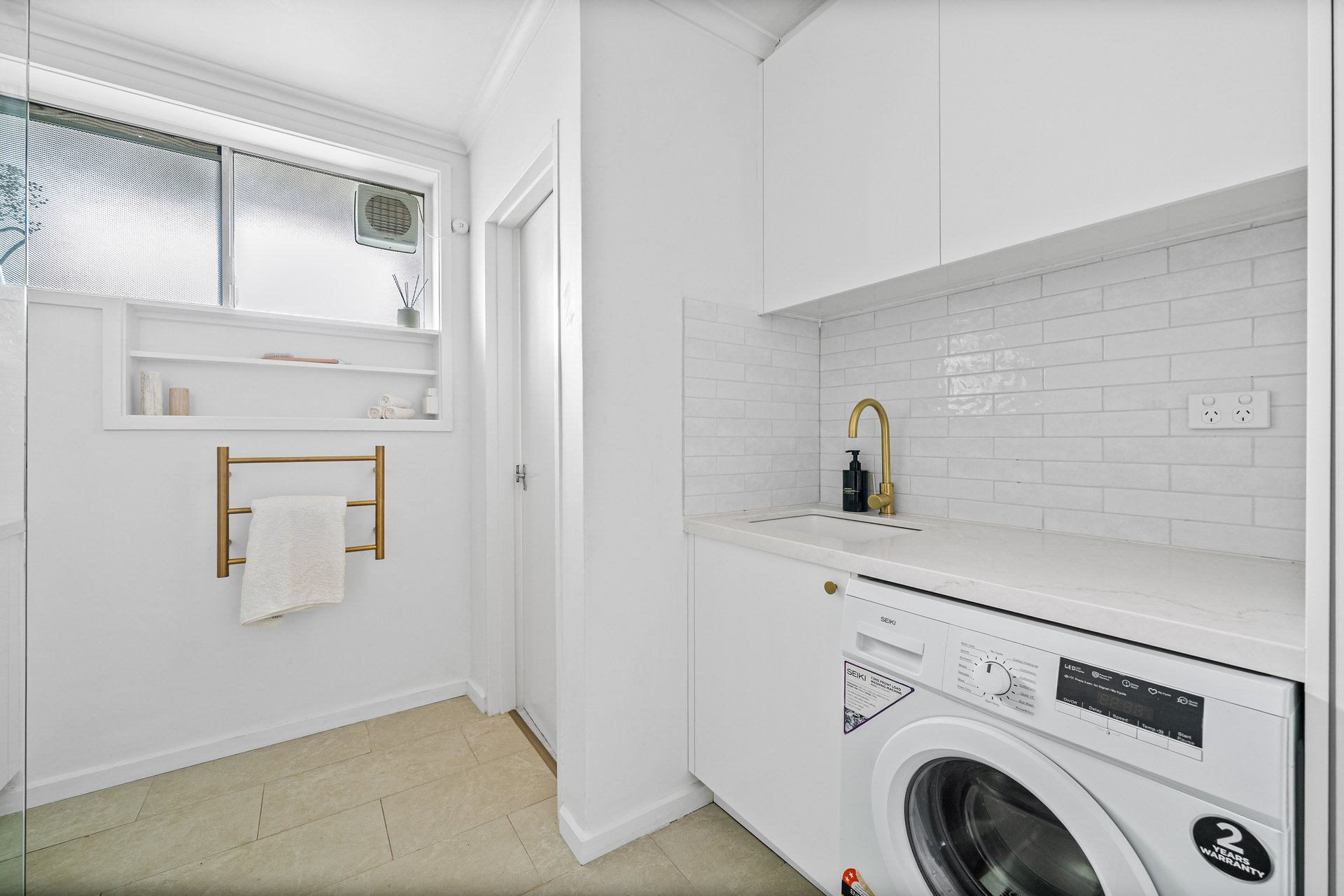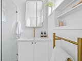 Both bedrooms are well-proportioned, with the spacious master offering built-in robes. A luxurious bathroom with golden finishes and an integrated laundry adds to the home’s refined style. Further enhancing the appeal are three separate entrances, fresh paintwork, new carpet and window furnishings, a storage shed, and two car spaces, including one securely positioned beside the apartment with a lockable gate, offering flexibility for alfresco use.