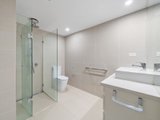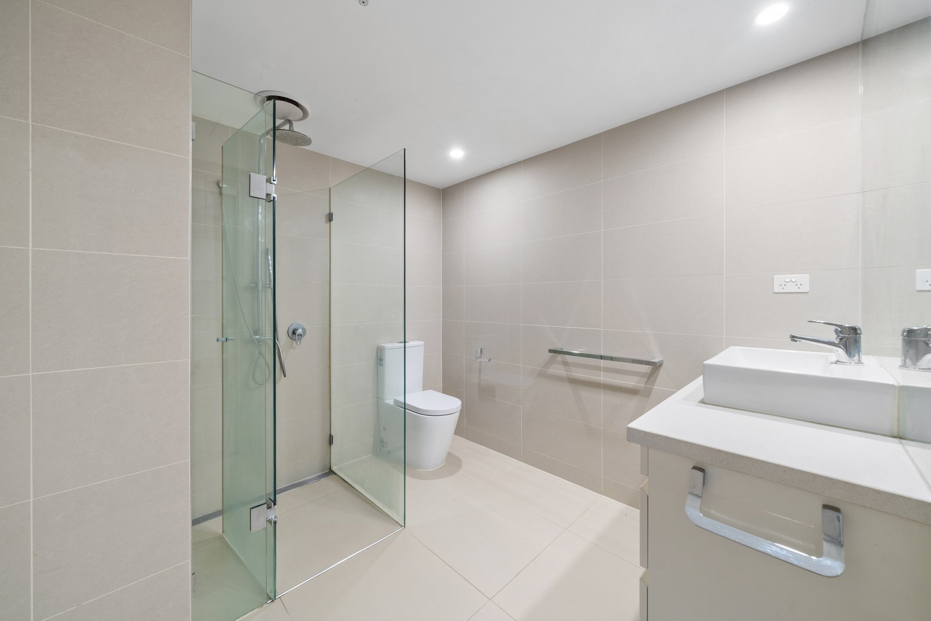 The generously sized bedroom features carpeted flooring and a built-in robe, offering ample storage space. The bathroom is beautifully finished with floor-to-ceiling tiling, a stone benchtop vanity, and a frameless glass shower with a rainfall showerhead and hand-held shower.