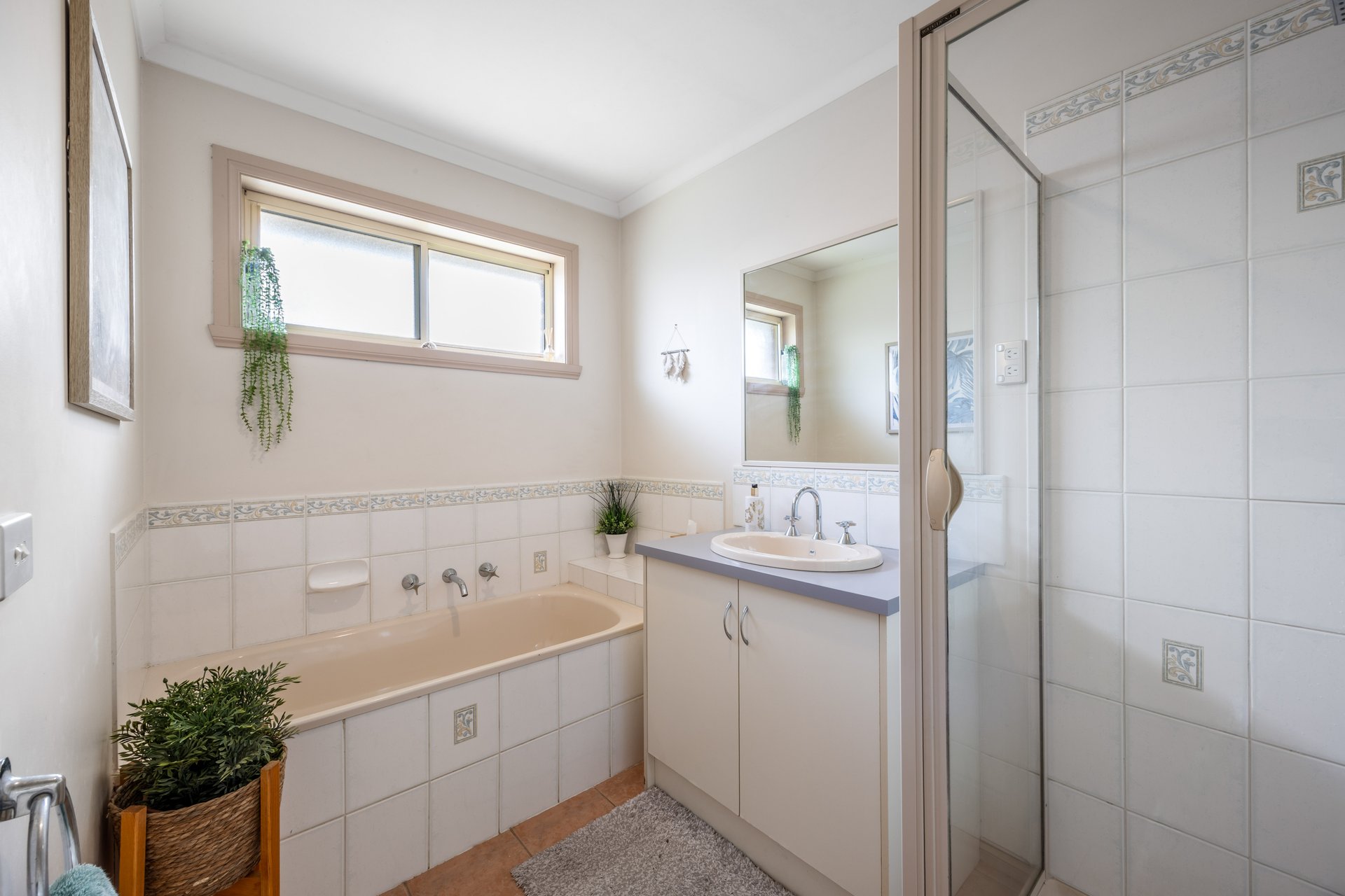- Central bathroom with separate bath and shower
