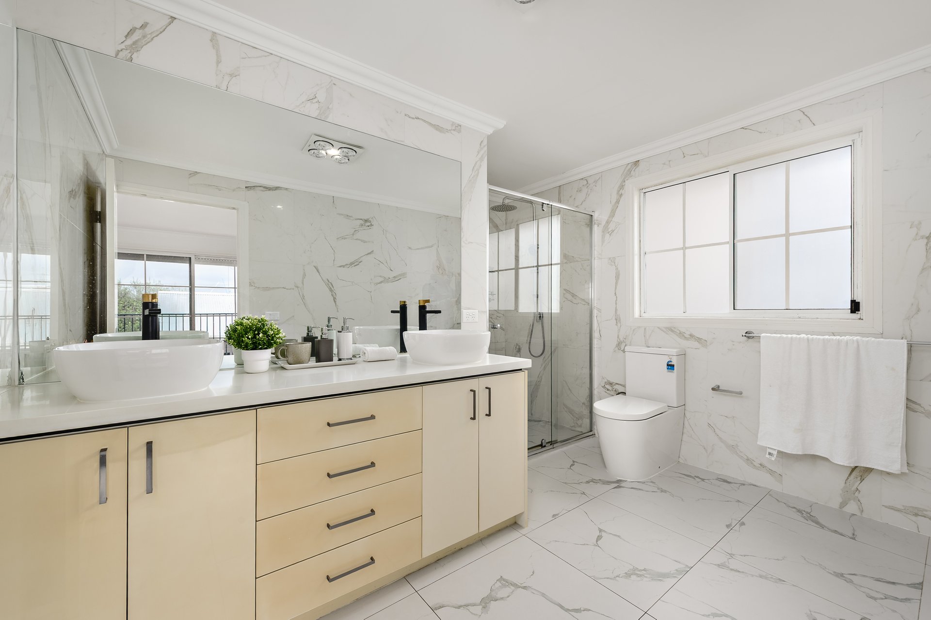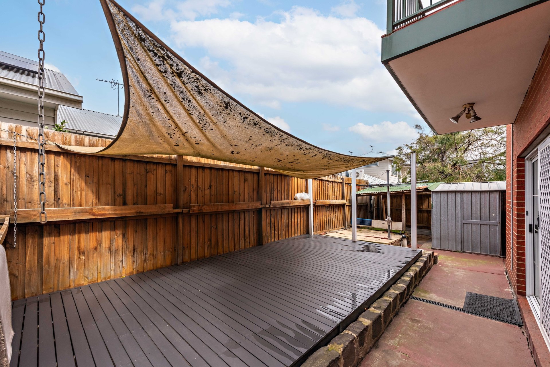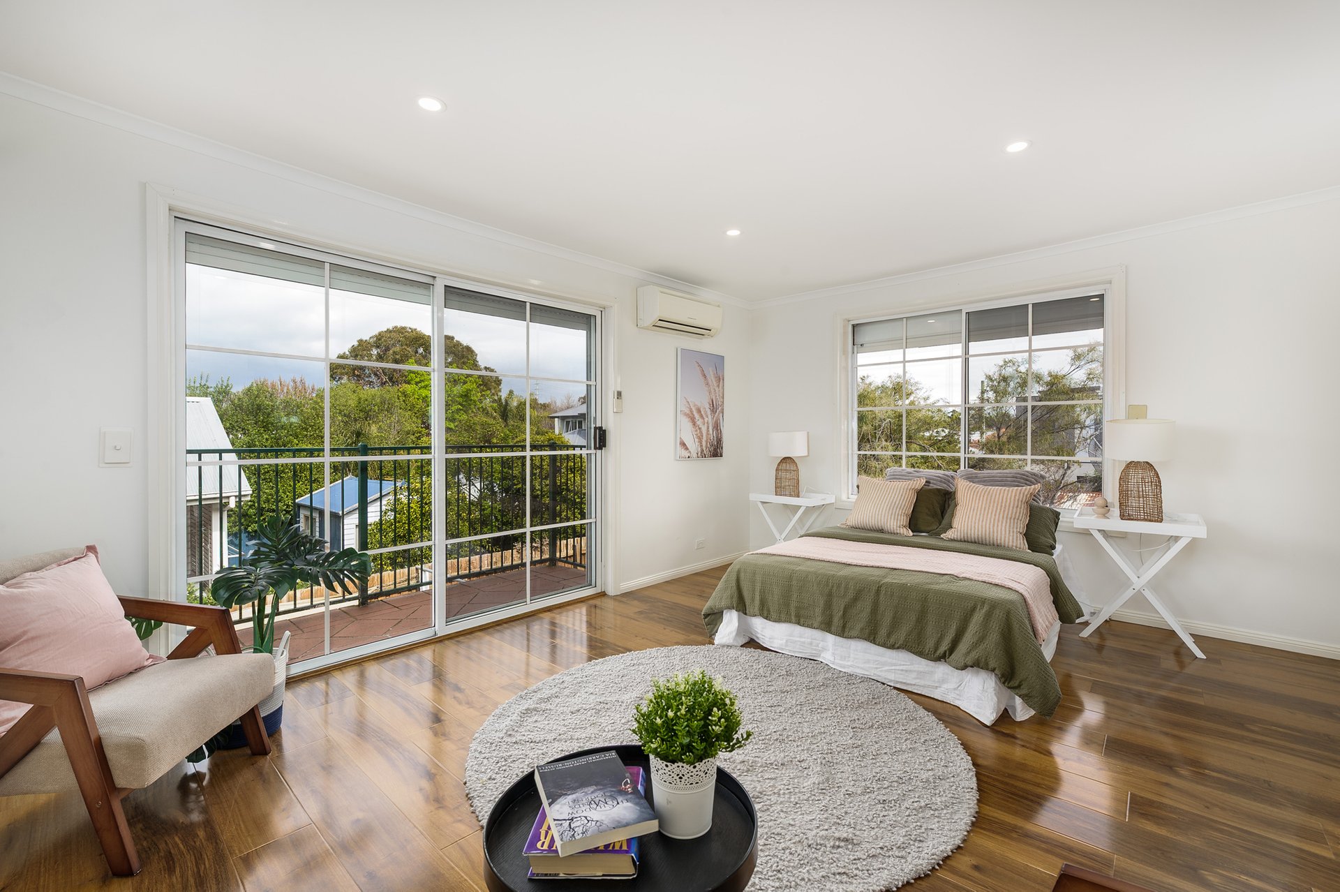 Three well-appointed bathrooms, including a private ensuite to the main bedroom, ensure comfort for all. The main suite is further enhanced by walk-in robes and access to a generous balcony. Upstairs, a sun-drenched terrace provides an additional retreat, while outdoors a private deck creates the perfect setting for entertaining.