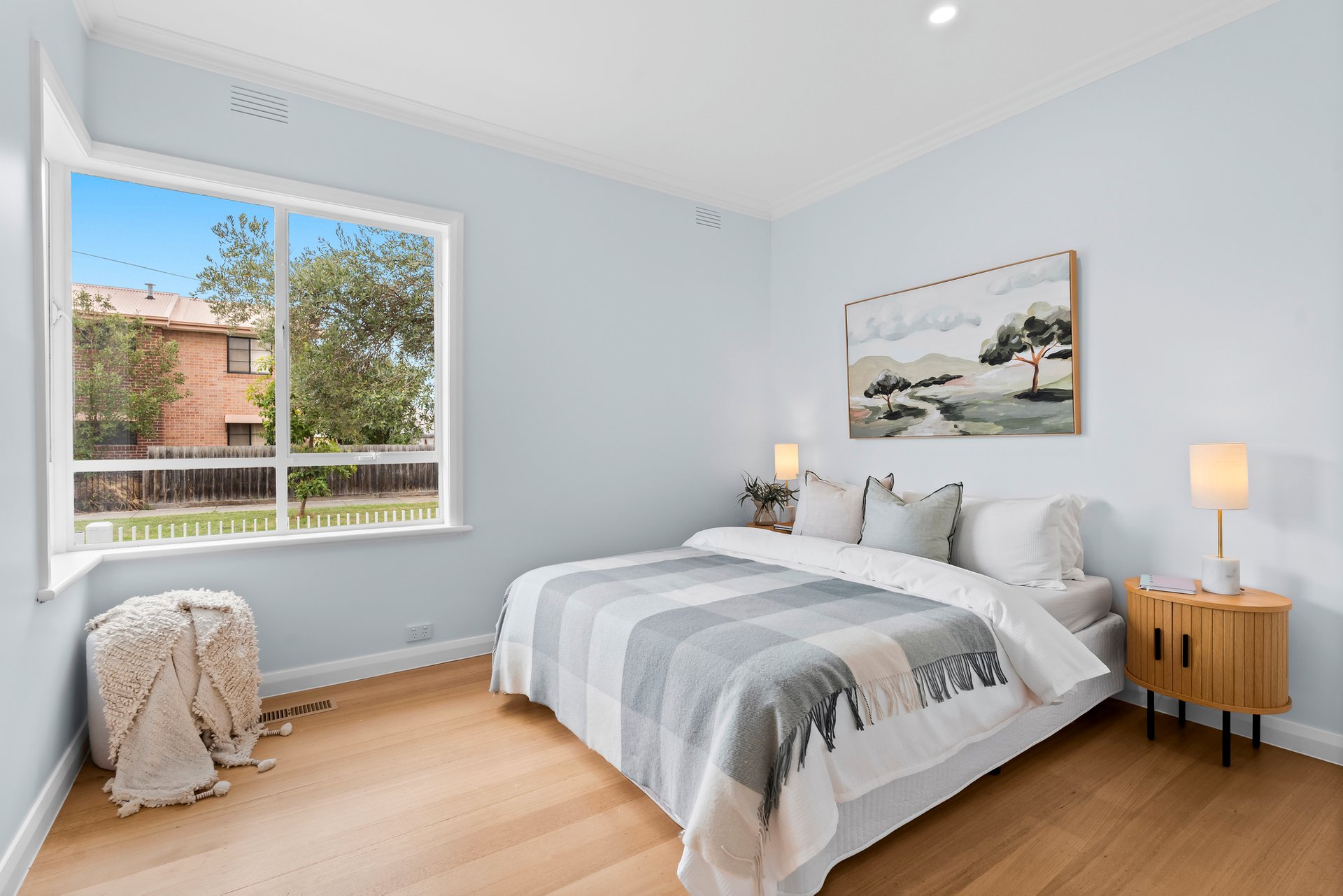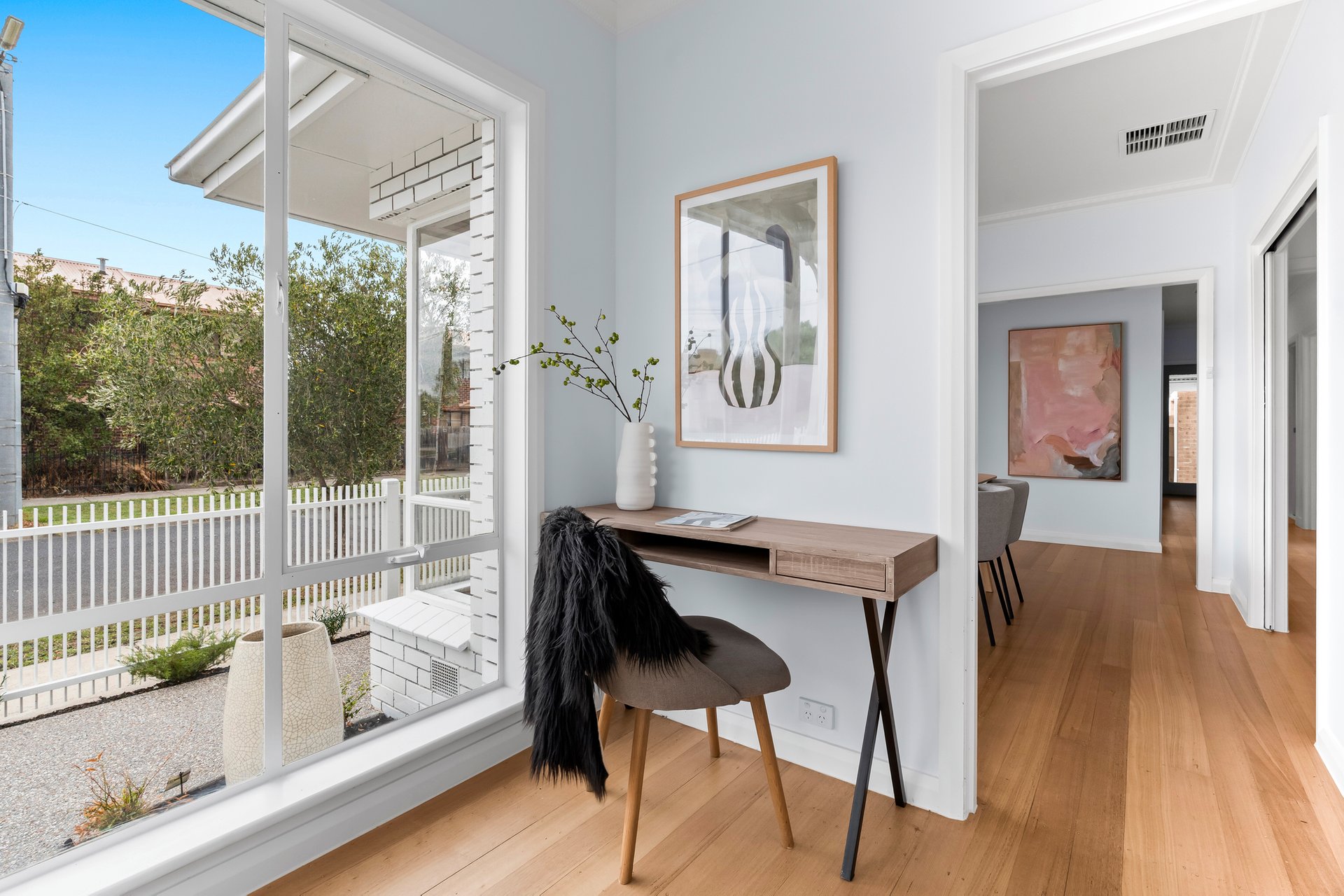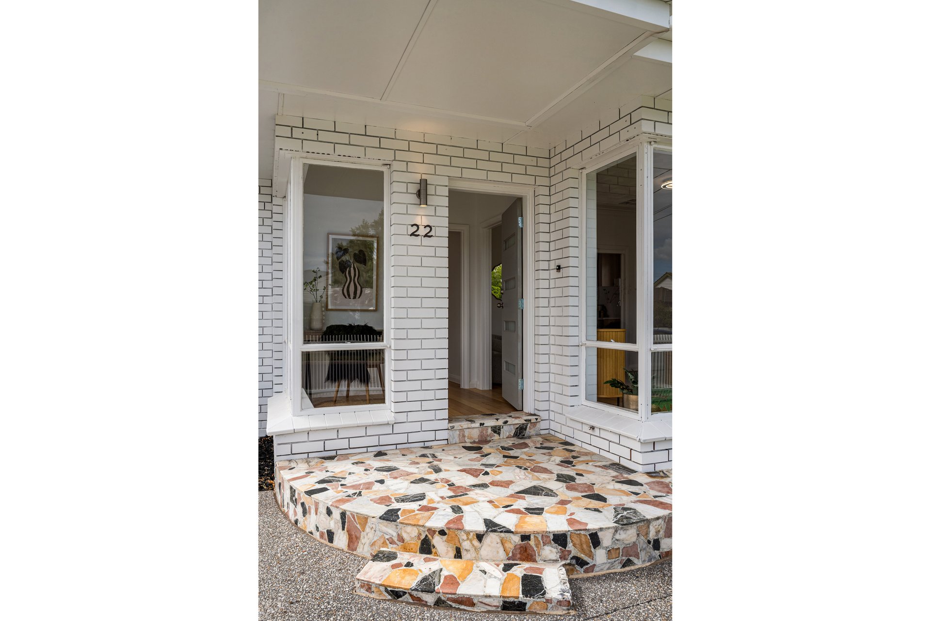The home presents a charming white painted brick façade that blends classic bungalow character with fresh contemporary updates. A welcoming covered front porch with decorative timber posts and distinctive terrazzo style tiling creates a warm and inviting entry, while the crisp white picket fence enhances the home’s timeless street presence.