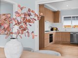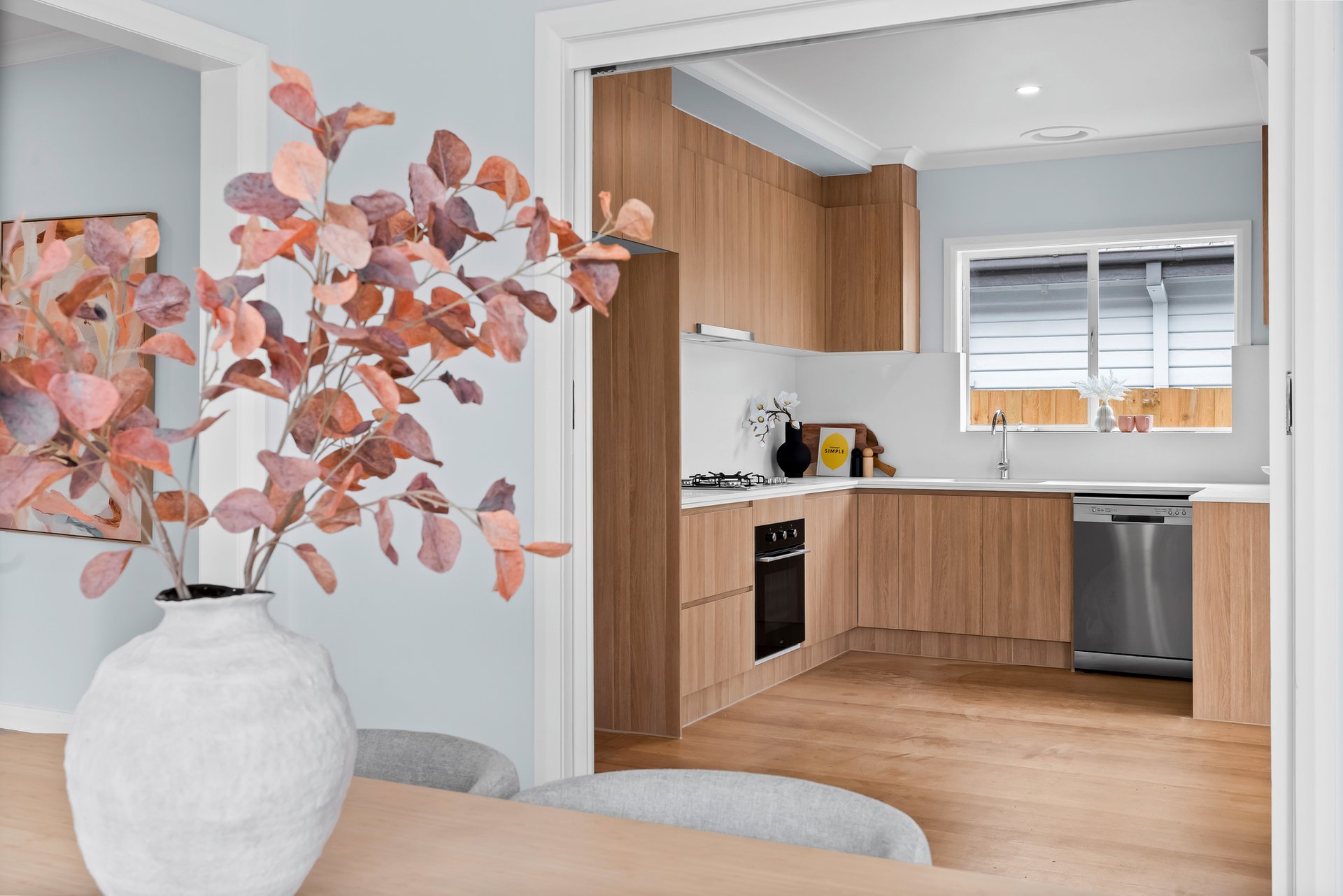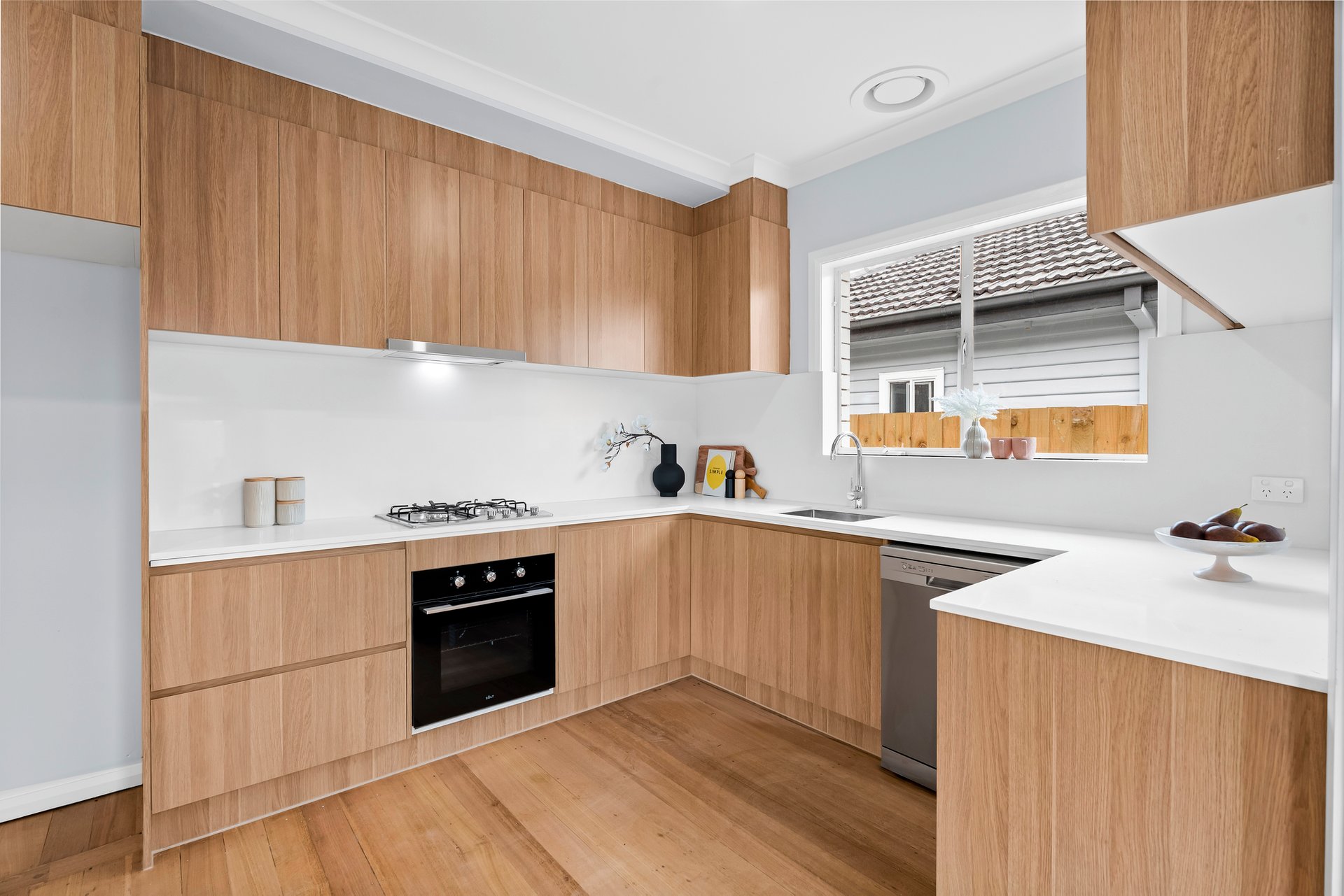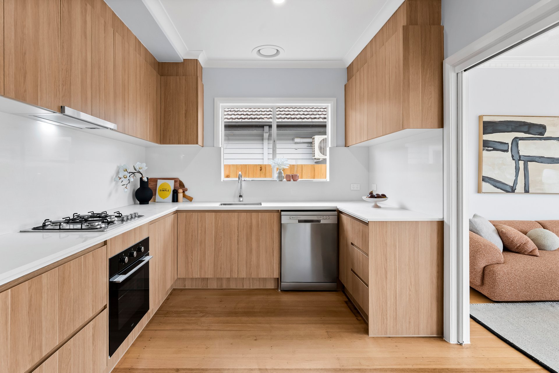 The modern kitchen is thoughtfully designed with white stone benchtops, oak wooden cabinetry and a white glass splashback. Premium appliances include a Solt four burner gas cooktop, electric oven and dishwasher. The kitchen also offers space for a round meals table, creating a casual dining area perfect for everyday living.