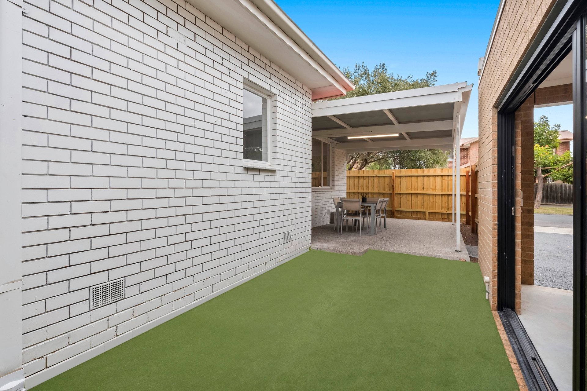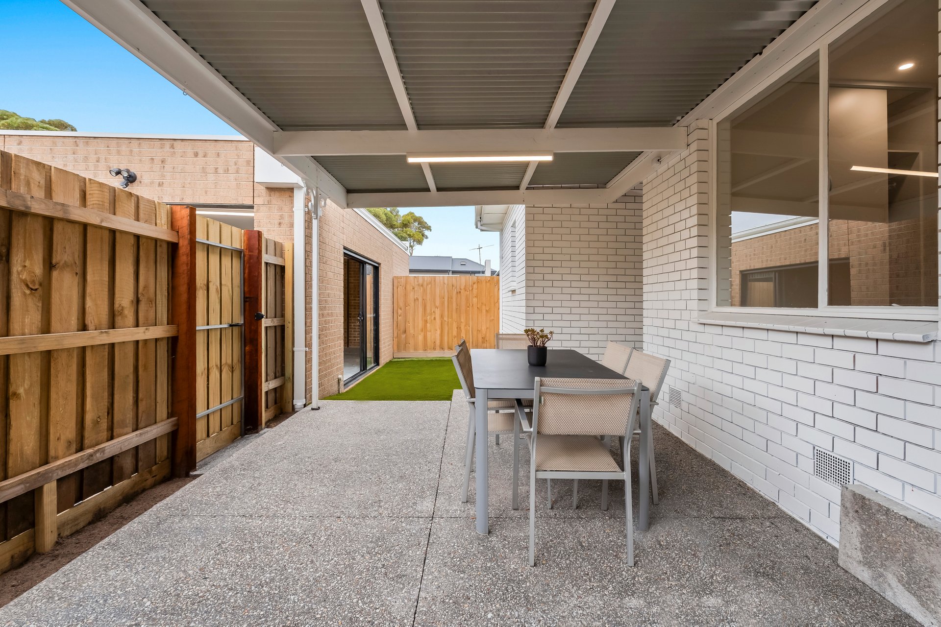 Step outside to a covered pergola entertaining area that flows onto a small artificial grass space, creating a relaxed outdoor setting ideal for gatherings with family and friends. The gardens are designed for low maintenance living while still offering an inviting outdoor environment.