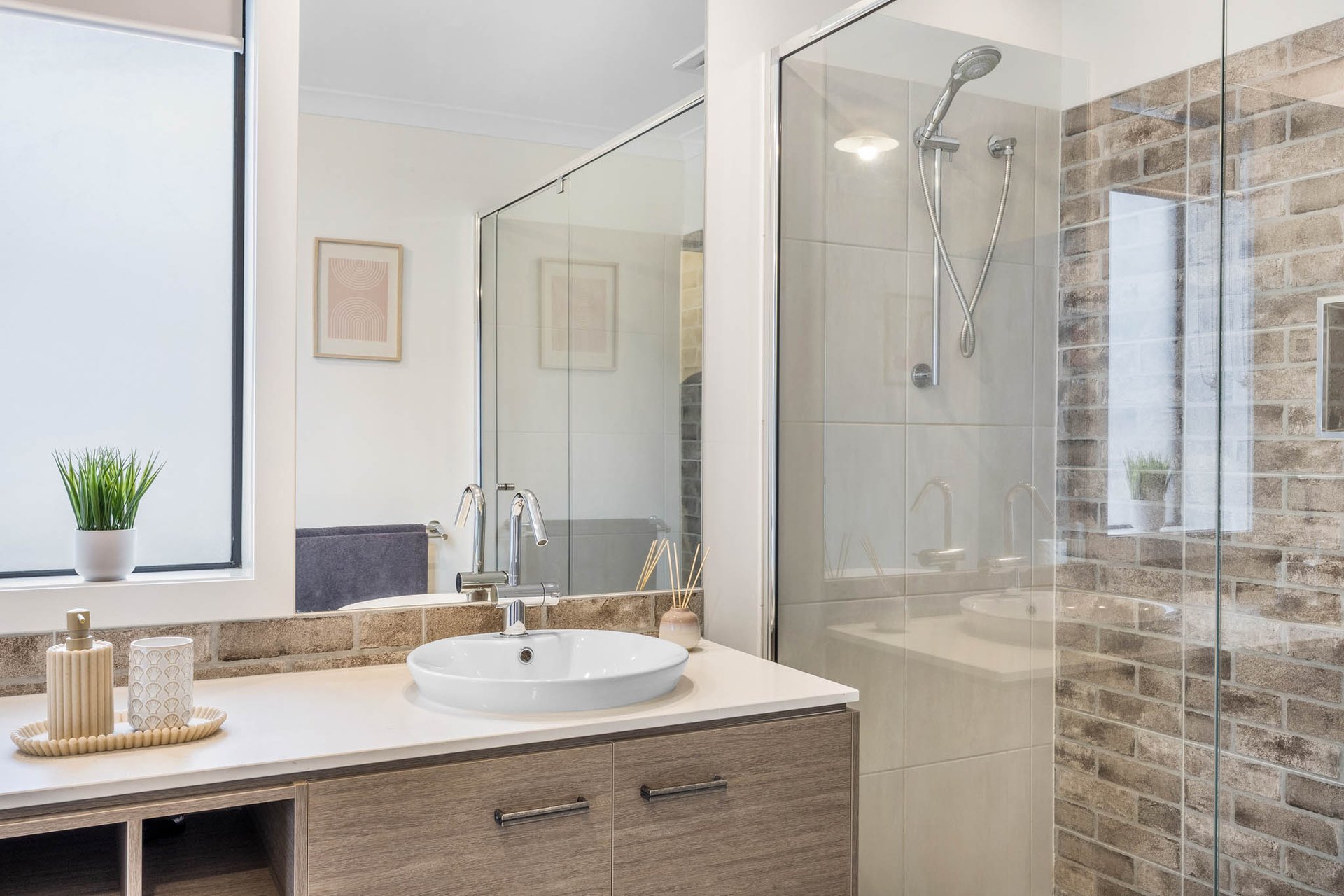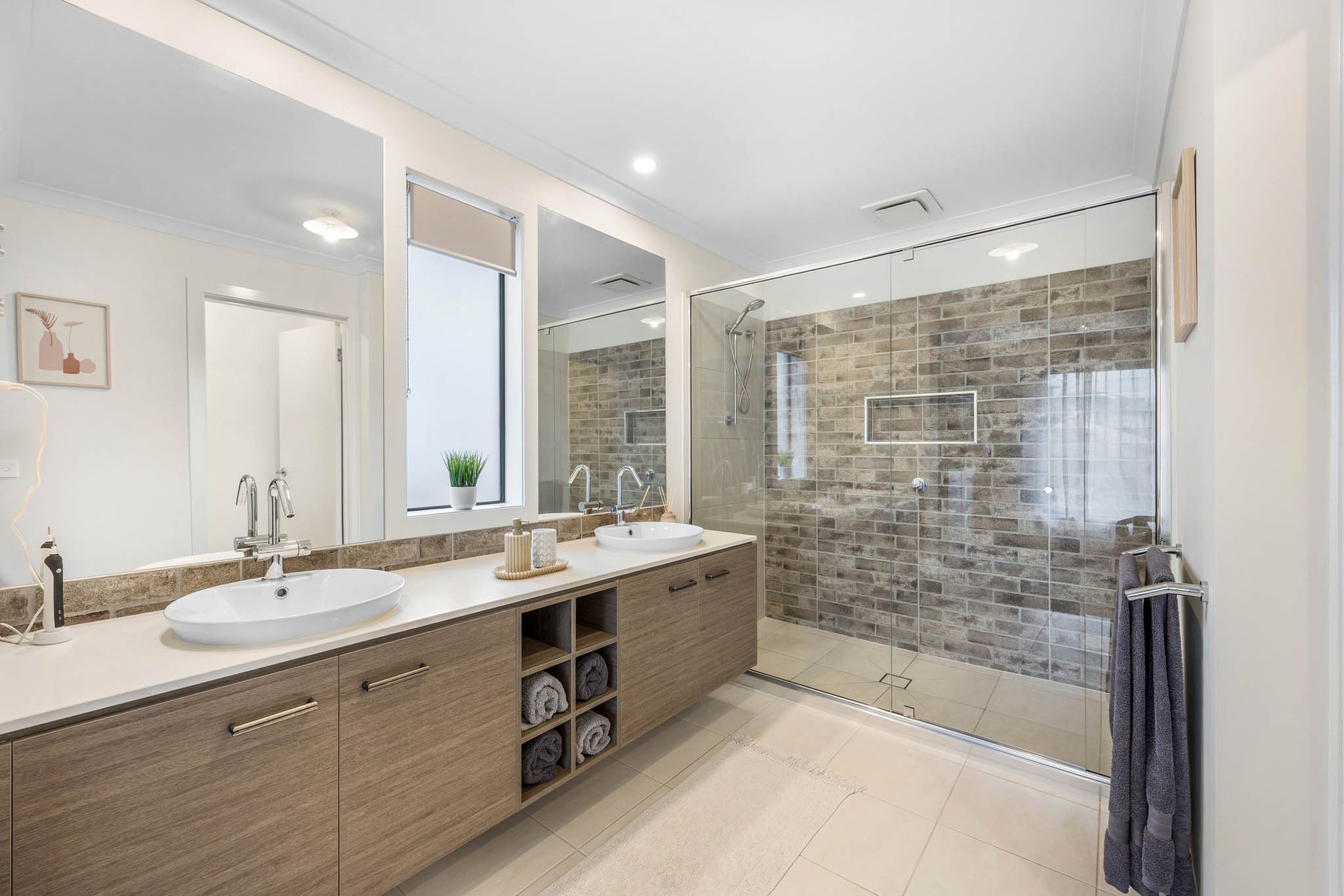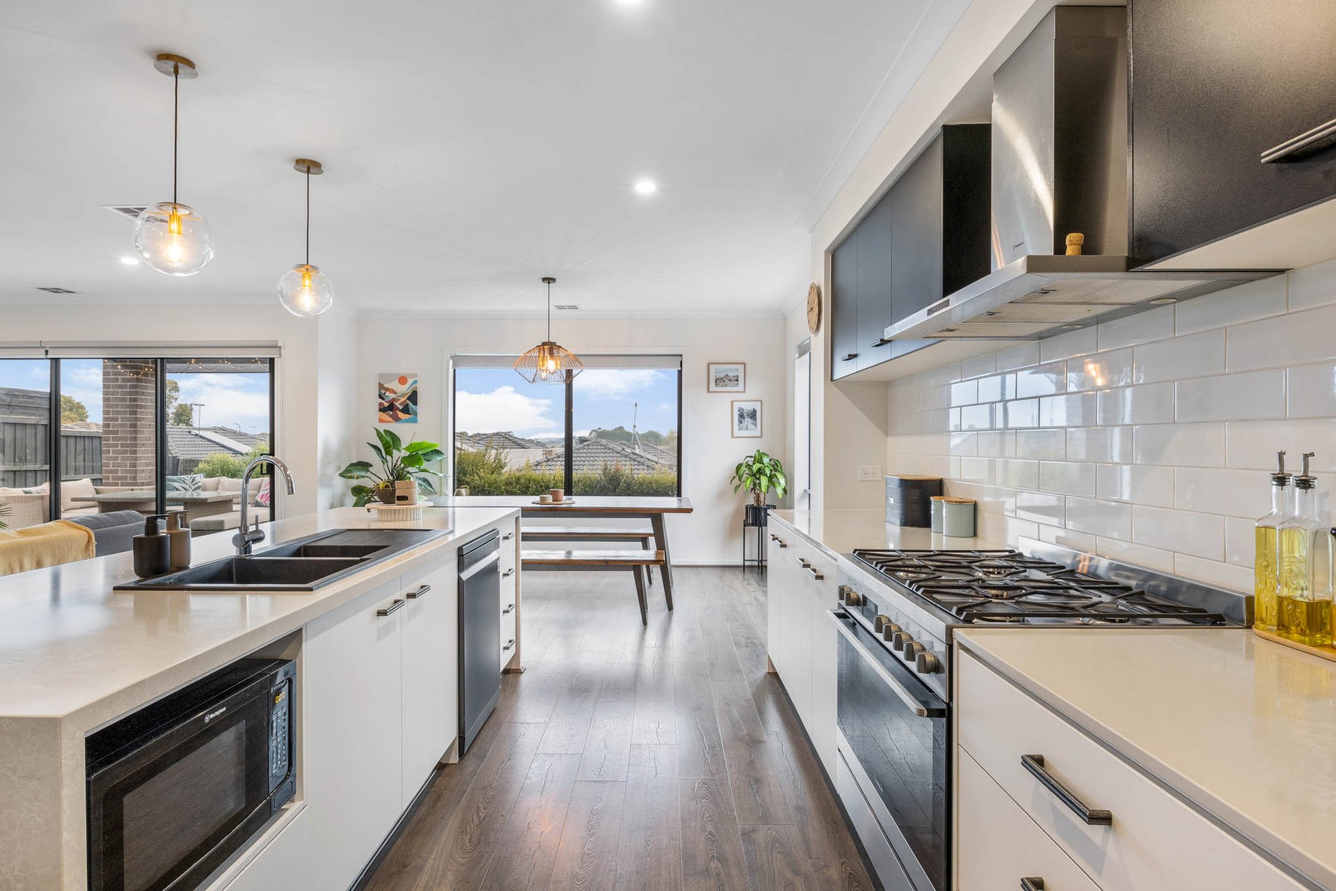 Here, the kitchen impresses with stone benchtops, soft-close drawers, a statement charcoal double sink, contemporary pendant lighting, and a large walk-in pantry. Westinghouse 900mm cooking appliances and an LG dishwasher complete the picture of modern convenience.