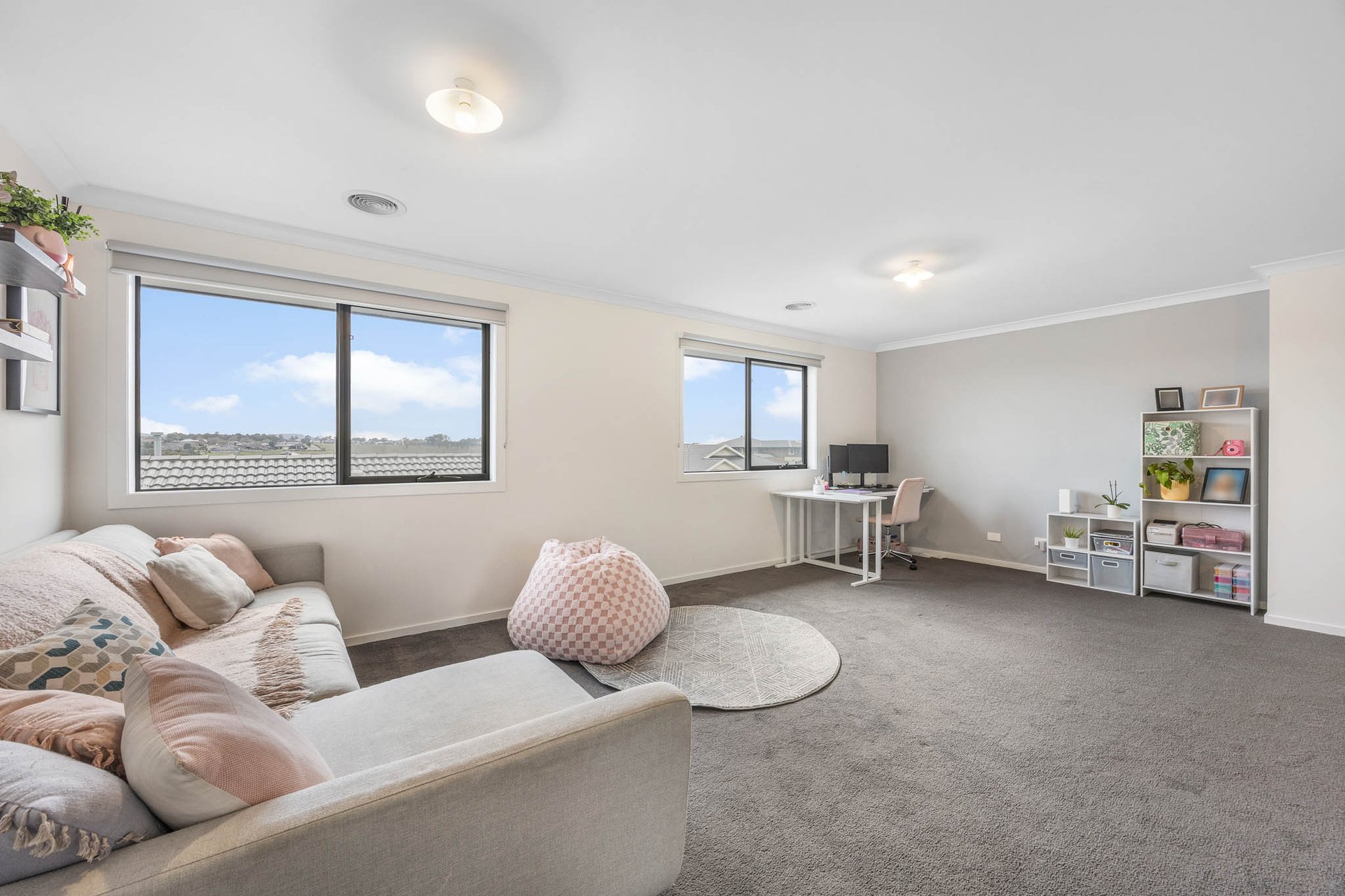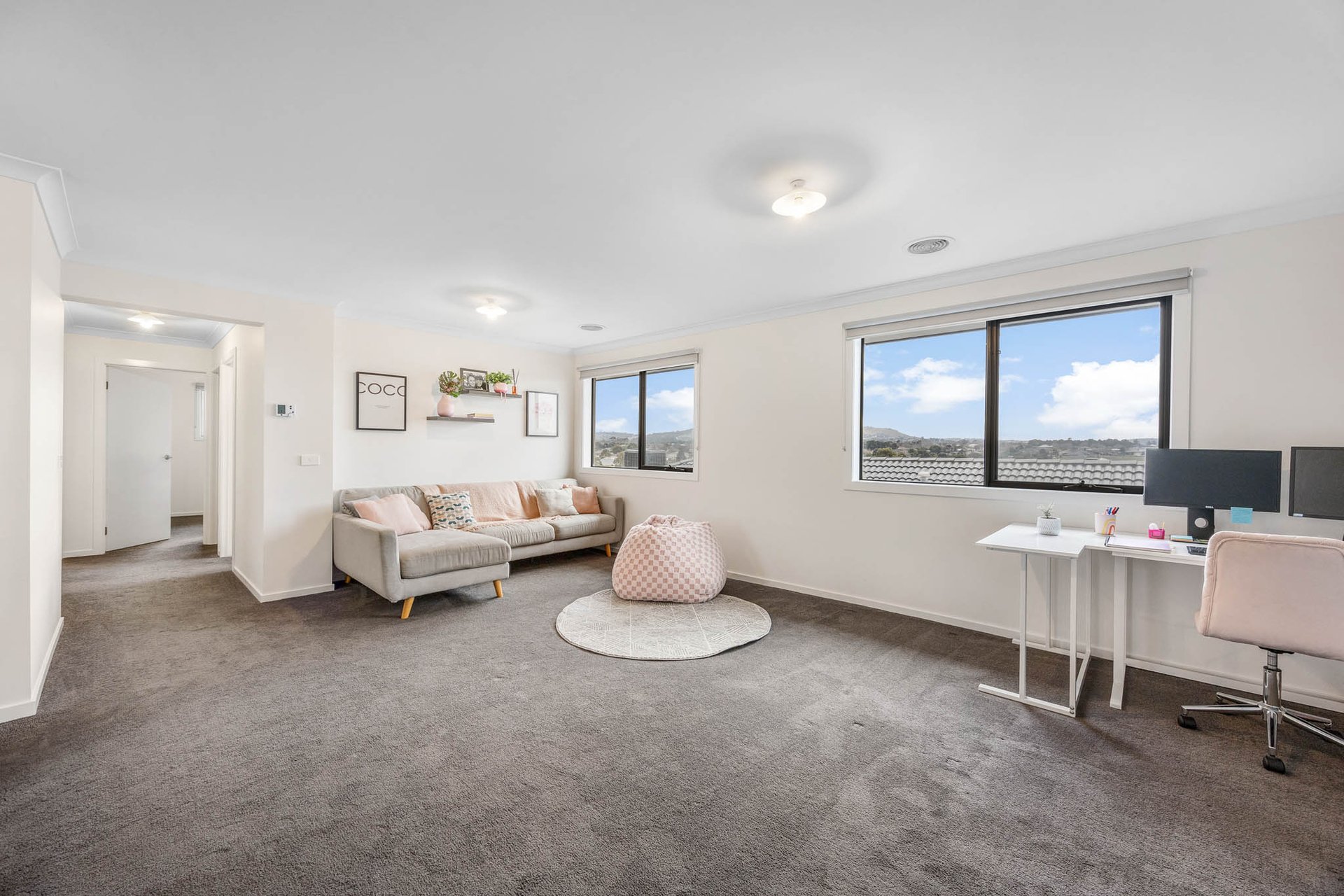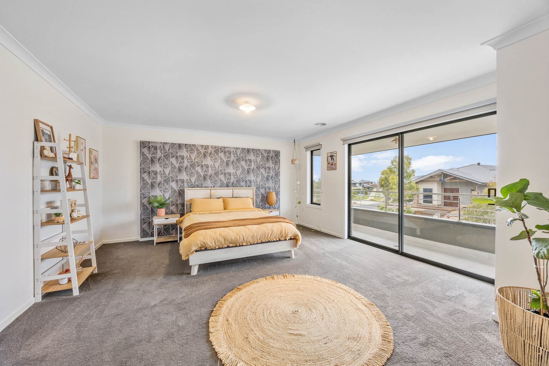 Upstairs, a carpeted retreat/3rd living zone offers sweeping district views across Sunbury. The main bedroom is generously scaled, with a private balcony, a huge walk-in robe, and a beautifully appointed ensuite featuring large-format floor tiles, a twin stone vanity, and oversized niched shower. Three further bedrooms, each with walk-in robes, are serviced by a central bathroom with a full bath, stone vanity, and shower.