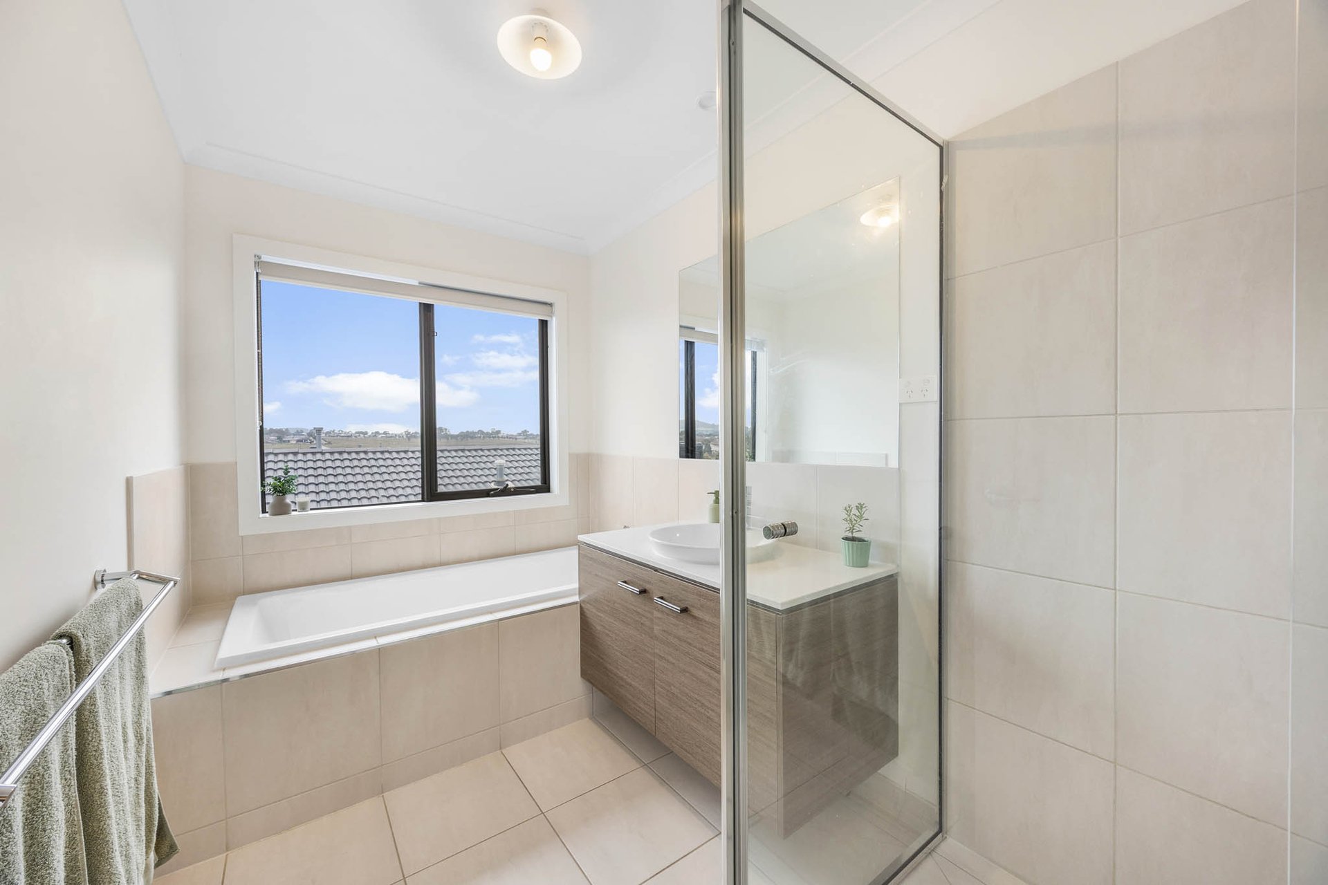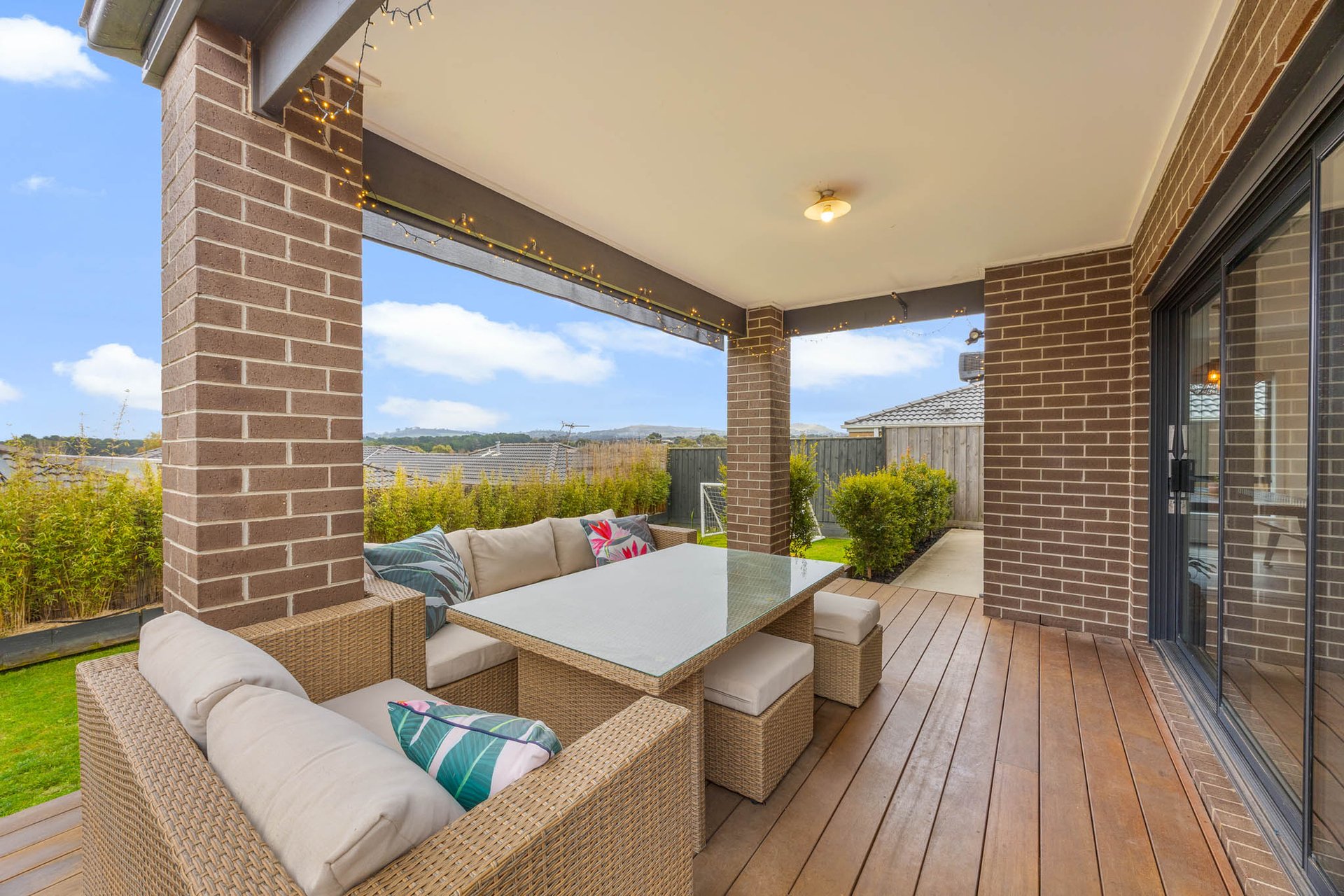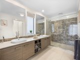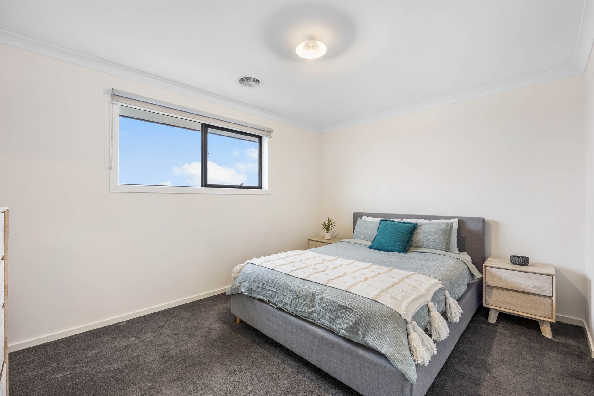 Upstairs, a carpeted retreat/3rd living zone offers sweeping district views across Sunbury. The main bedroom is generously scaled, with a private balcony, a huge walk-in robe, and a beautifully appointed ensuite featuring large-format floor tiles, a twin stone vanity, and oversized niched shower. Three further bedrooms, each with walk-in robes, are serviced by a central bathroom with a full bath, stone vanity, and shower.