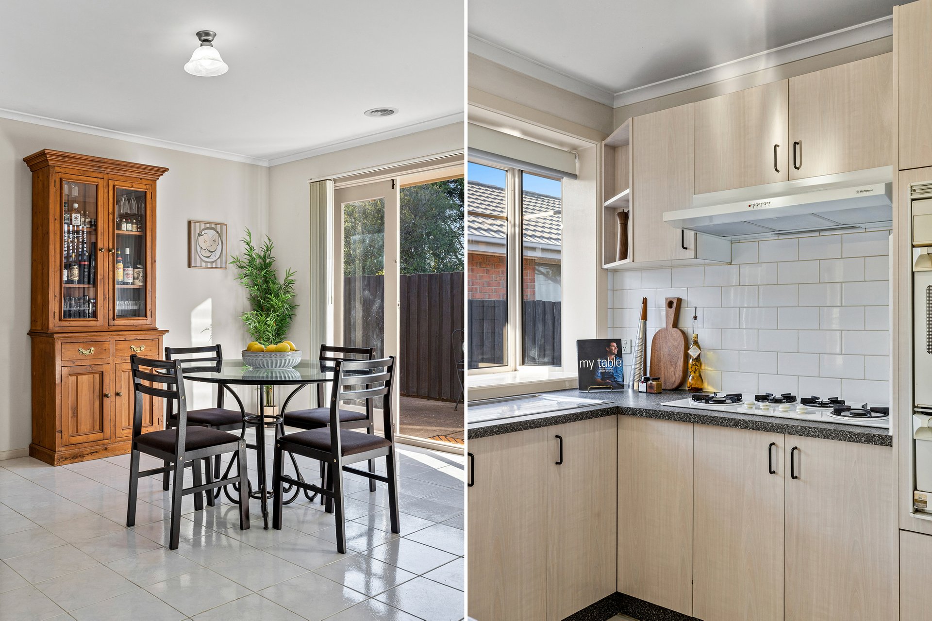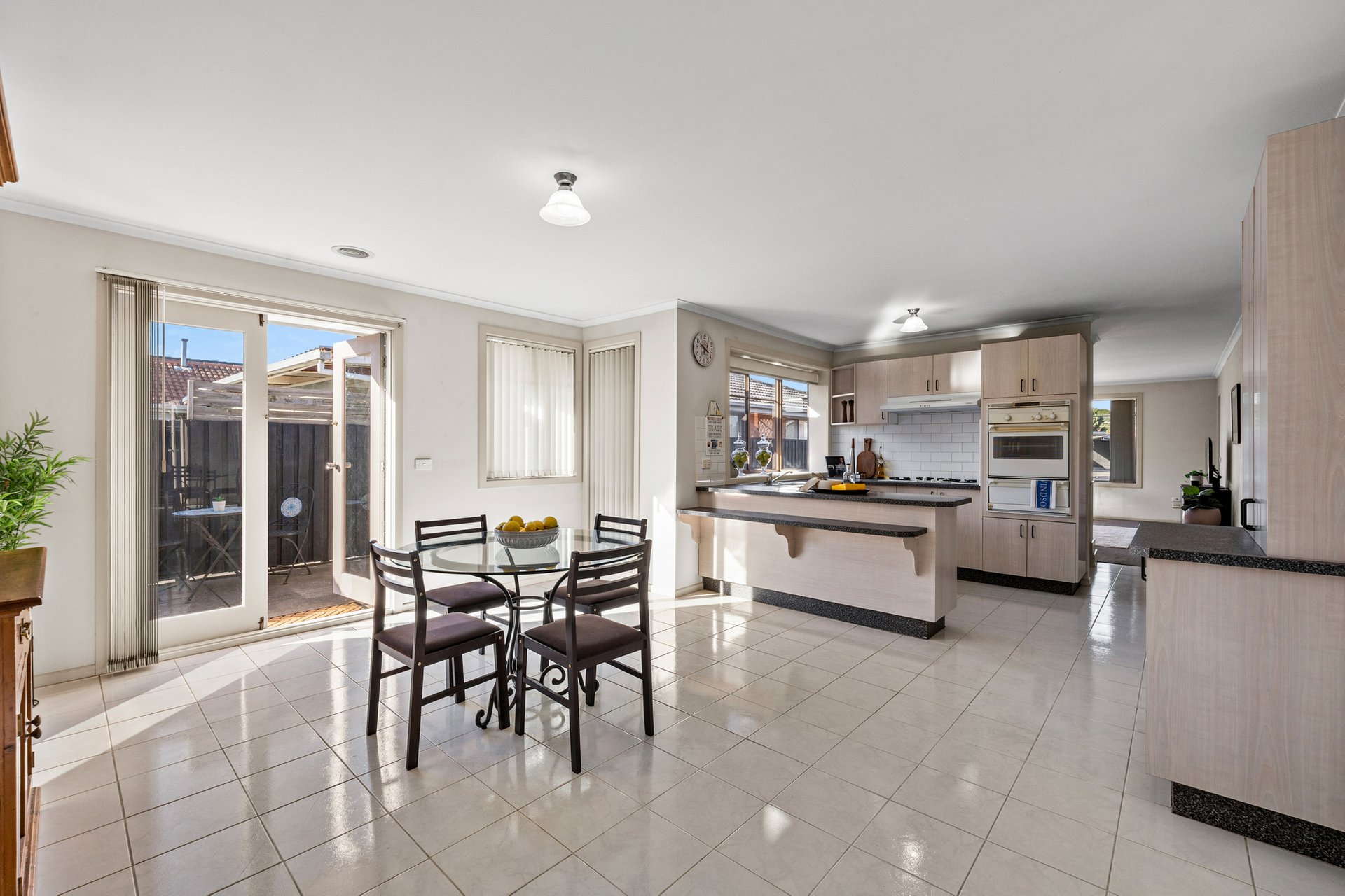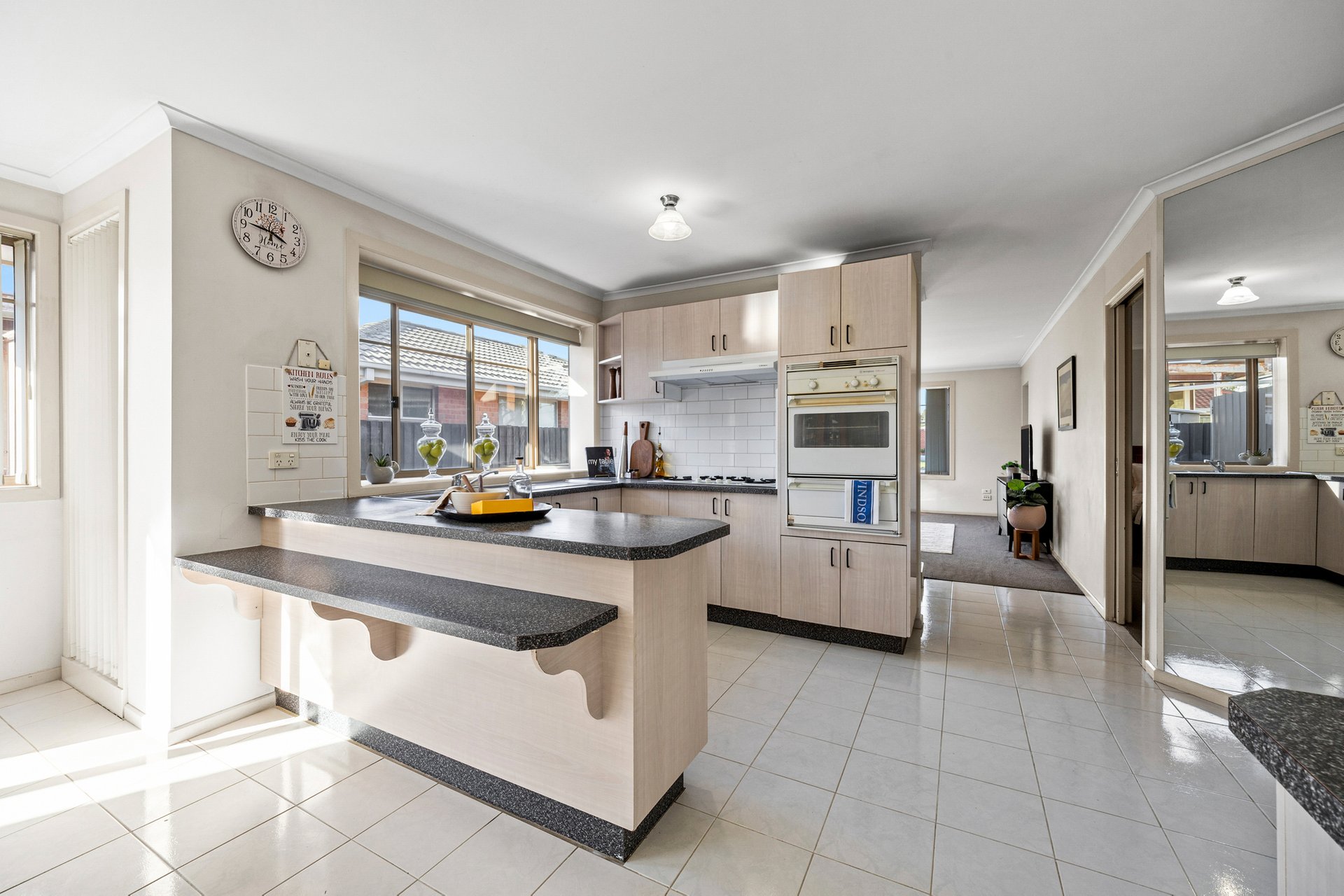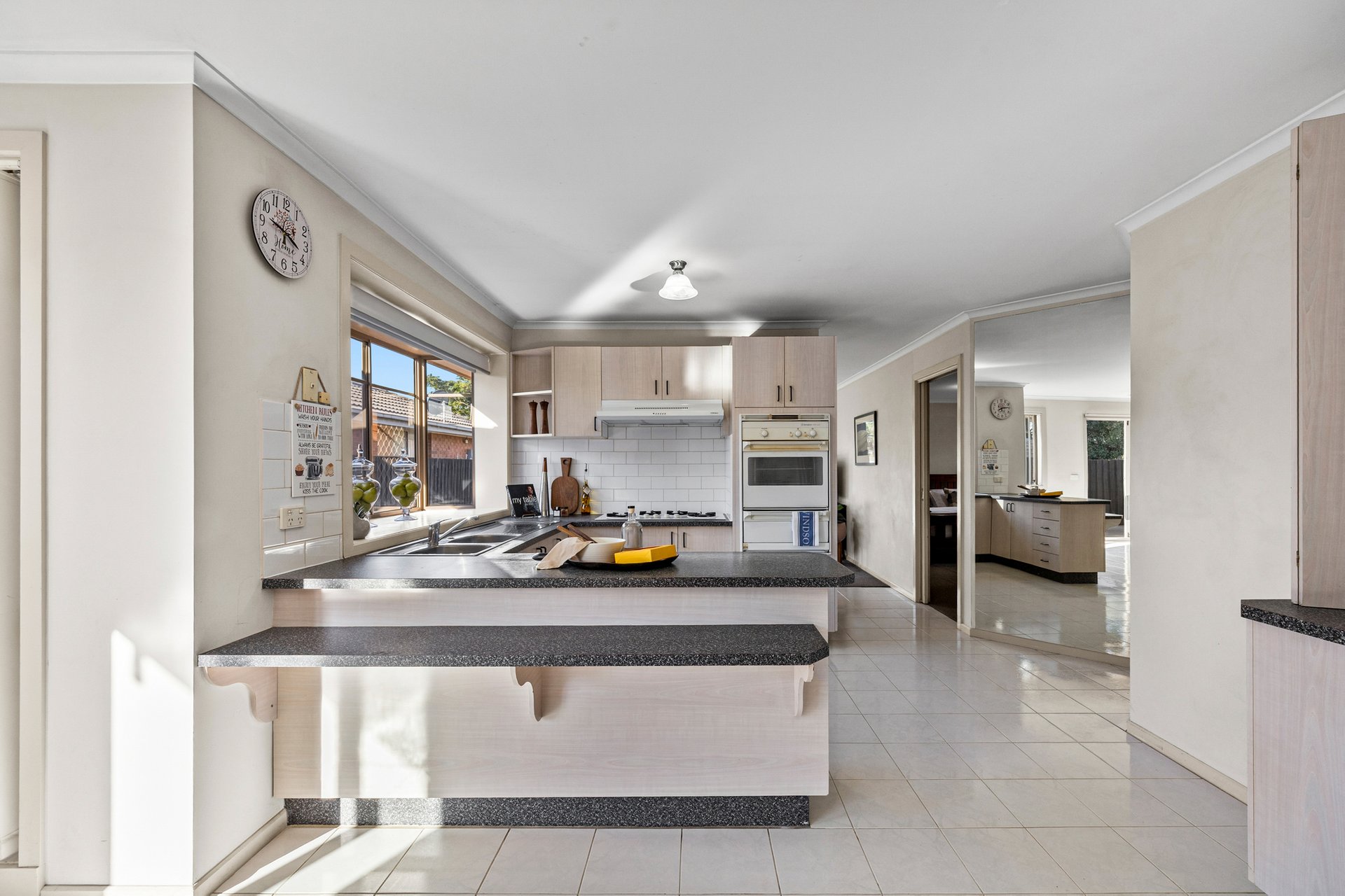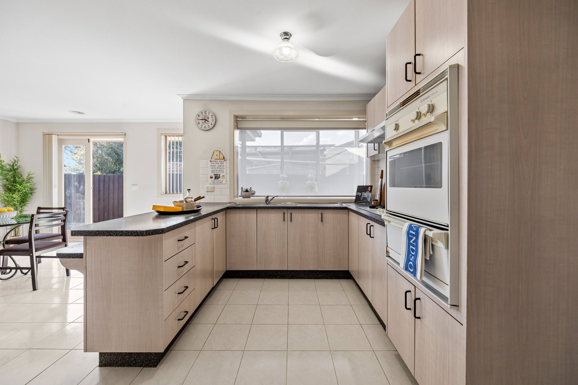At the heart of the home, the open-plan kitchen and dining zone offers a functional and spacious setting for family living. The well-kept kitchen features original Westinghouse appliances, including a gas cooktop, gas oven with separate grill, double sink and ample bench space. Laminate speckled benchtops, a tiled splashback and light oak cabinetry are complemented by a large window that fills the space with natural light.