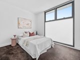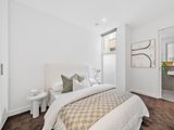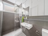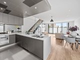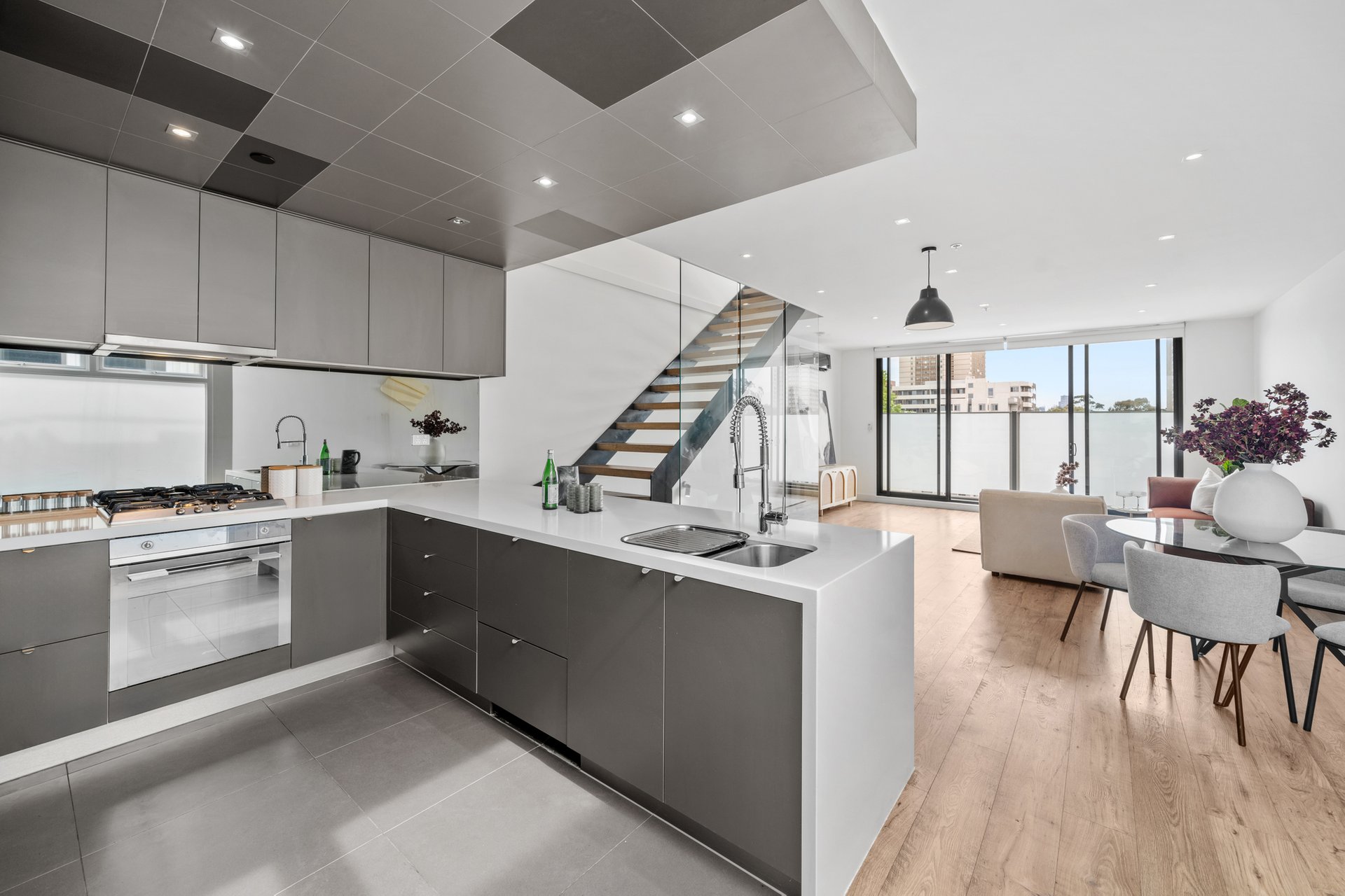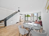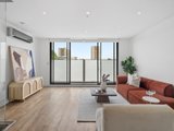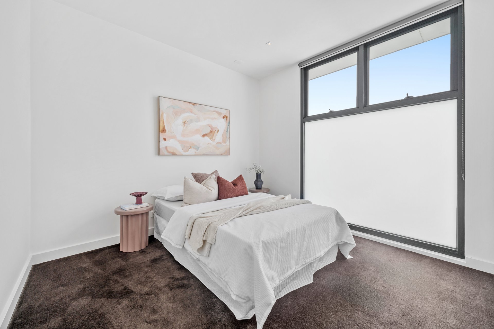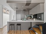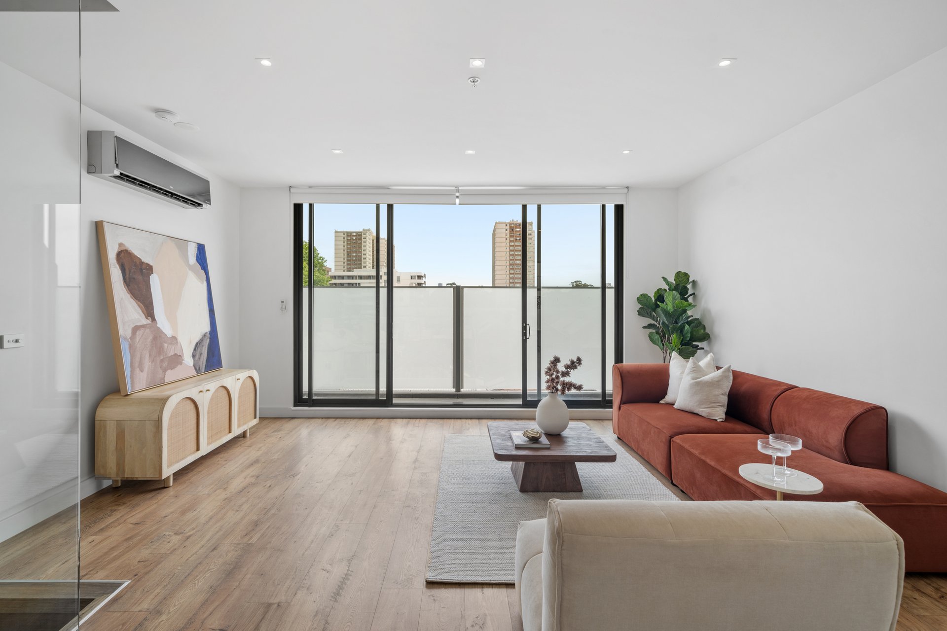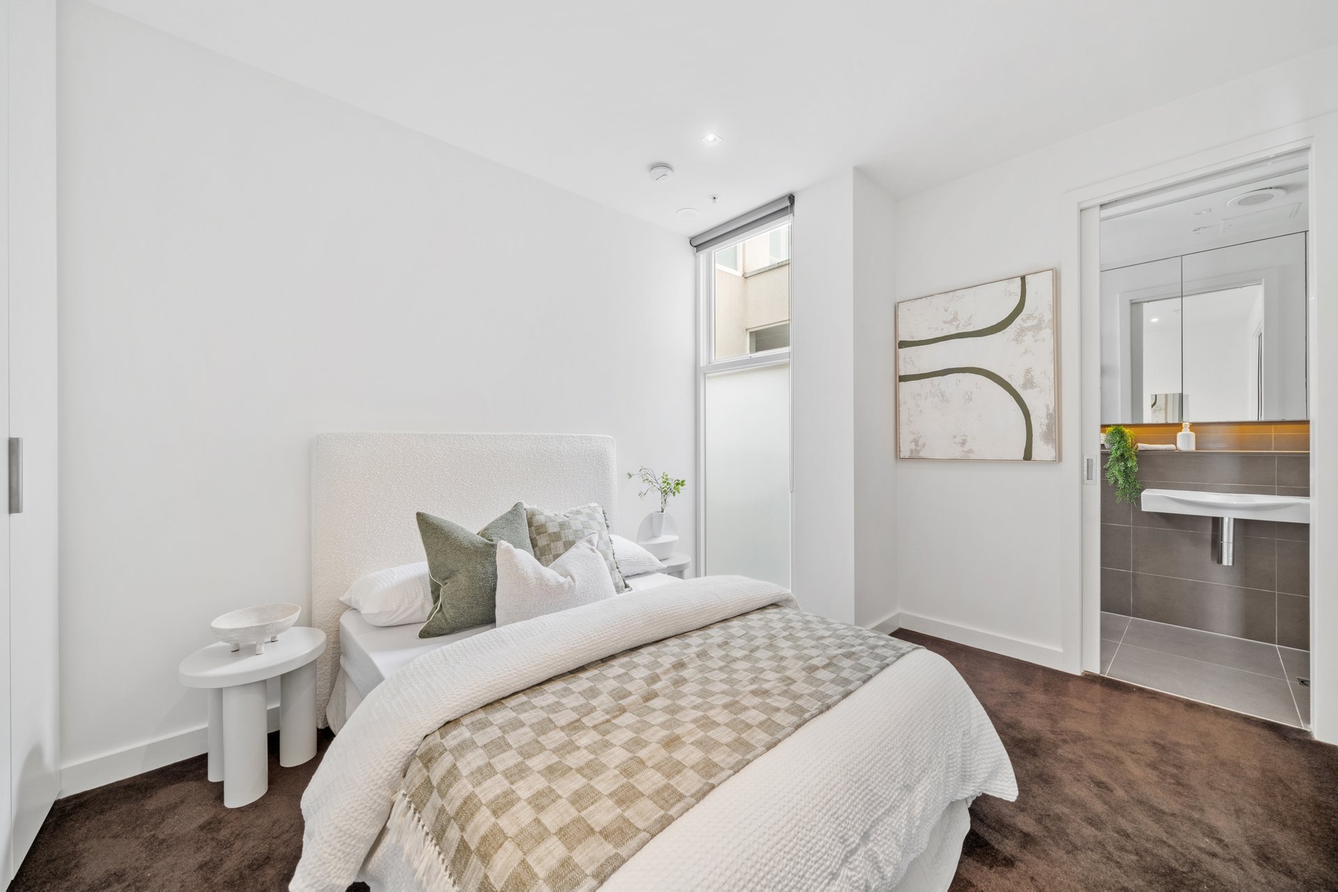 The spacious open-plan living and dining area is filled with natural light and flows to a private balcony through floor-to-ceiling sliders. Timber flooring creates a clean, modern feel and split-system heating and cooling ensures year-round comfort. The adjoining kitchen features stone benchtops, a breakfast bar, sleek cabinetry, a gas cooktop, electric oven, integrated dishwasher and a mirrored splashback.