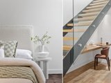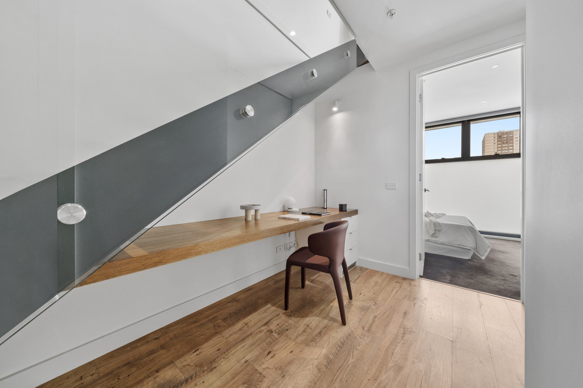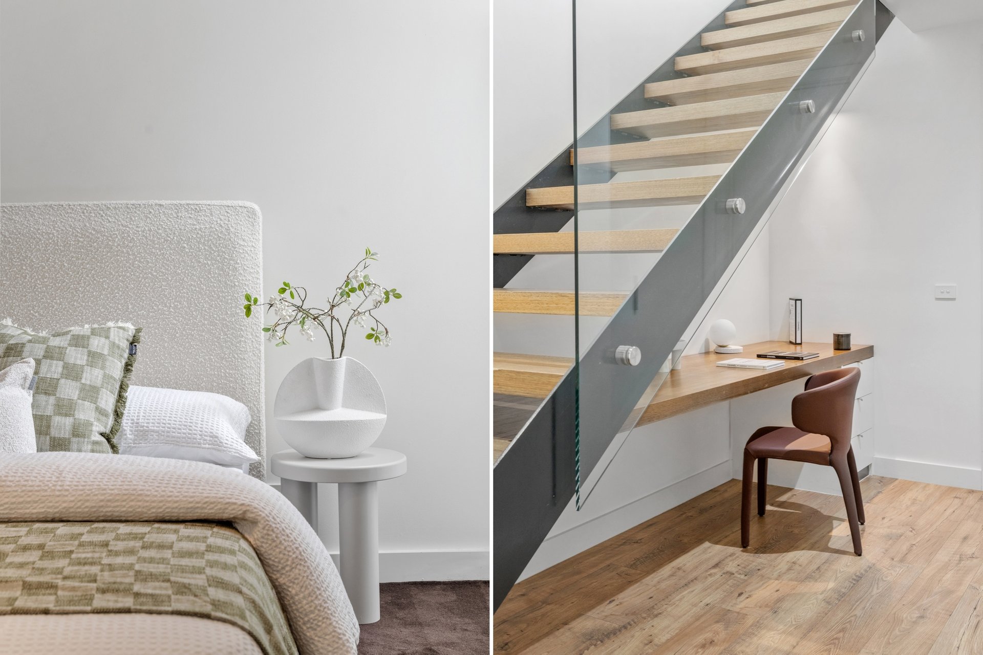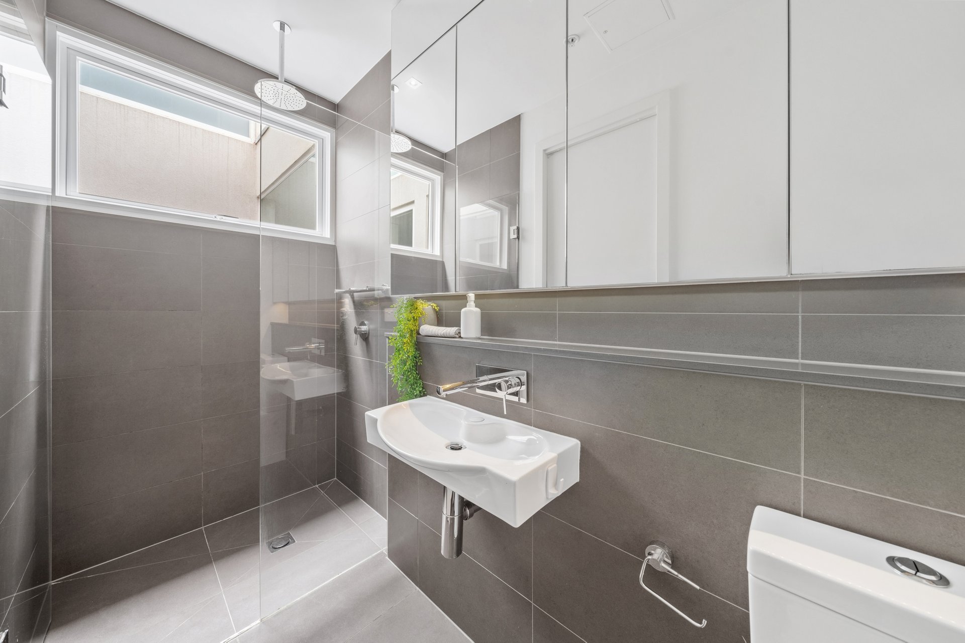 Both bedrooms are located on the lower level, each with built-in robes, plush carpets and large windows. Two fully tiled contemporary bathrooms include walk-in showers, wall-hung vanities and stylish modern finishes. A dedicated work-from-home zone with a built-in desk and overhead lighting is conveniently placed between the bedrooms.