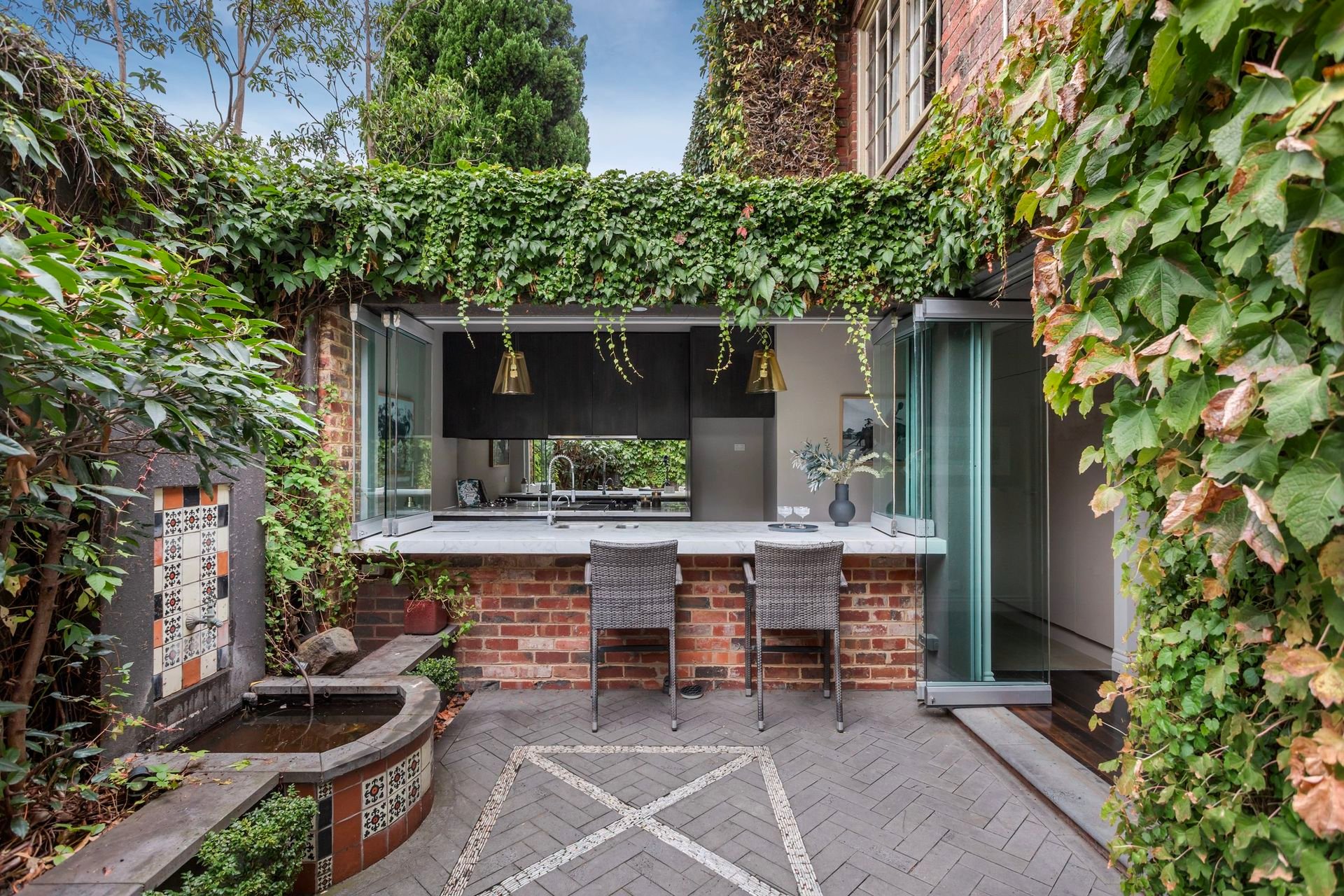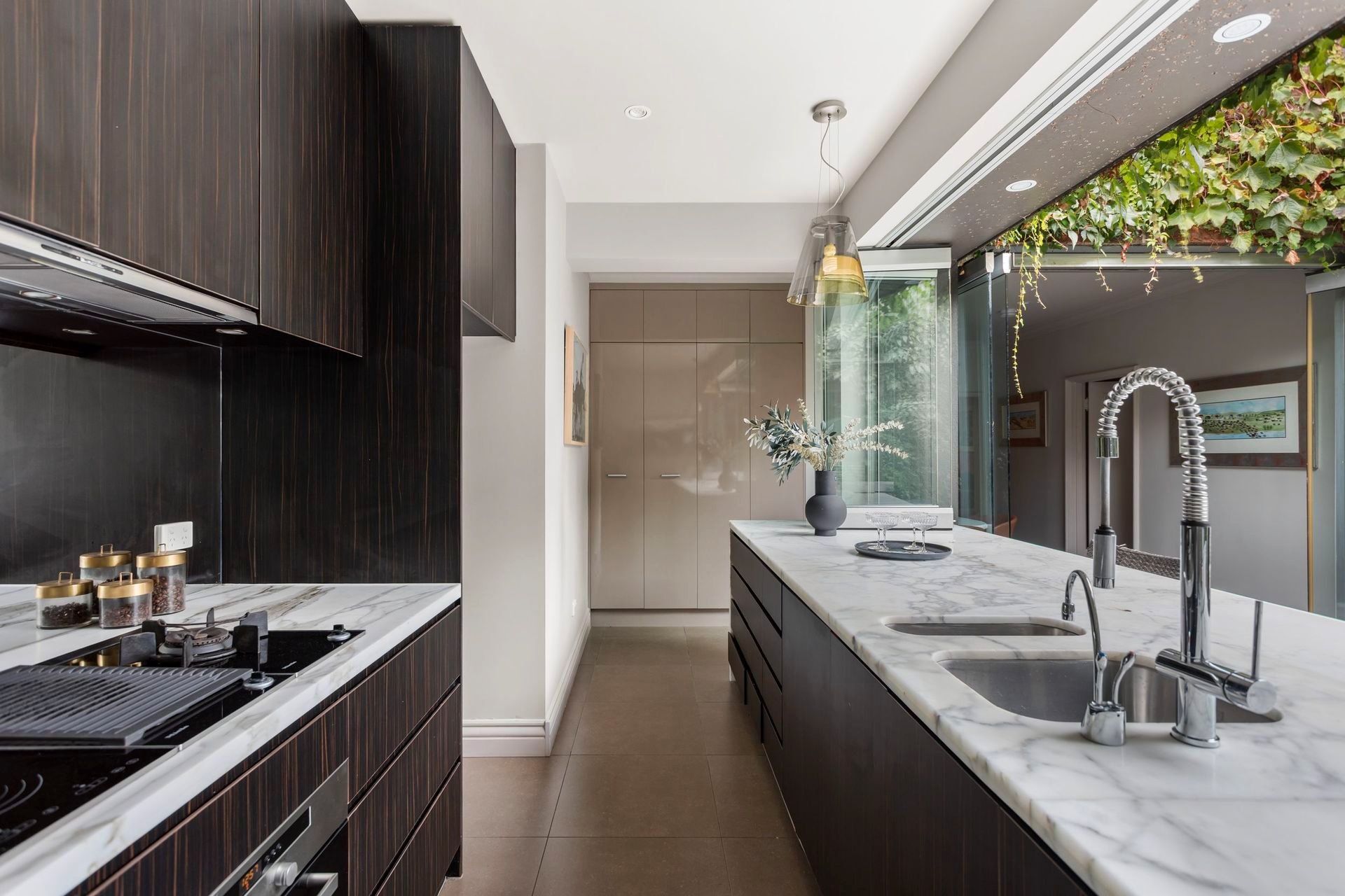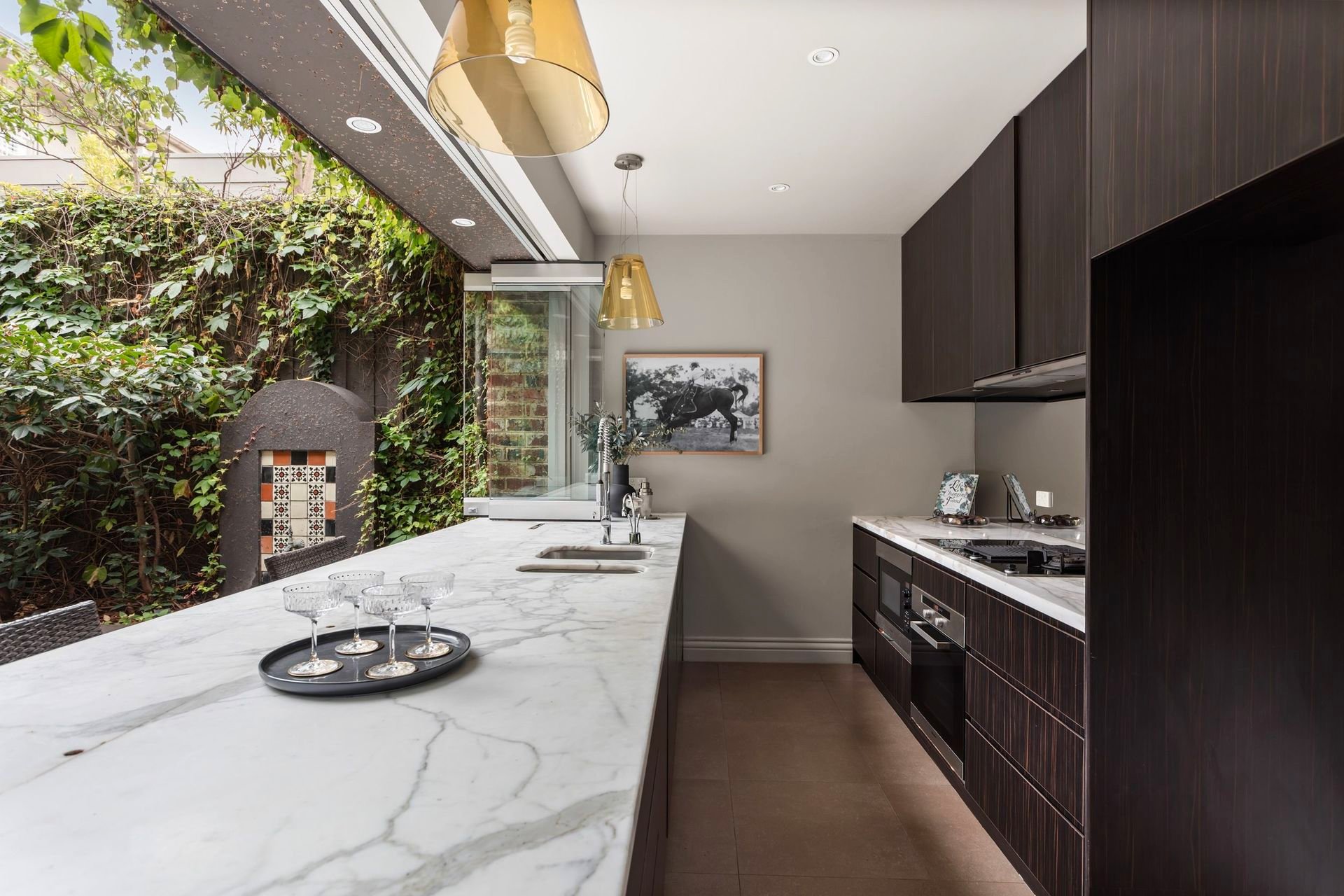 The stunning galley kitchen overlooking the north facing courtyard and fountain add the wow factor and entertaining flexibility that is so rare. With the clever use of stackable glass windows built into the inside and out Calacutta marble bench, you can pour a drink or grab a plate while still being part of the conversation. These things are important, particularly when dinner can spill out from the formal dining into the outside space with such ease.
