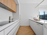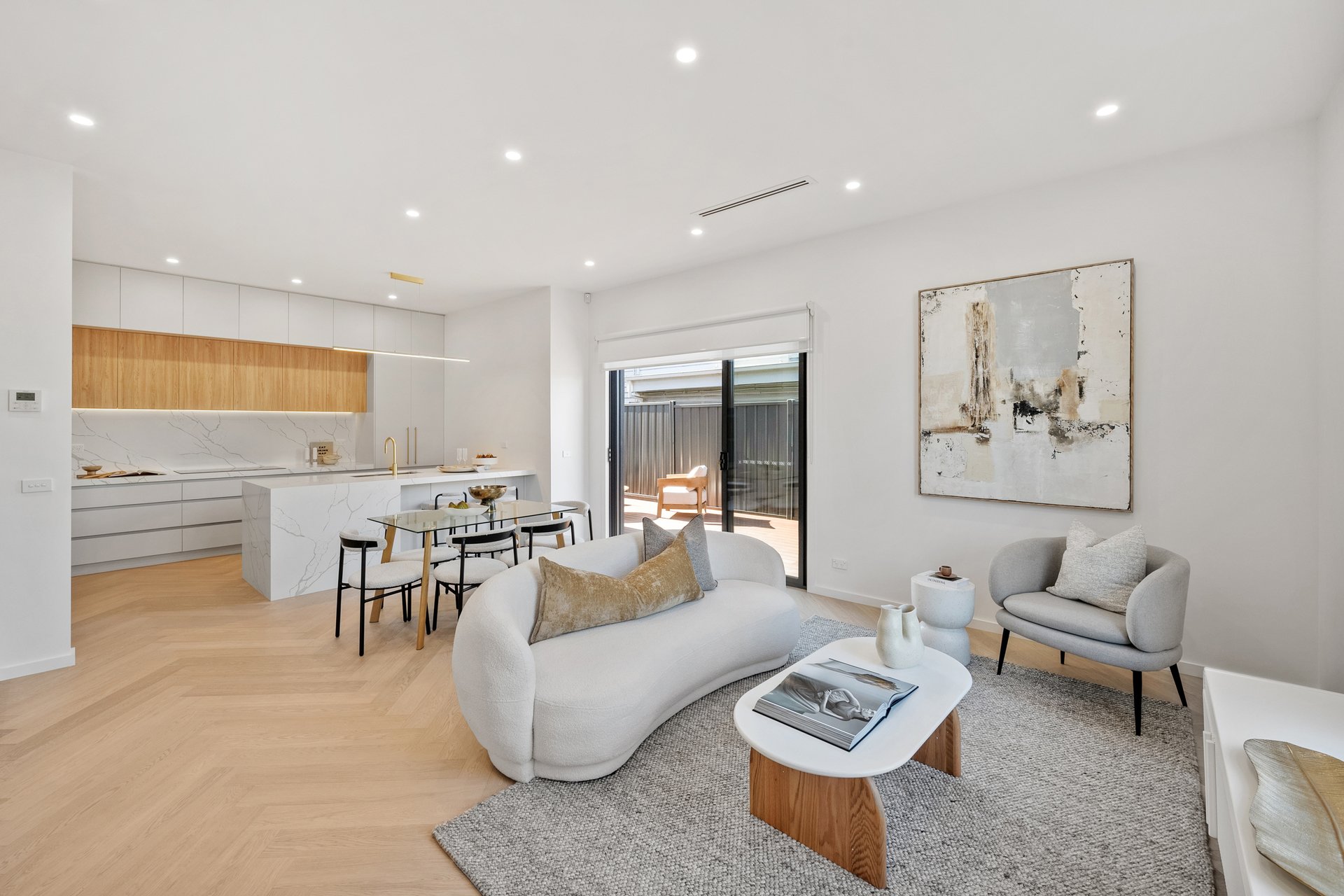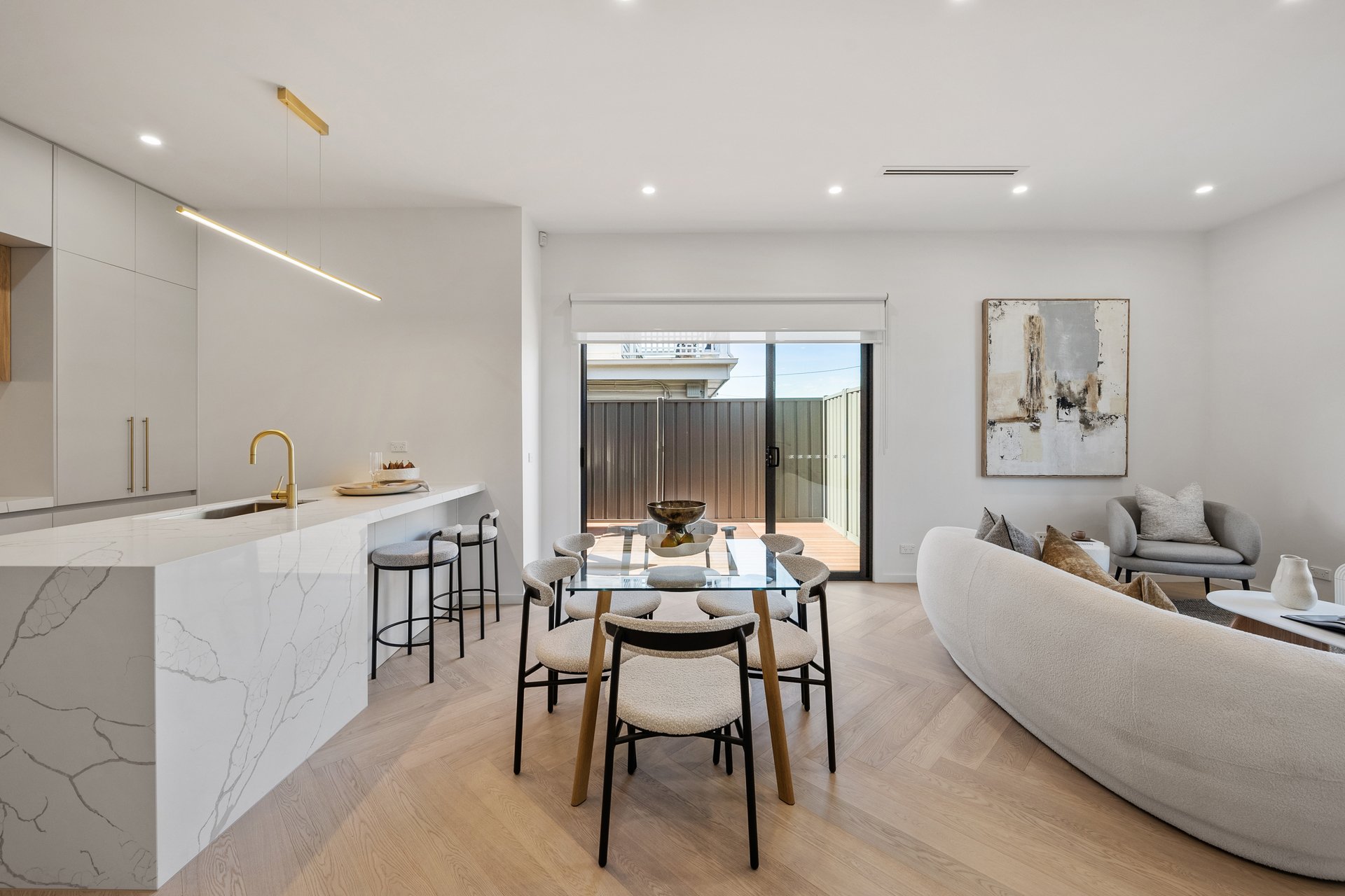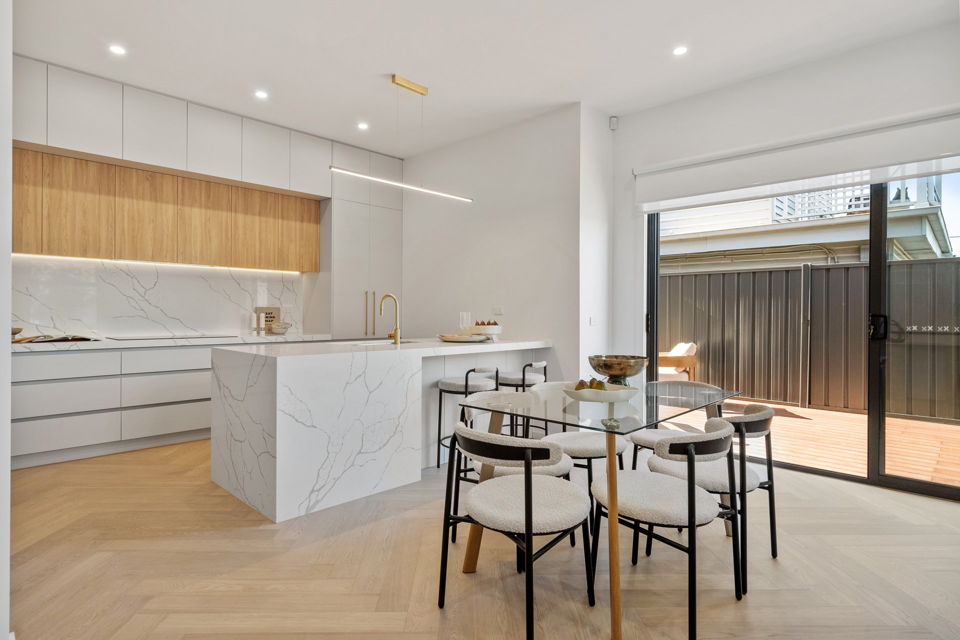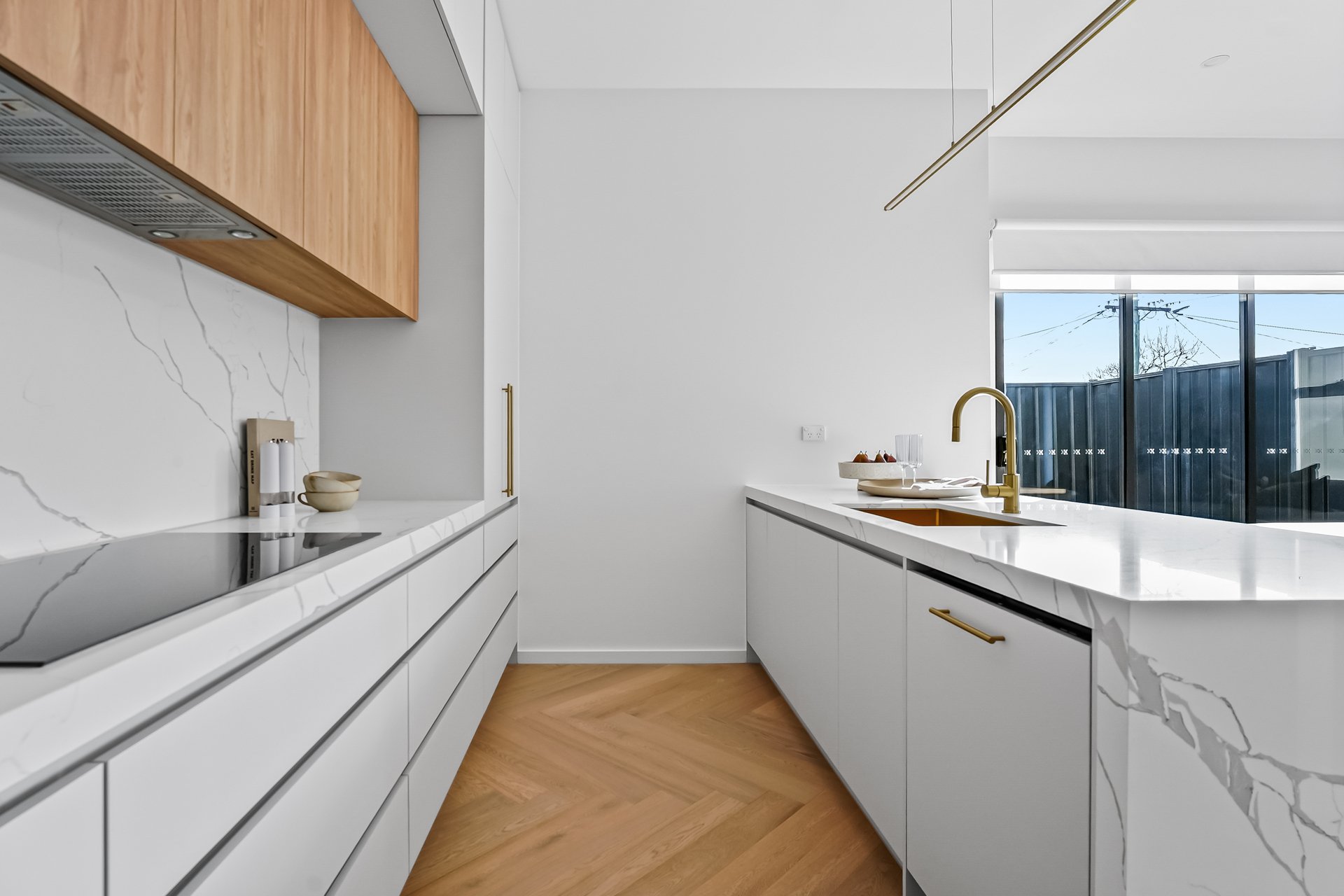 Set on approximately 300m², this is a standalone residence with no owners corporation, delivering the independence of your own title without shared costs or management. Spanning around 20 squares, the home has been designed with effortless family living in mind. The ground floor showcases a striking entry, soaring 3m ceilings, and engineered oak herringbone flooring, flowing through to a spacious open-plan living and dining area. At its heart is a gourmet kitchen with premium Miele appliances including 900mm induction cooktop, oven, built-in microwave and integrated dishwasher, finished with stone benchtops, splashbacks and brushed brass ABI tapware.