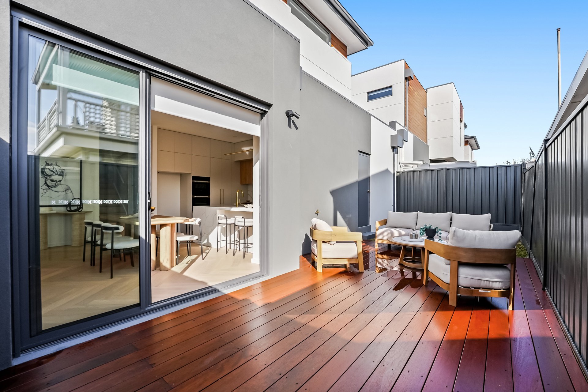 Seamless indoor-outdoor living is achieved with stacker doors opening onto dual courtyards - one featuring a timber deck for entertaining and the other a landscaped retreat.