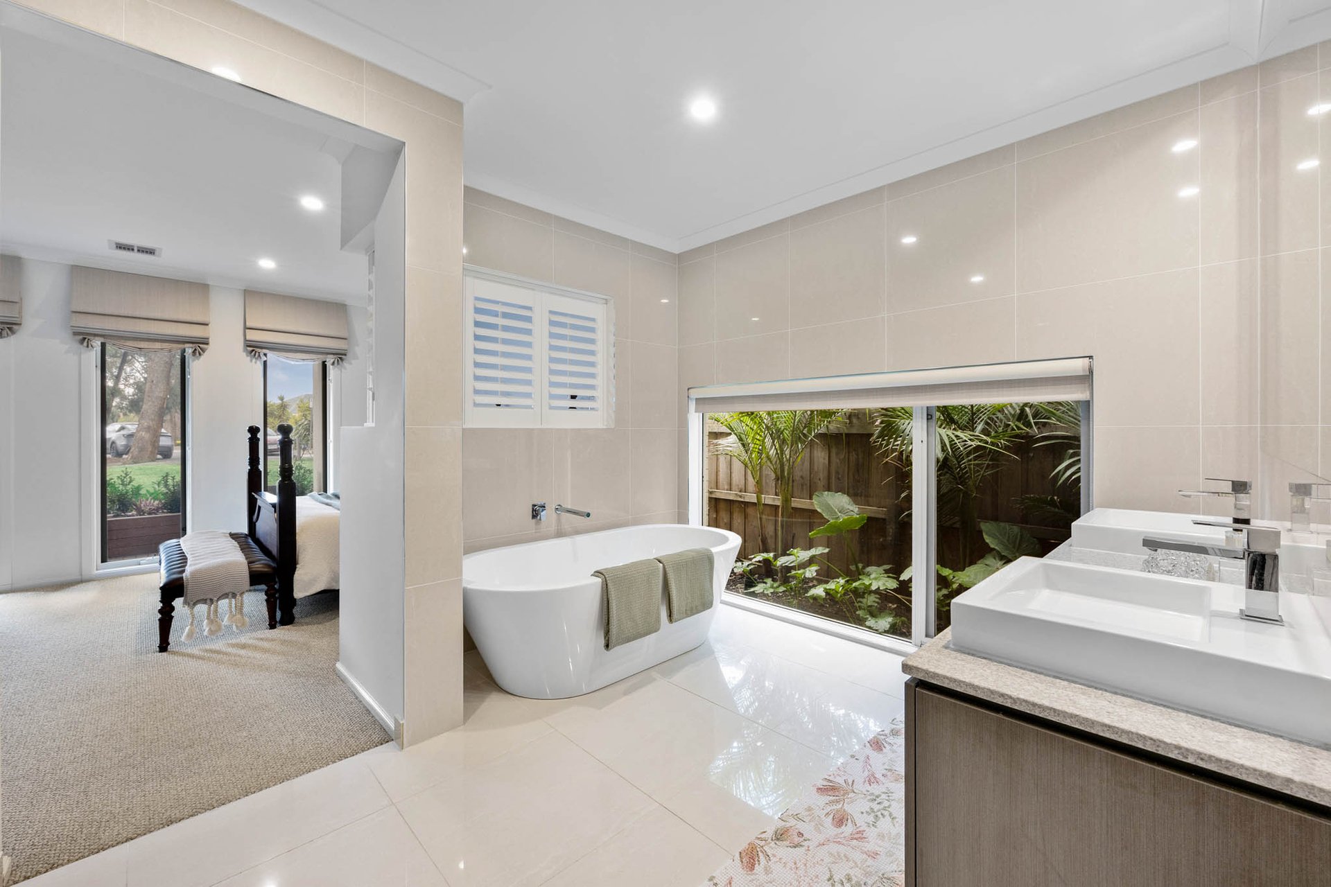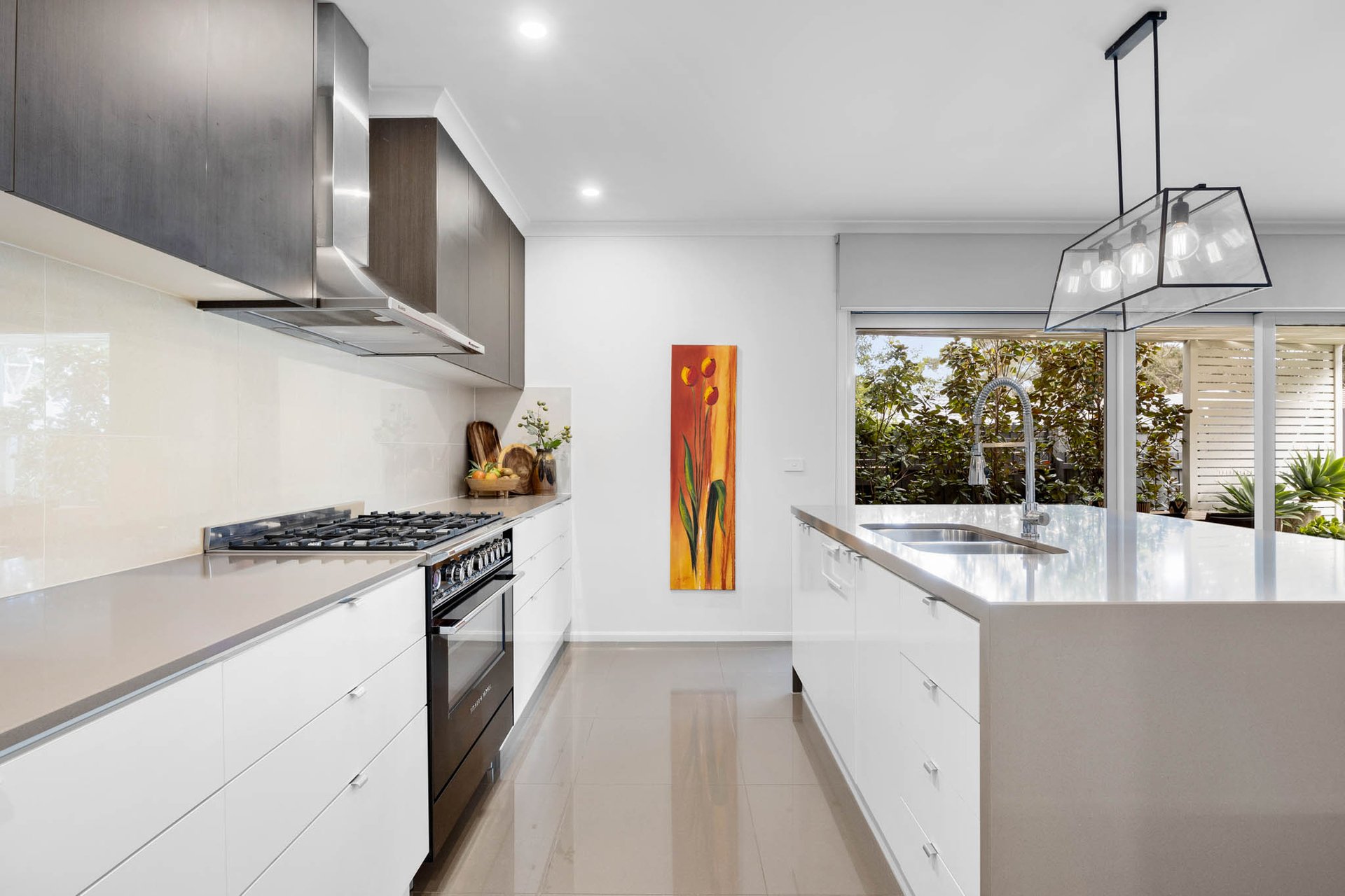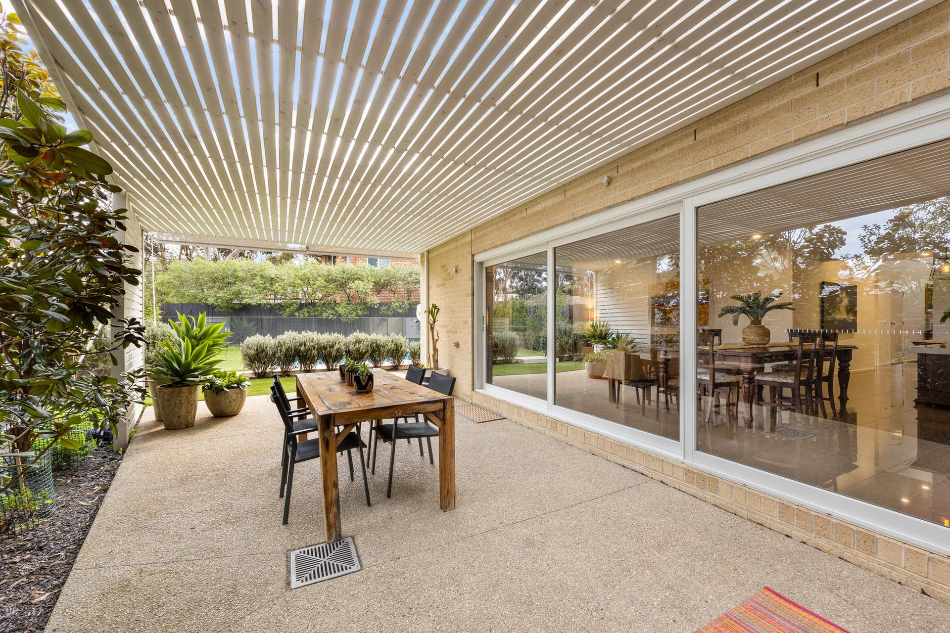 Framed by white slatted surrounds, the alfresco is perfectly positioned for year-round enjoyment overlooking the stunning solar-heated, salt-chlorinated pool with frameless glass fencing, while the landscaped garden provides a manicured, low-maintenance backdrop to relaxed entertaining and daily life.