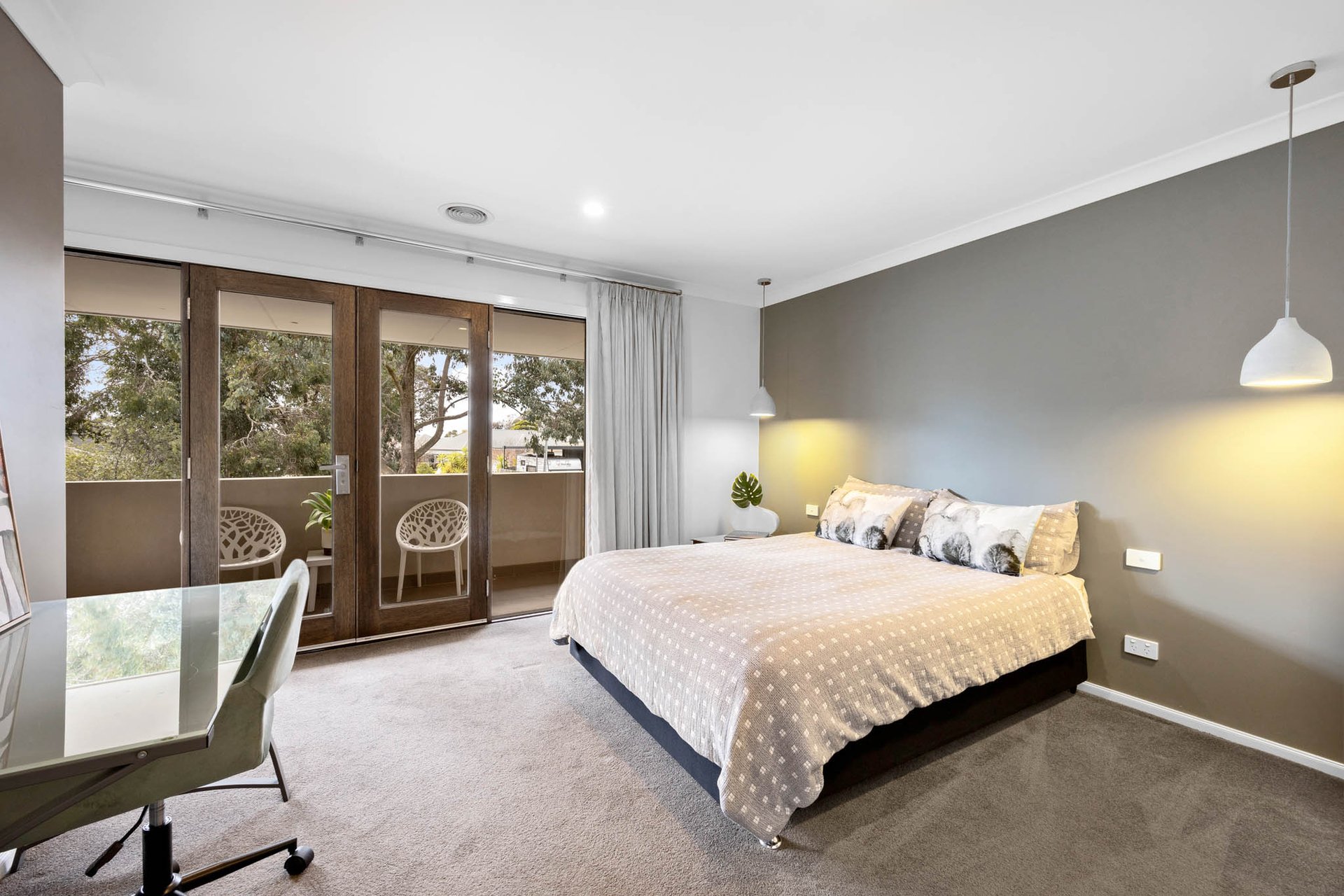 A rich timber staircase ascends to the upper level, offering a vast living zone with study nook, accompanied by four bedrooms and two bathrooms including a 2nd master suite with a dressing room, private balcony, and stylish ensuite. Further inclusions comprise an integrated double garage, plantation shutters, ducted heating, split systems, solar panels, walk-in linen/storage room, and a garden shed.