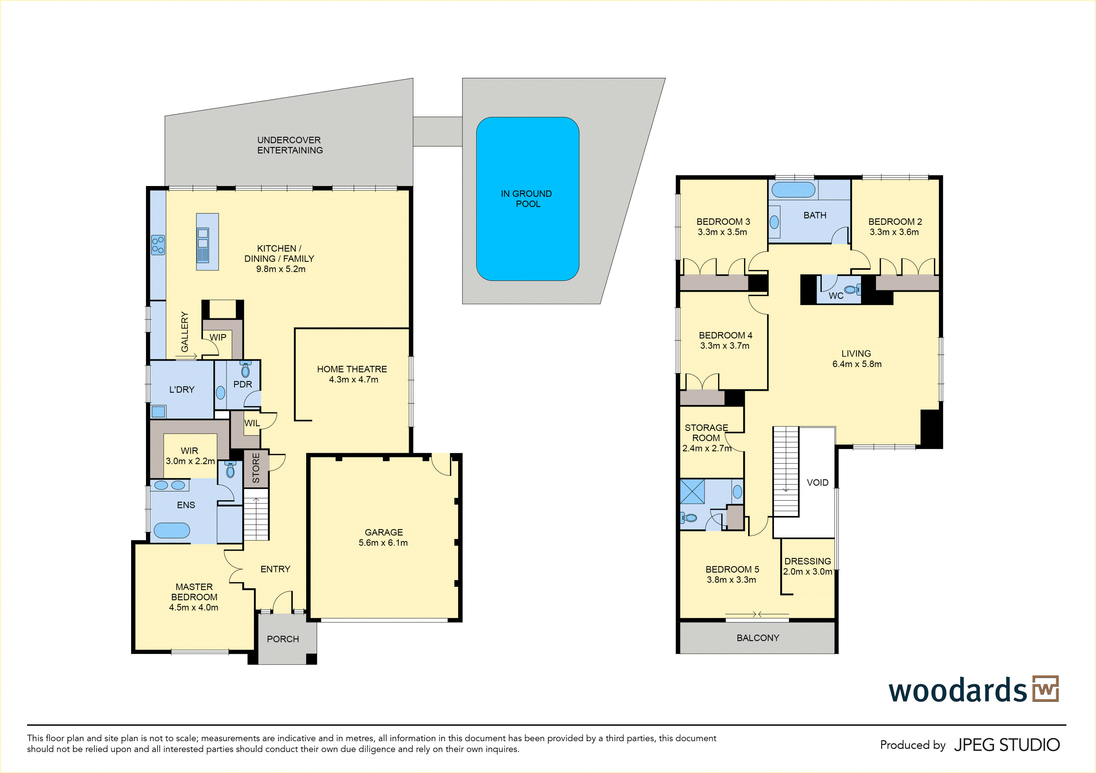 Catering to multi-generational ease, a palatial downstairs master suite offers a walk-in robe and a luxuriously appointed ensuite with a twin stone vanity, sumptuous bath, and floor-to-ceiling tiling. A home theatre with raised seating and a powder room complete the lower level.