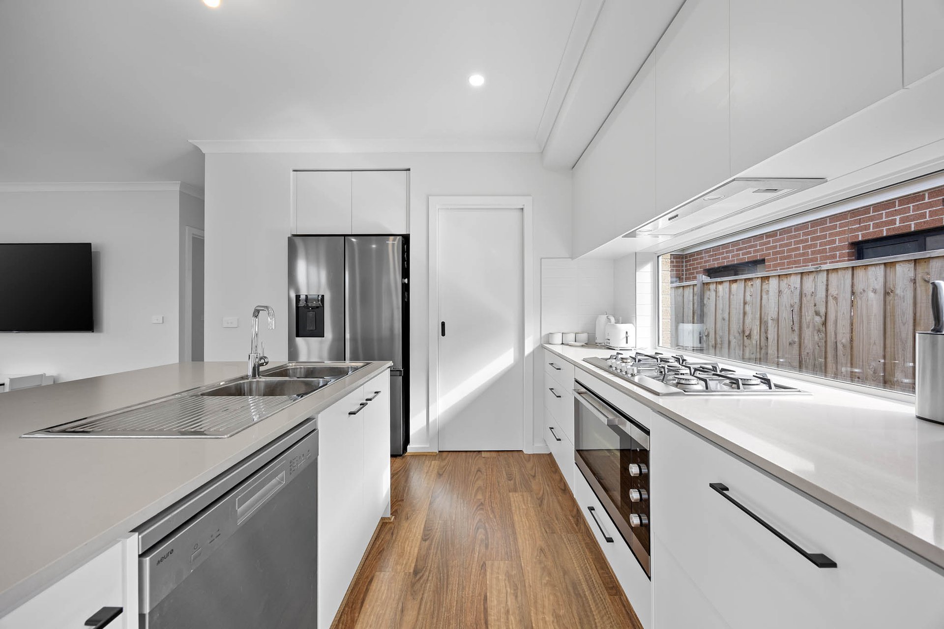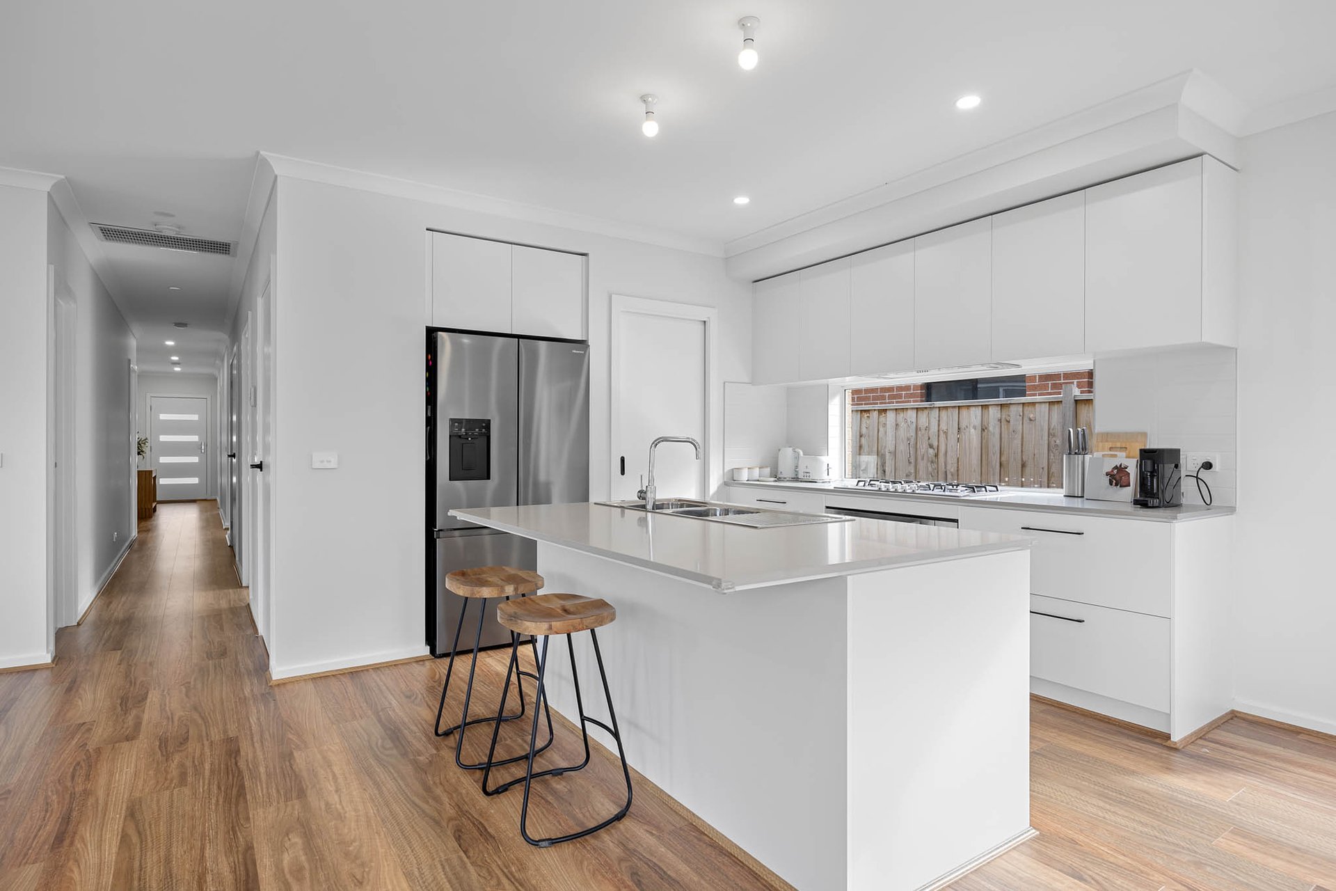 A modern kitchen sets the tone with stone benchtops, soft-close melamine cabinetry, and stainless-steel appliances including 900mm cooking and a dishwasher. Open plan meals and living zones connect smoothly to alfresco entertaining. Peaceful and private, the rear yard surprises with its scale, delivering low-maintenance lawn and pebblecrete areas plus a sunny deck for weekend hangs.