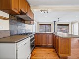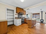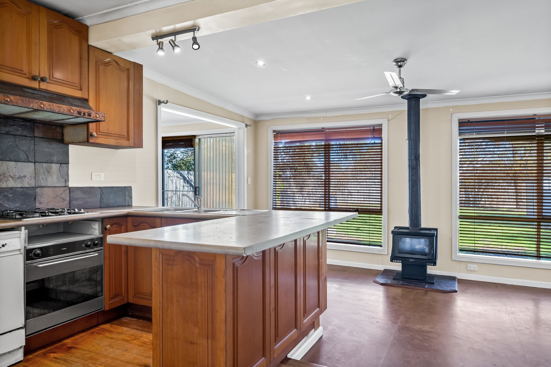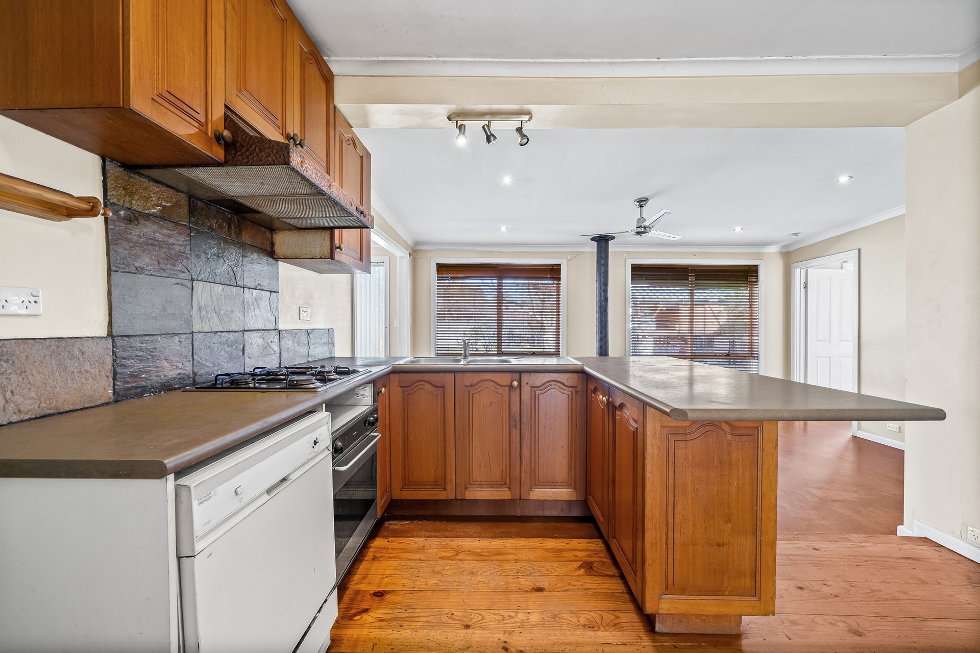 A cosy dining room with wood-burning furnace creates the perfect spot for family meals, while the kitchen combines functionality and style with wooden cabinetry, stone tiling behind the gas stove and Blanco oven. Timber flooring flows throughout, adding warmth to every room.