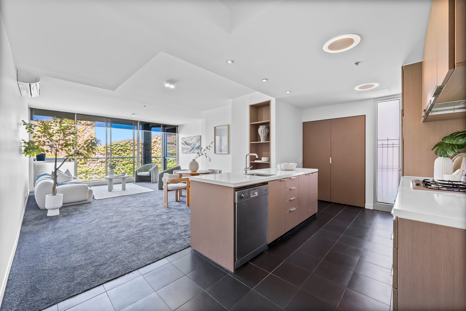 Designed for easy living, the open-plan layout offers a bright and inviting atmosphere with plush carpet throughout the living, dining, and bedrooms. Large windows flood the space with natural light, while the air conditioning ensures year-round comfort. Step through sliding doors to a spacious, tiled balcony, ideal for morning coffee or evening relaxation.