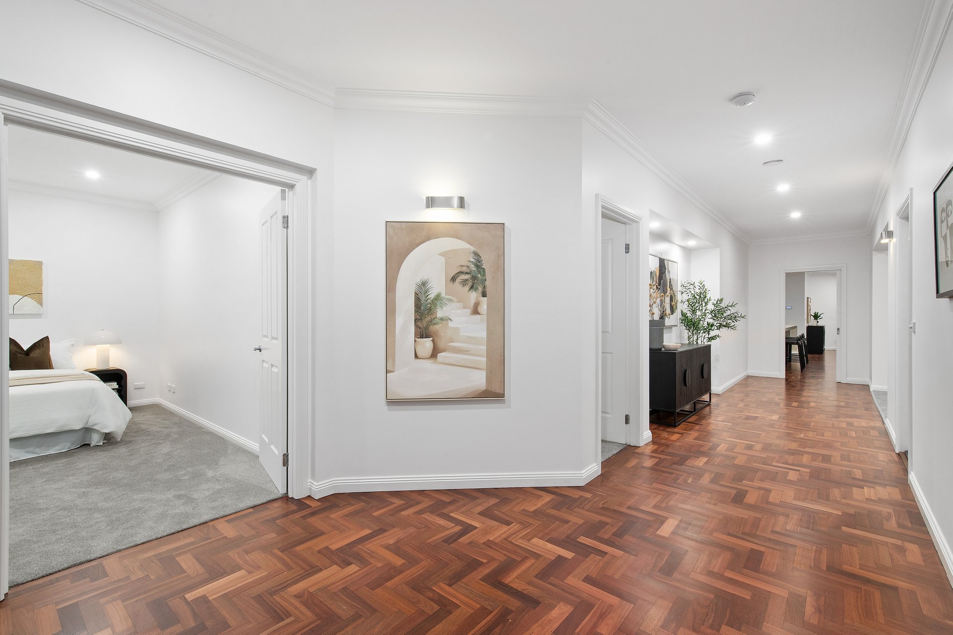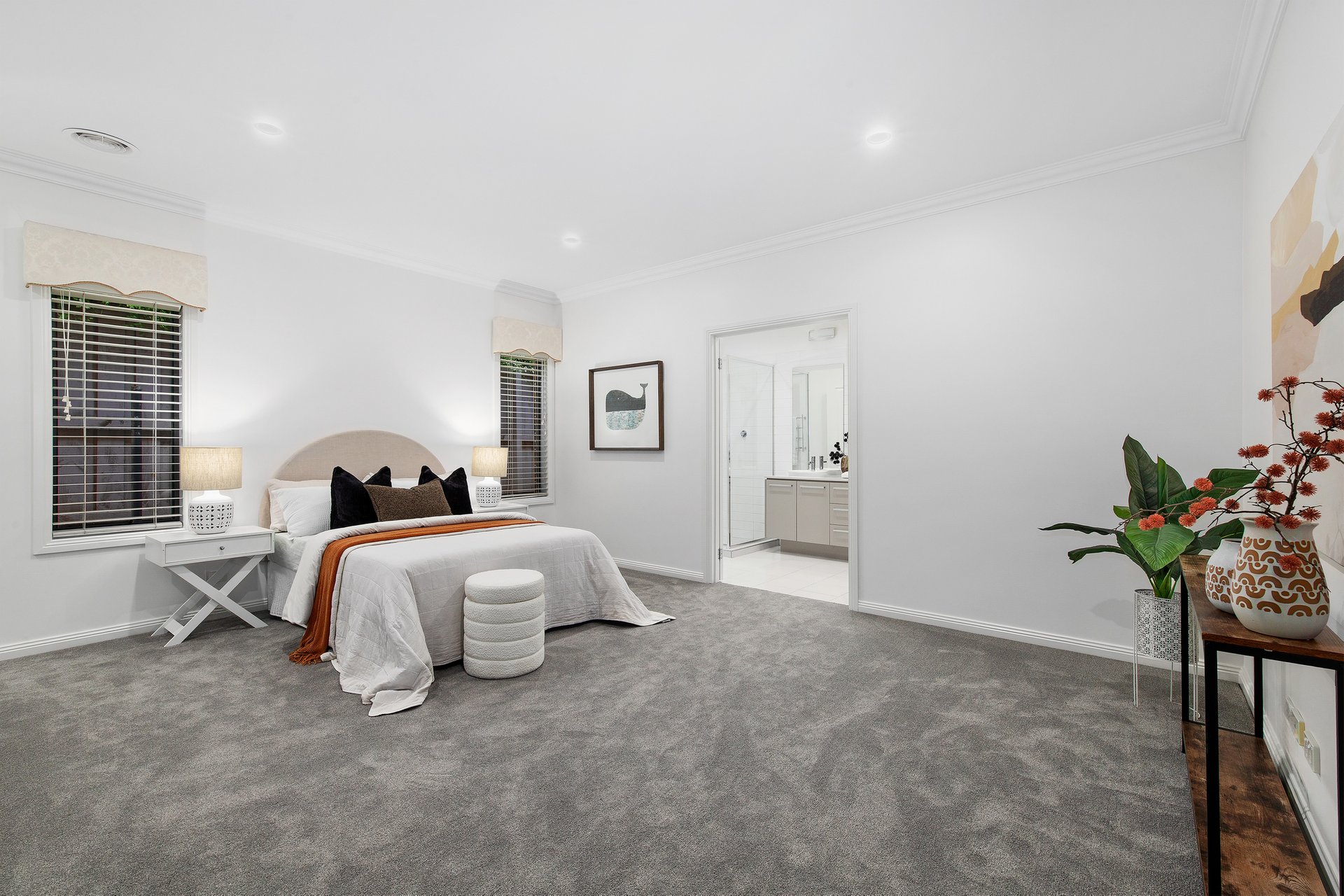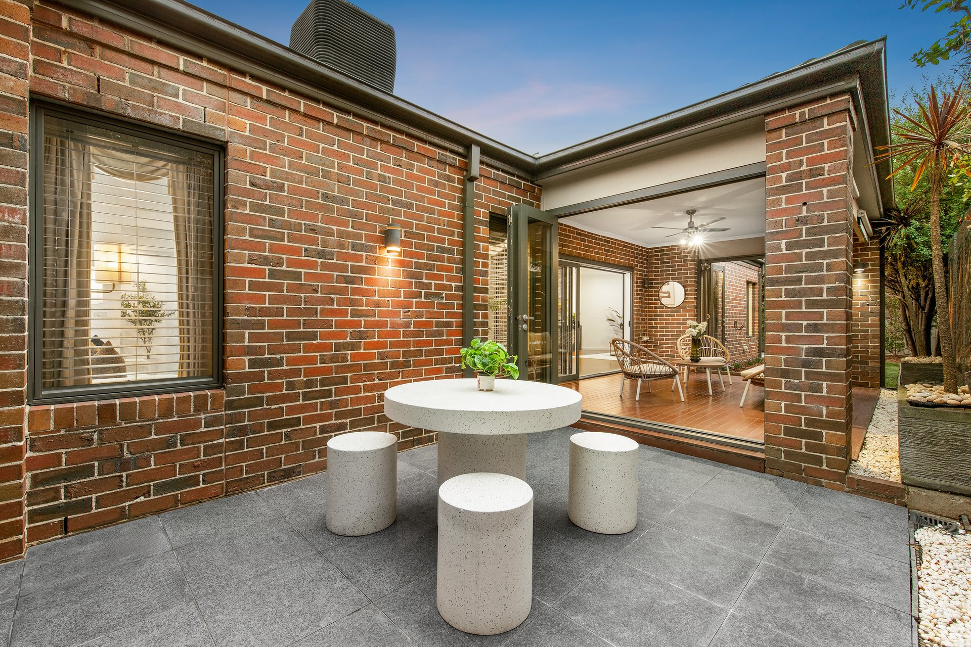 The kitchen is the quiet anchor, Caesarstone benchtops, quality stainless steel appliances, and a walk-in pantry built for people who actually cook. It opens to the living and dining areas without ceremony, so the act of cooking remains part of the social life of the house rather than separate from it. The covered alfresco is not an amenity, it adds to the soul of the home. Bi-fold doors dissolve the line between inside and out. A tranquil water feature provides a backdrop that makes the space feel genuinely removed from everything, because, remarkably, it is. Neighbours are present on paper only; you would never know. Summer breakfasts, long Sunday lunches, quiet Tuesday evenings or whatever takes your fancy; inside or outside, this space provides the lifestyle for you to entertain.