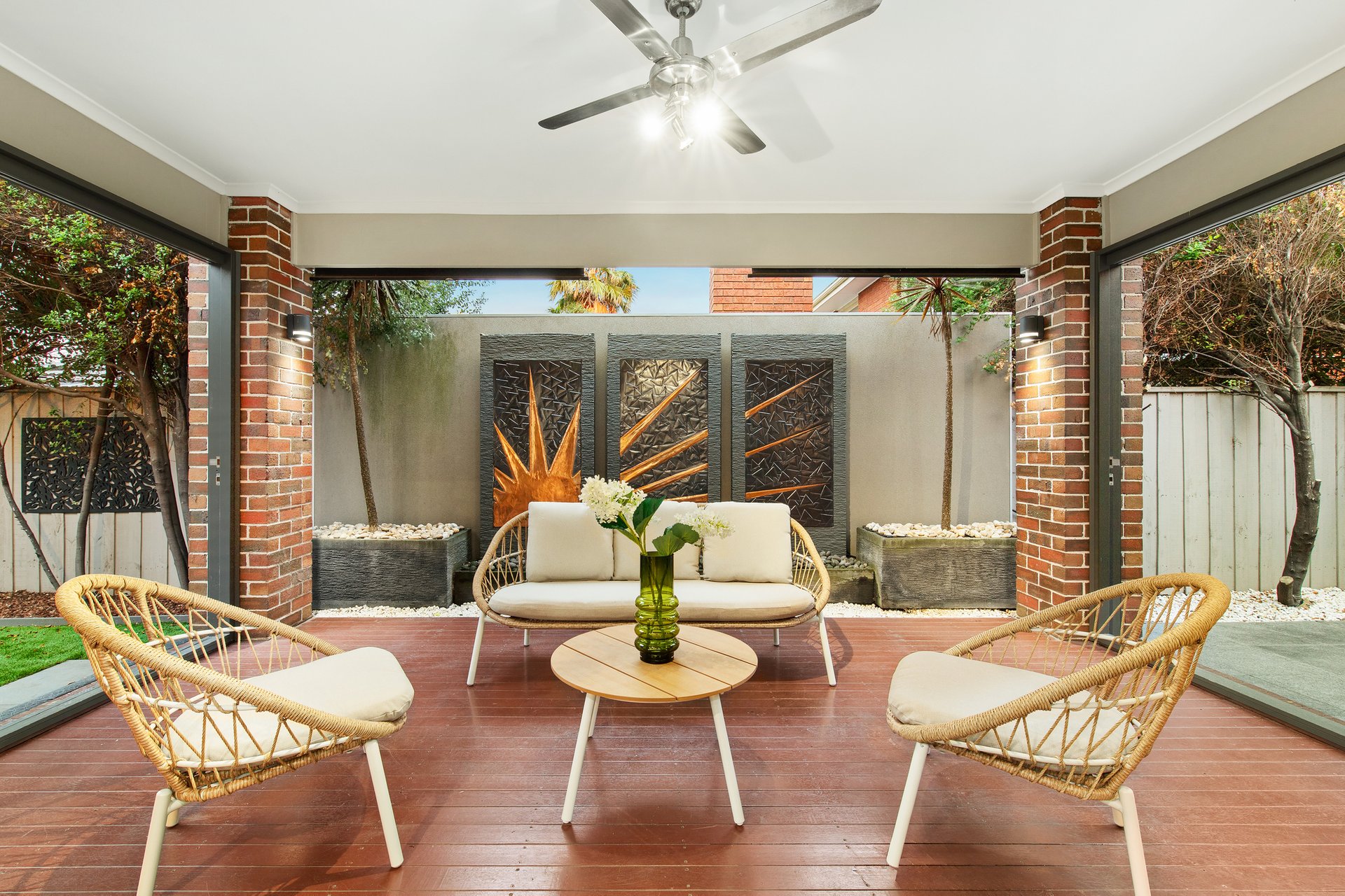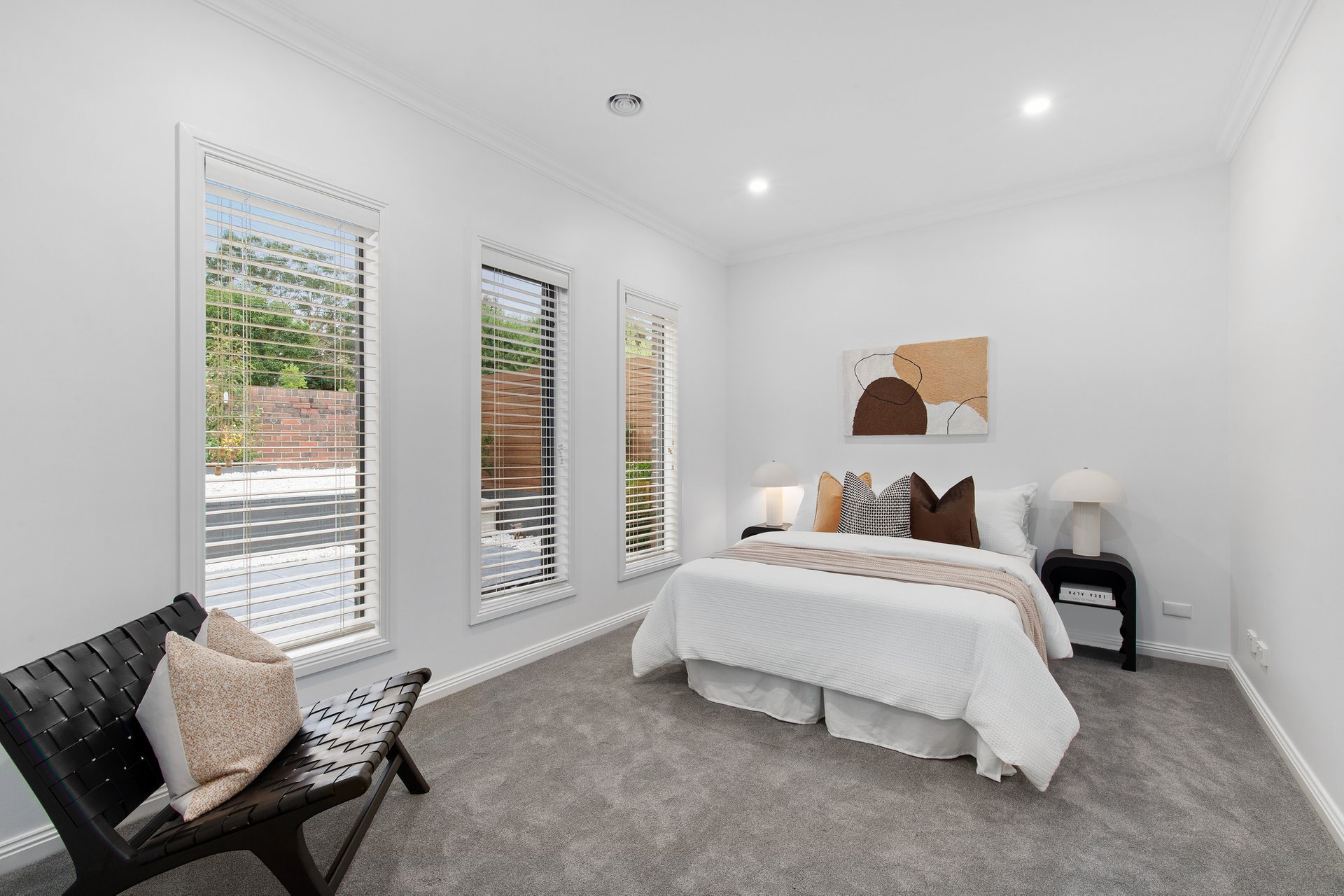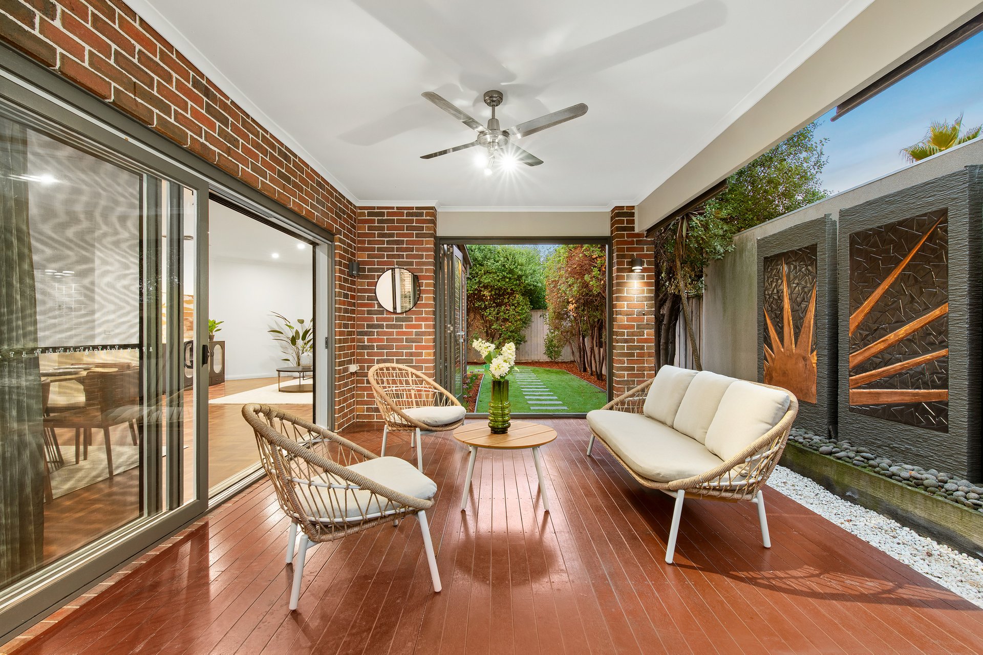 The kitchen is the quiet anchor, Caesarstone benchtops, quality stainless steel appliances, and a walk-in pantry built for people who actually cook. It opens to the living and dining areas without ceremony, so the act of cooking remains part of the social life of the house rather than separate from it. The covered alfresco is not an amenity, it adds to the soul of the home. Bi-fold doors dissolve the line between inside and out. A tranquil water feature provides a backdrop that makes the space feel genuinely removed from everything, because, remarkably, it is. Neighbours are present on paper only; you would never know. Summer breakfasts, long Sunday lunches, quiet Tuesday evenings or whatever takes your fancy; inside or outside, this space provides the lifestyle for you to entertain.