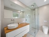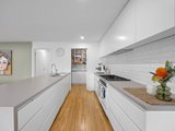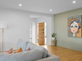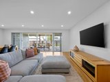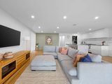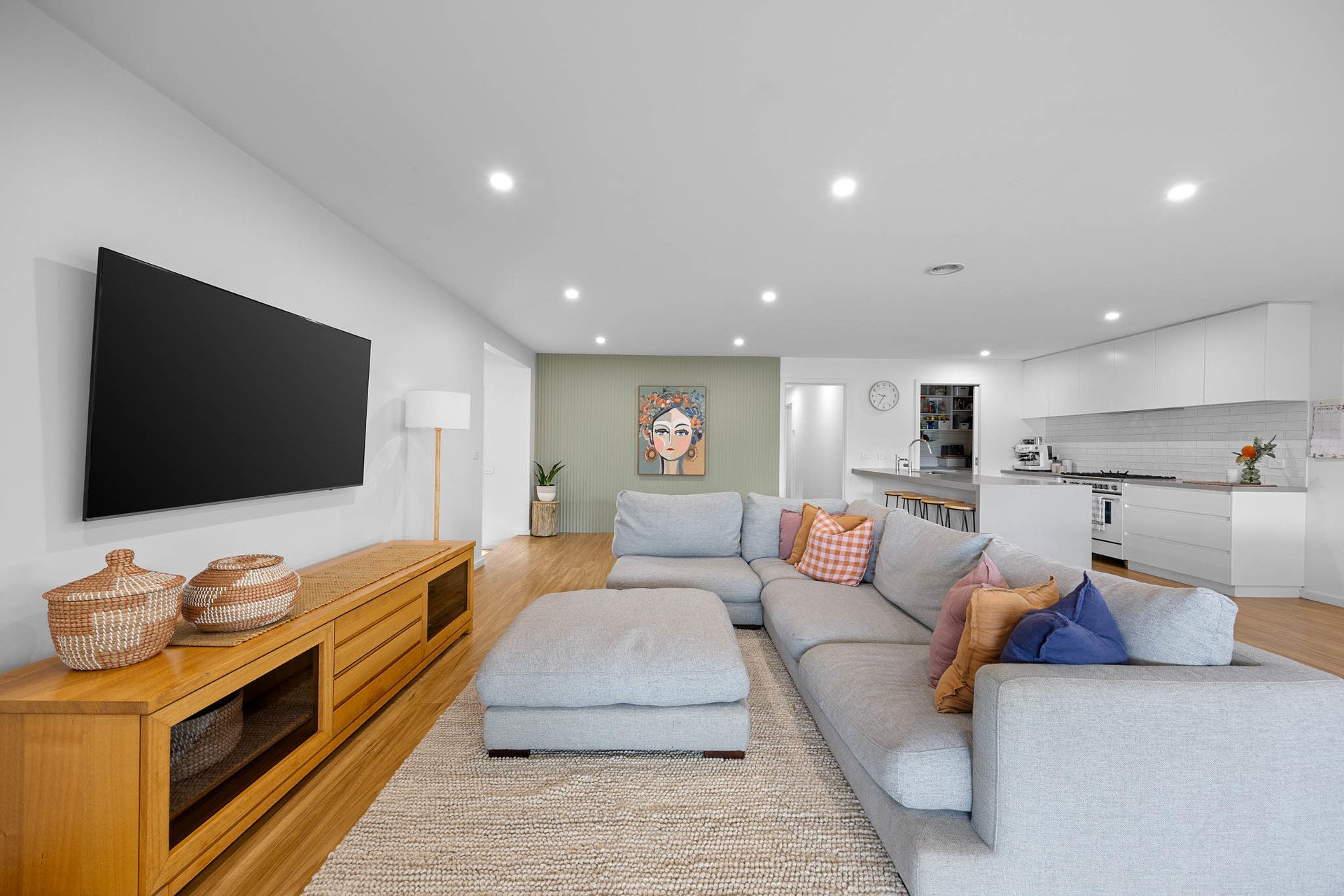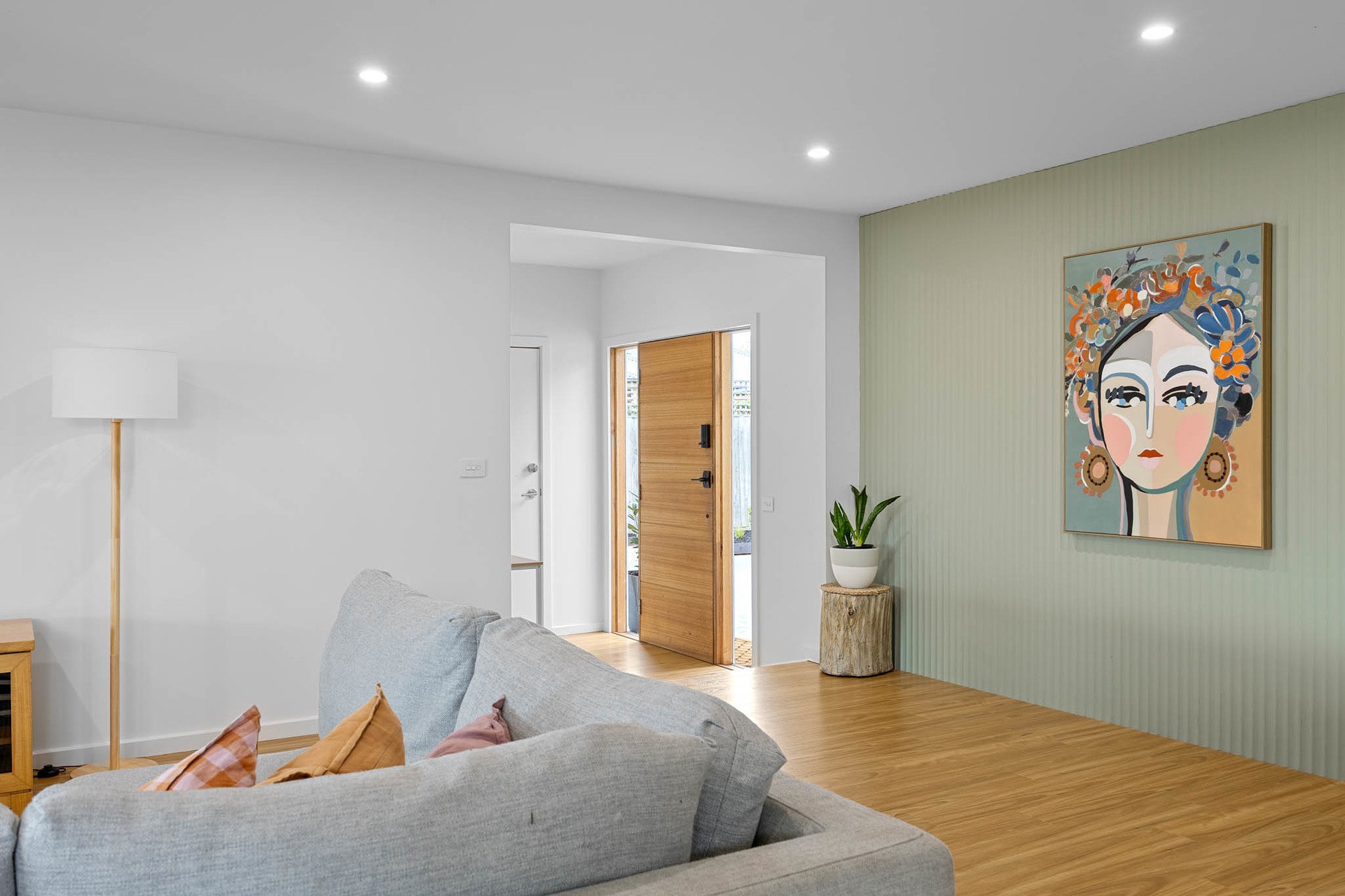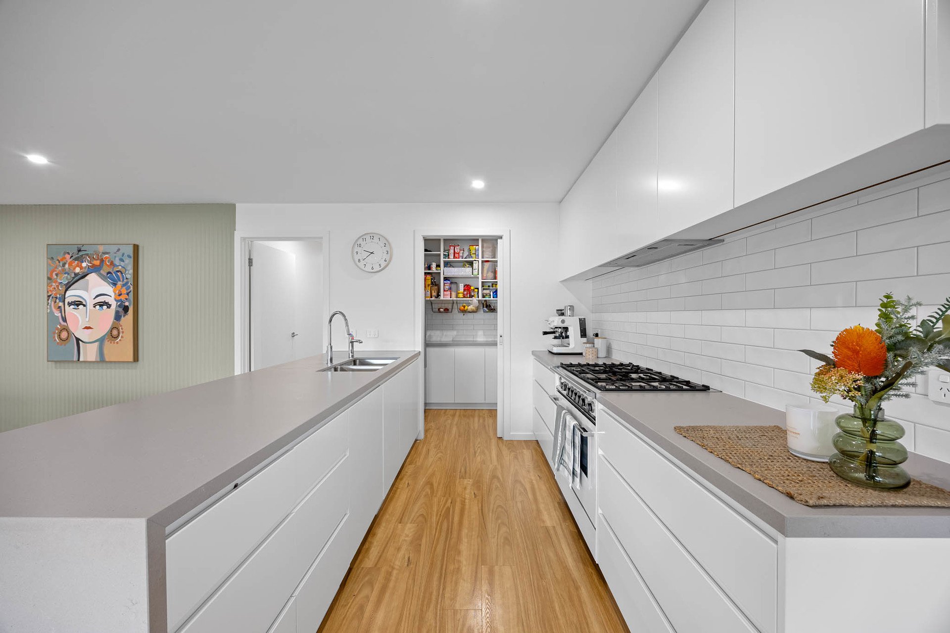Low-maintenance landscaped grounds frame the residence, introducing open living and dining areas where a sage-toned fluted feature wall provides a contemporary focal point. The showpiece kitchen flaunts a 60mm raw-concrete waterfall-edge stone island with undermount sinks, with matching stone surfaces carried through to the walk-in pantry. Appointments include soft-close cabinetry and drawers, a 900mm F&P upright oven with 5-zone cooktop, and a dishwasher.