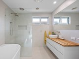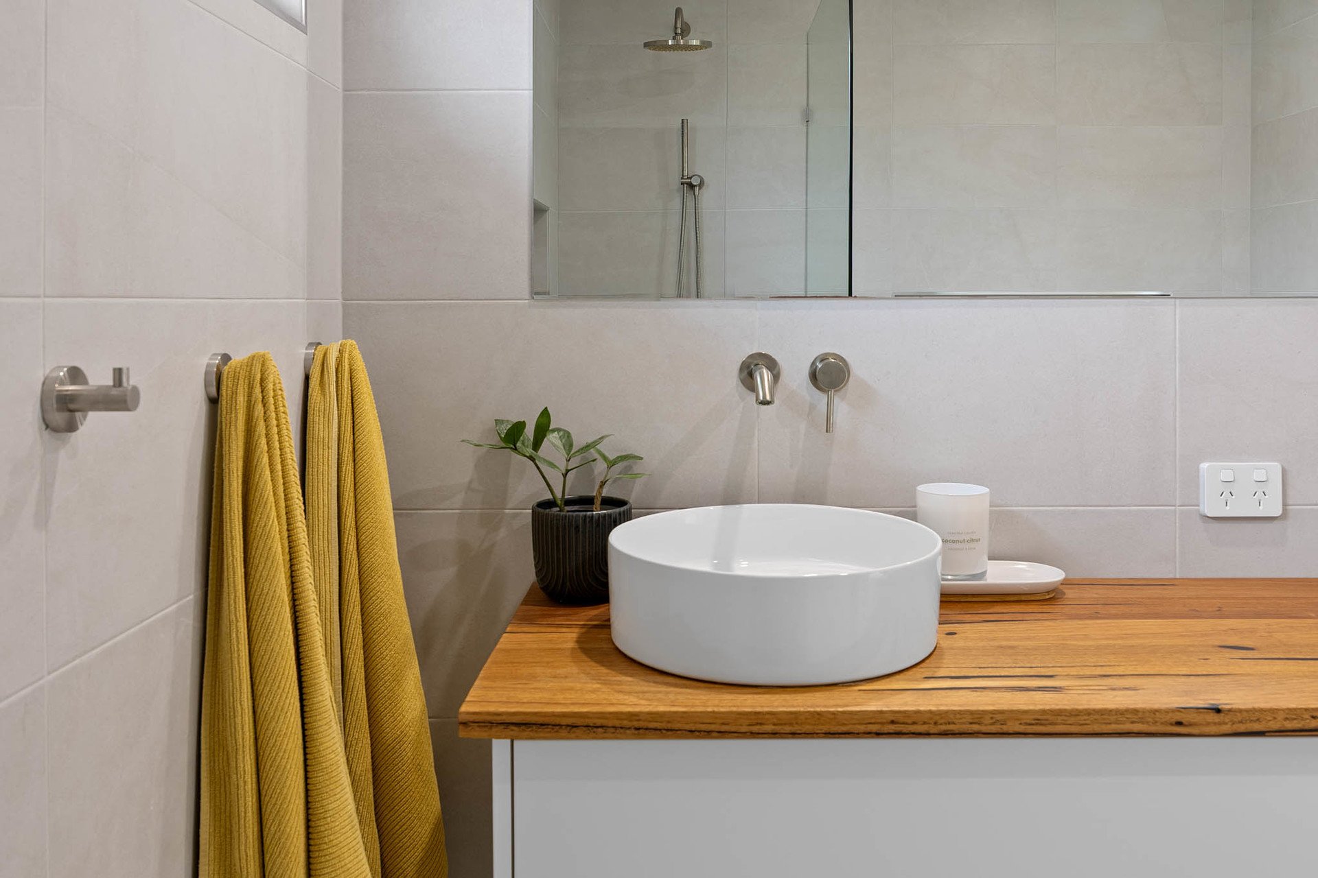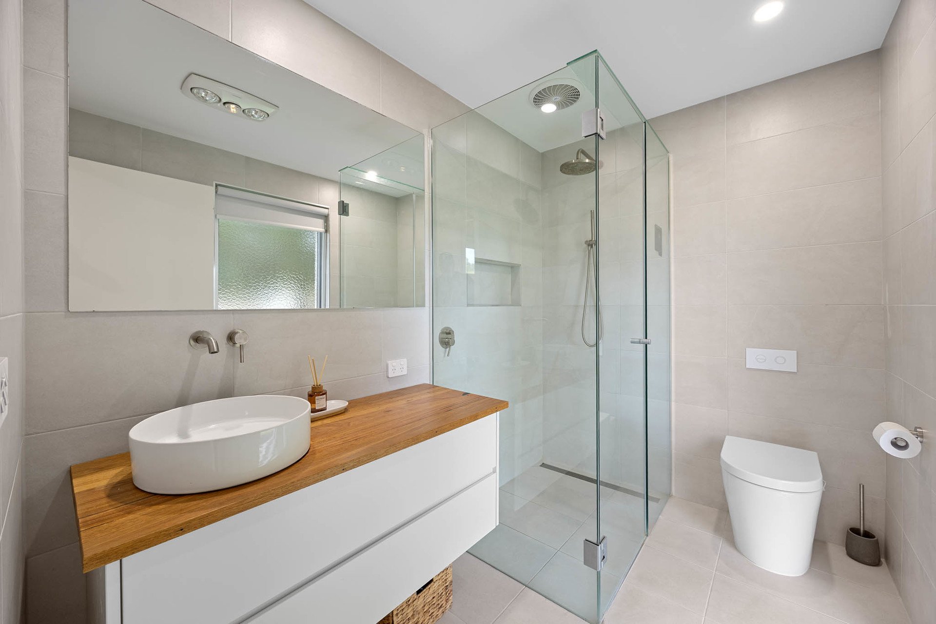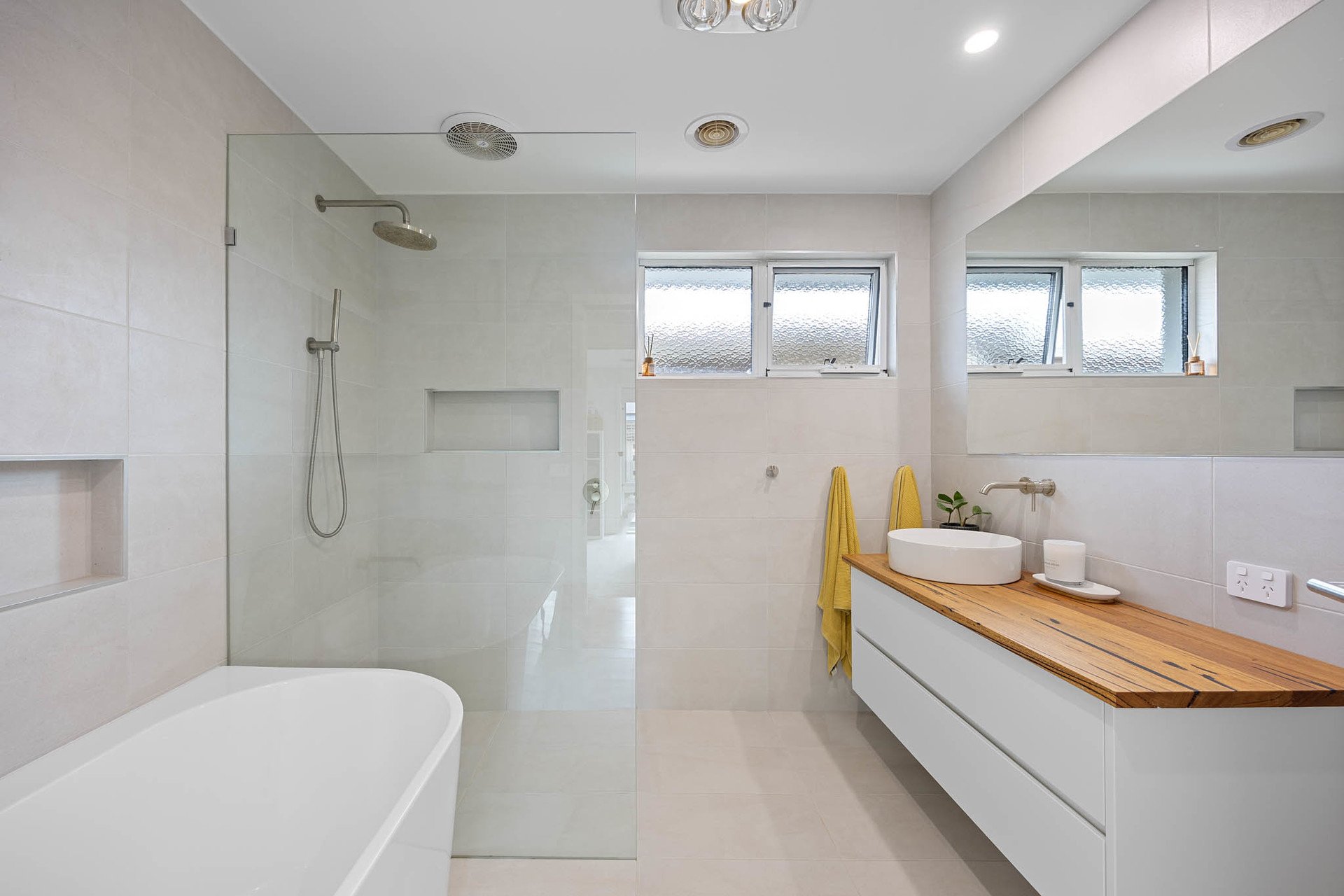 Accommodation comprises three carpeted bedrooms plus a study/4th bedroom, including a primary suite with a walk-in robe and luxe ensuite. Both the ensuite and the central bathroom deliver fully tiled elegance featuring frameless glass walk-in niched showers with waterfall showerheads and beautiful Messmate vanities, while a to-wall bath enhances the main bathroom.
