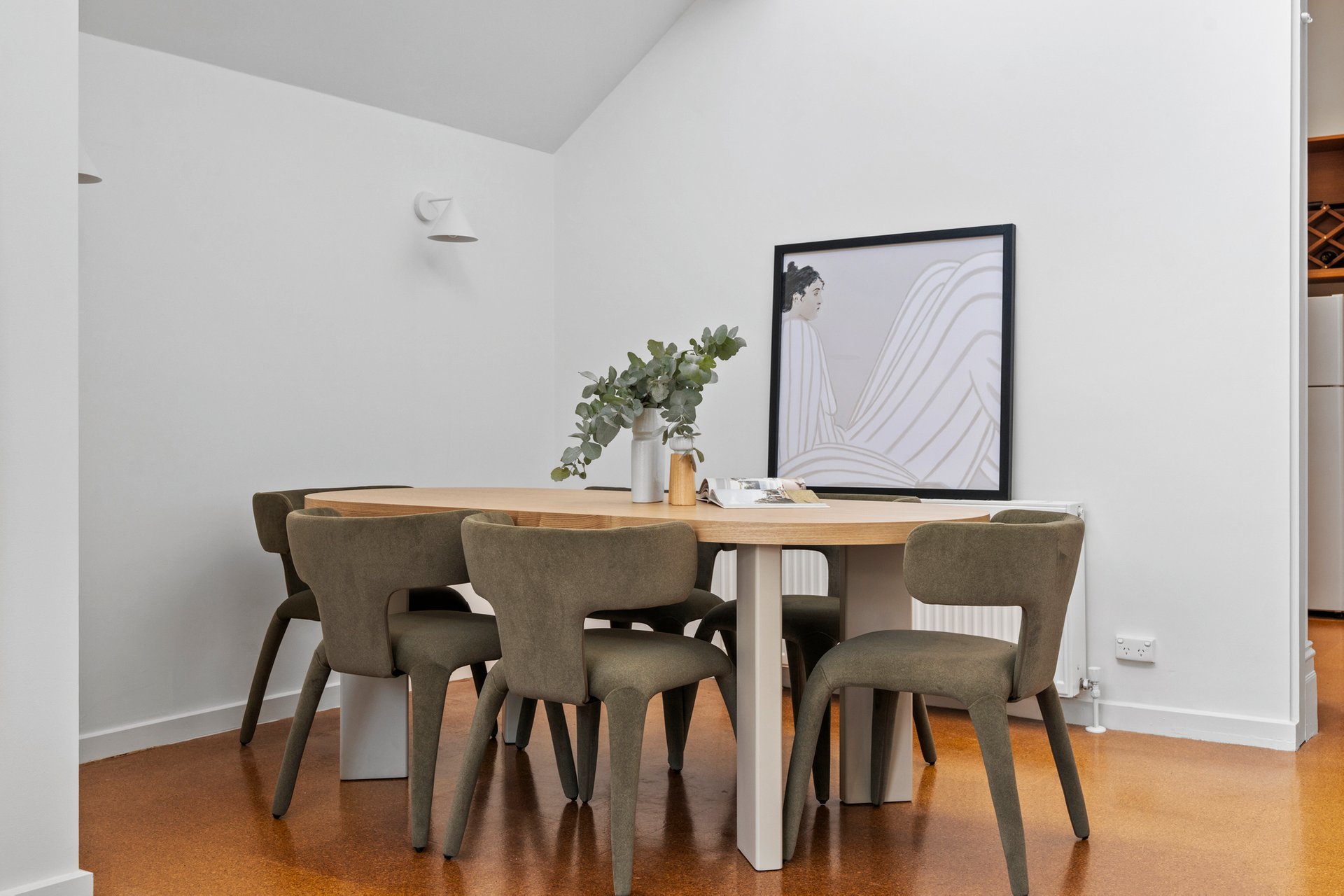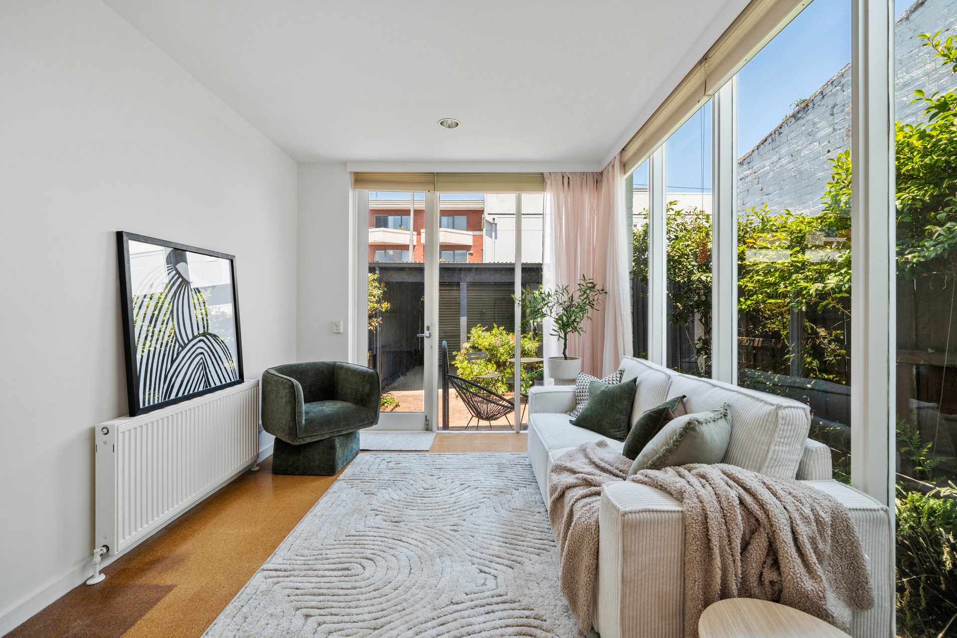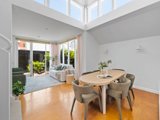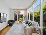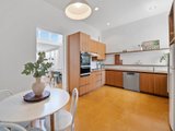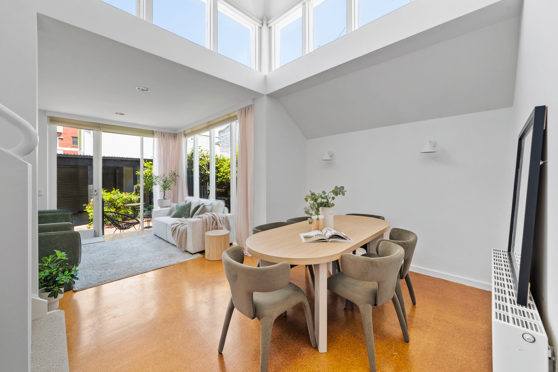 The main living area offers a contemporary, flexible space with natural light pouring in through large windows offering views of the leafy courtyard. A defined dining area lit by clerestory windows and easily seating six people flows out from the large kitchen. Hydronic heating throughout the home provides warmth in the cooler months.