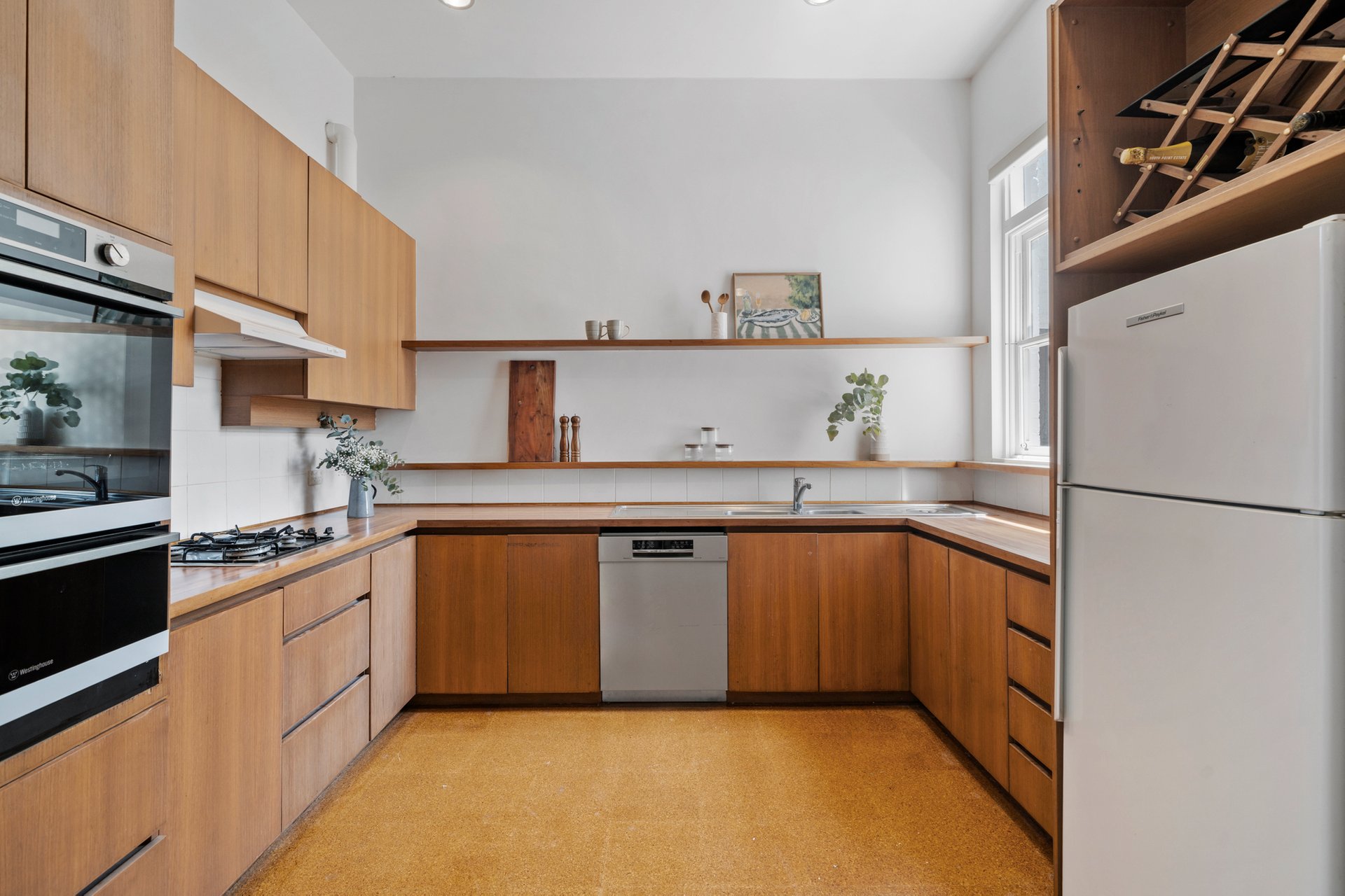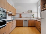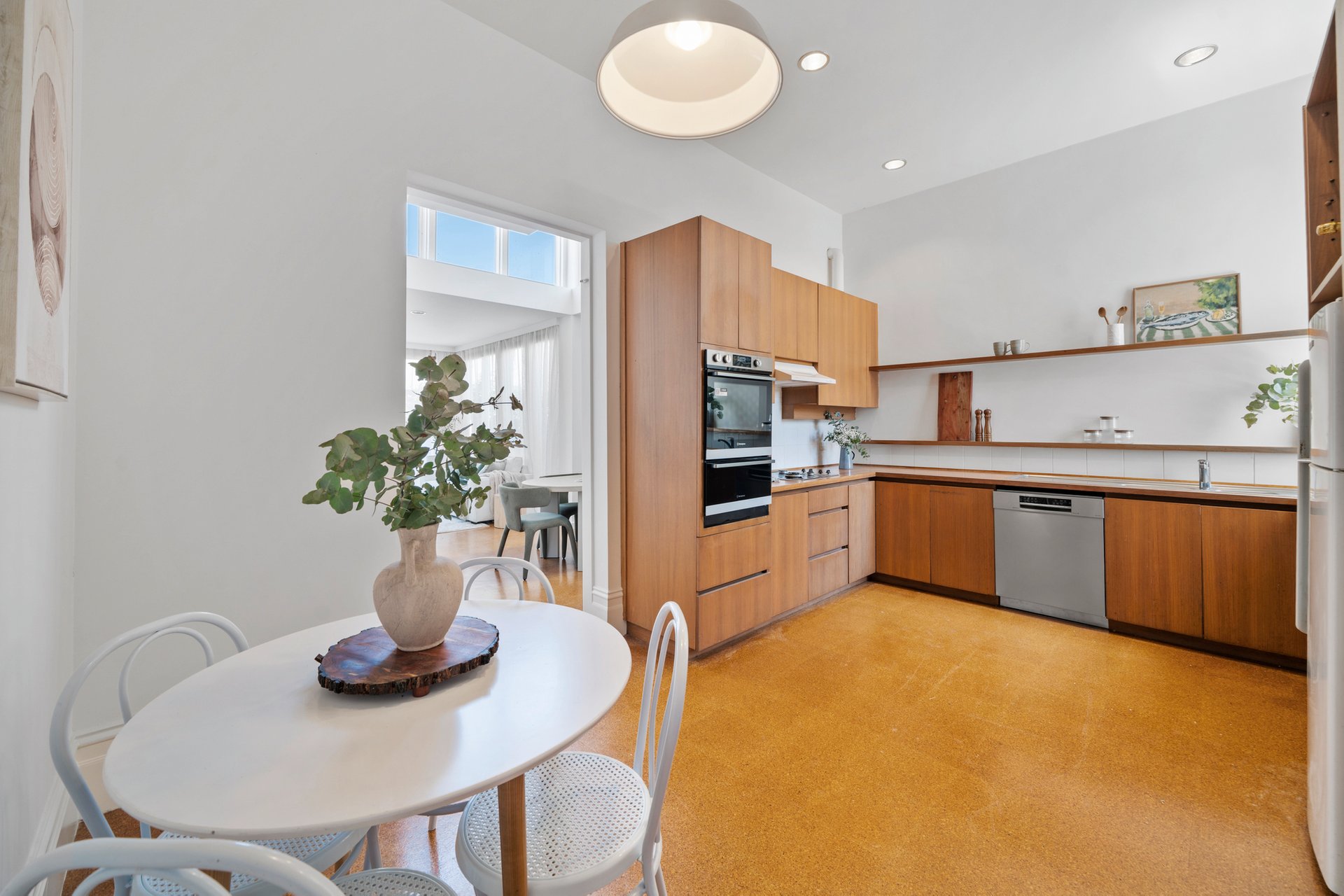 The kitchen is designed for everyday family use, featuring brush box timber benches, stainless steel appliances and gas cooking, with direct connection to the dining zone and rear courtyard making entertaining practical and effortless.