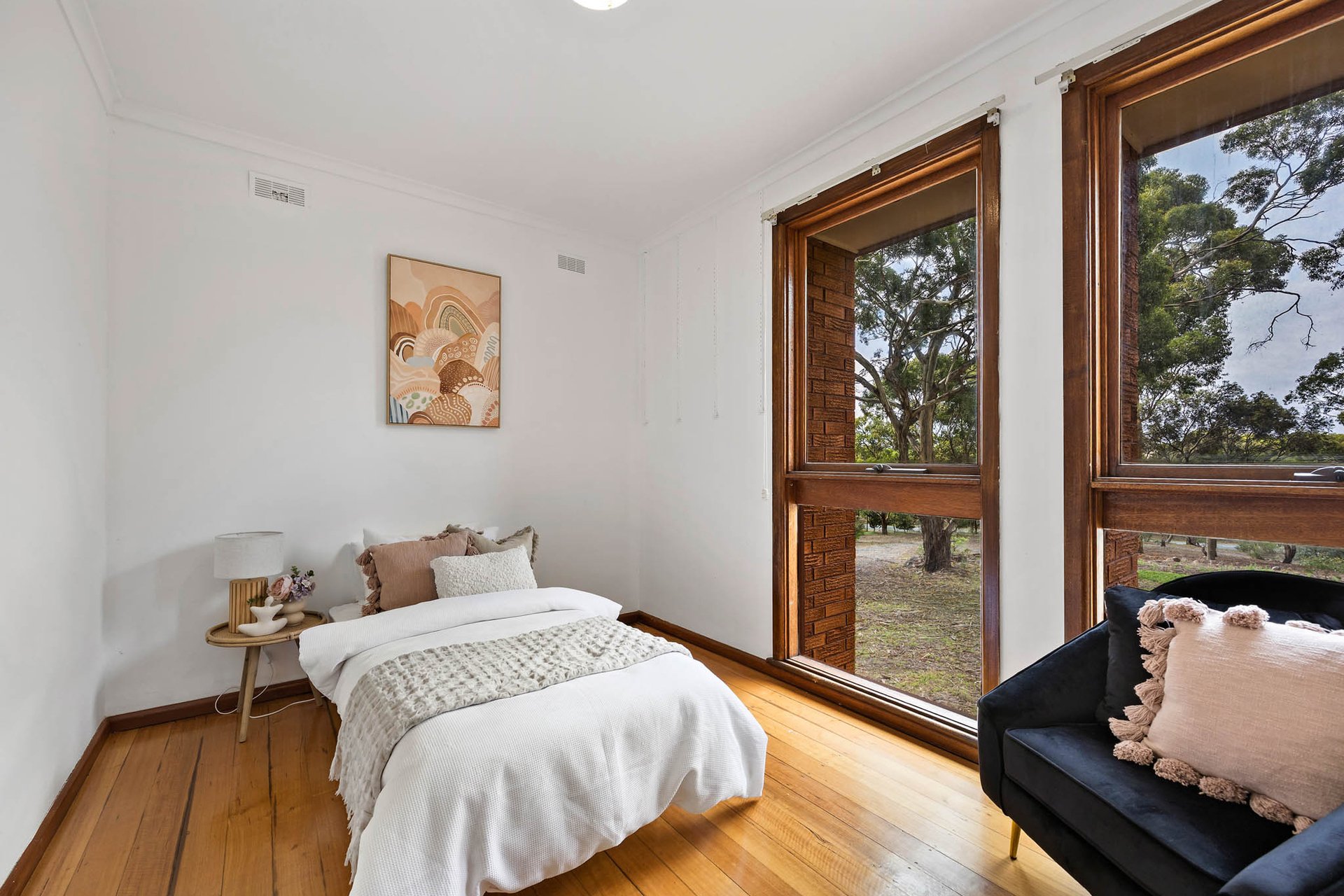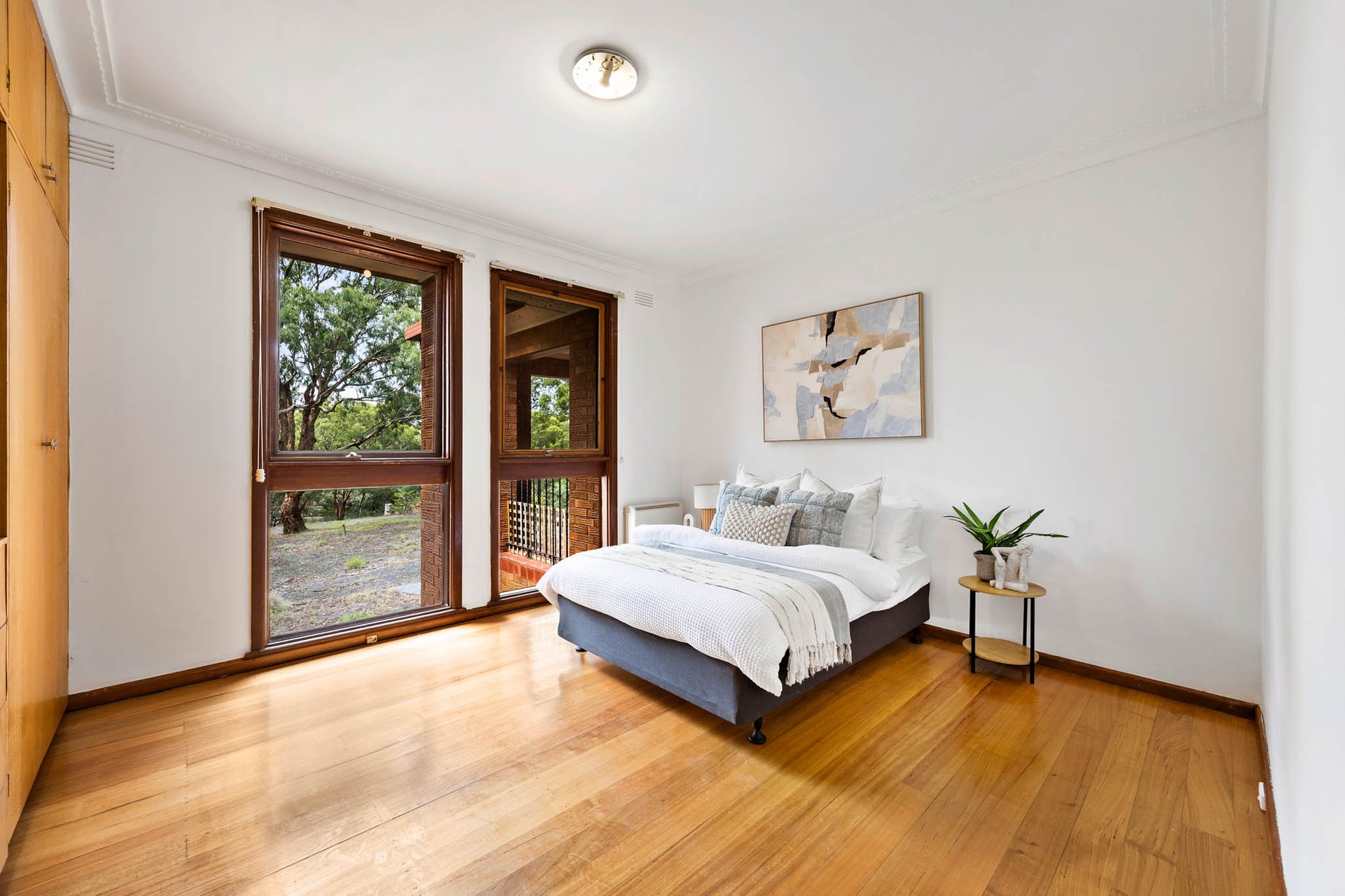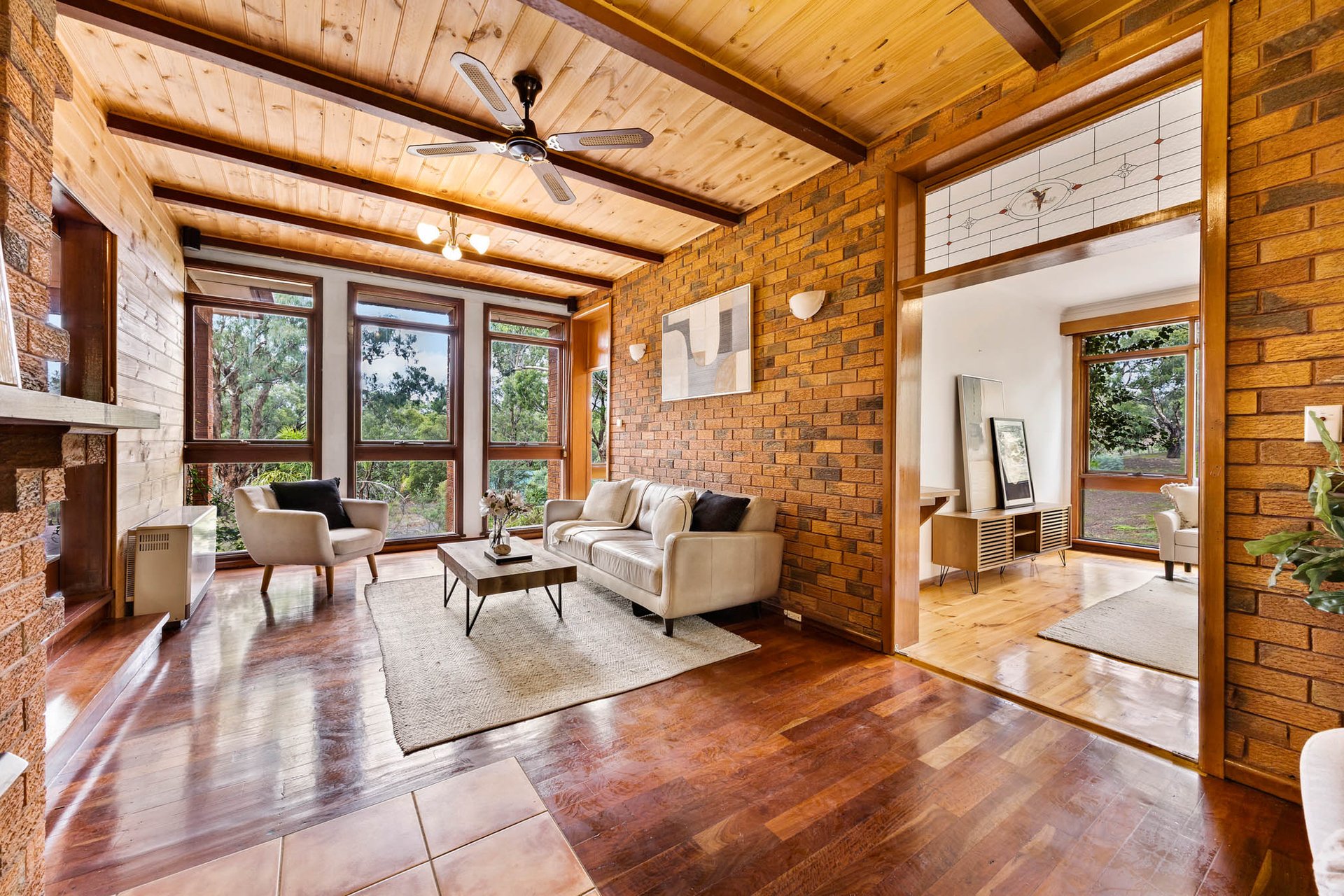 Traditional elements set an immediate tone, with a genuine leadlight front door, pine-lined vertical joinery feature walls, and polished hardwood flooring creating rich foundations ready for a quick and easy, budget-conscious refresh (STCA). Living zones unfold with impressive scale, while the kitchen is appointed with stone surfaces, soft-close cabinetry, a Westinghouse oven and an electric cooktop.