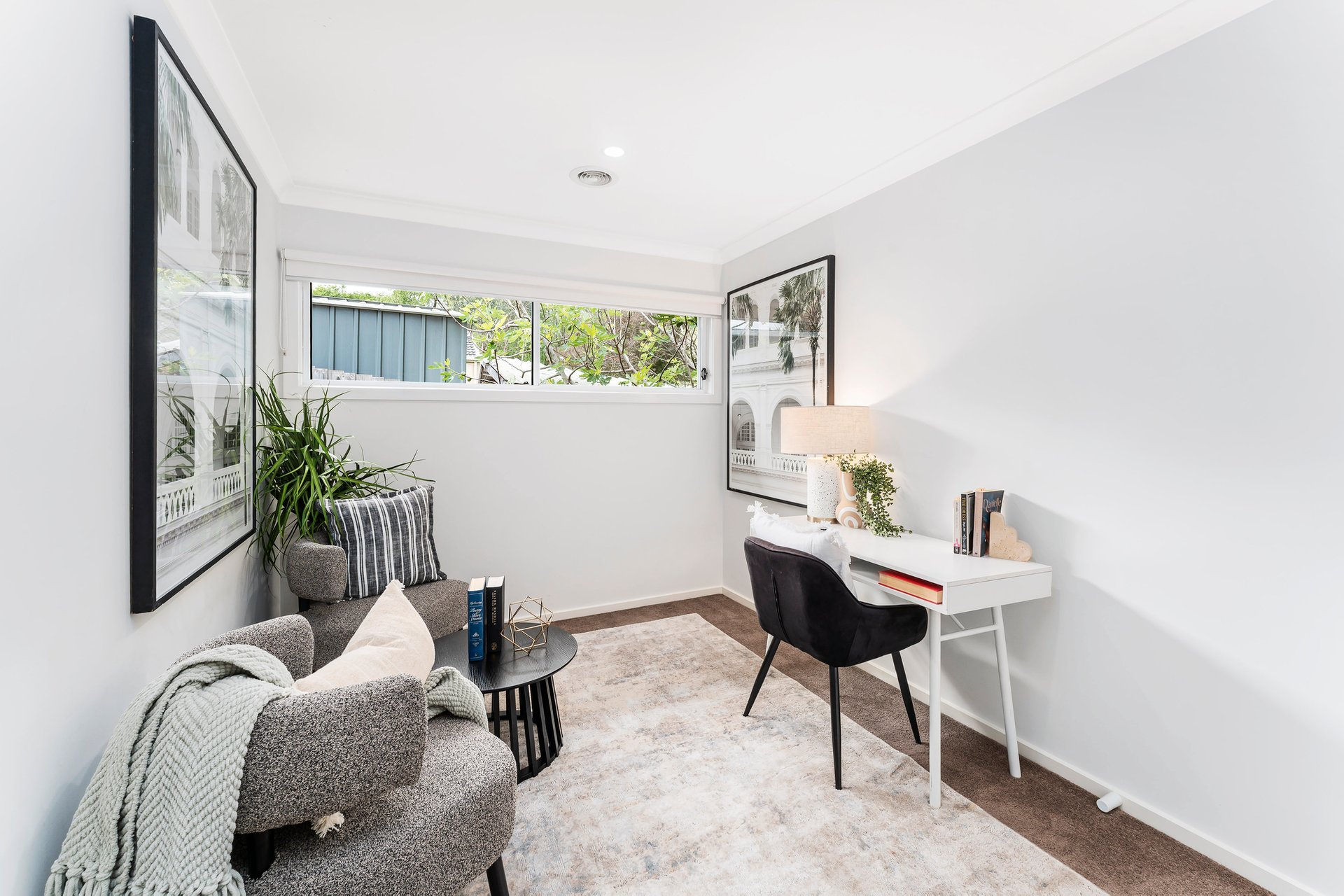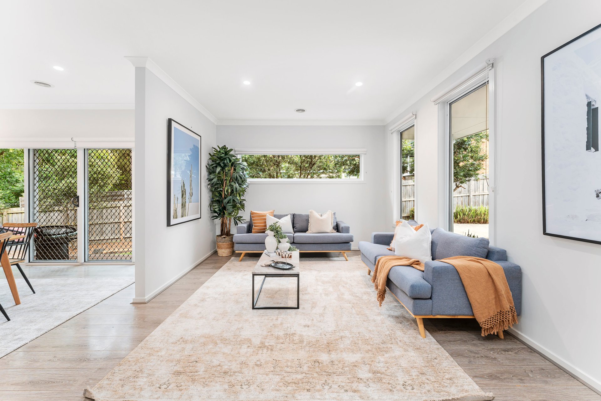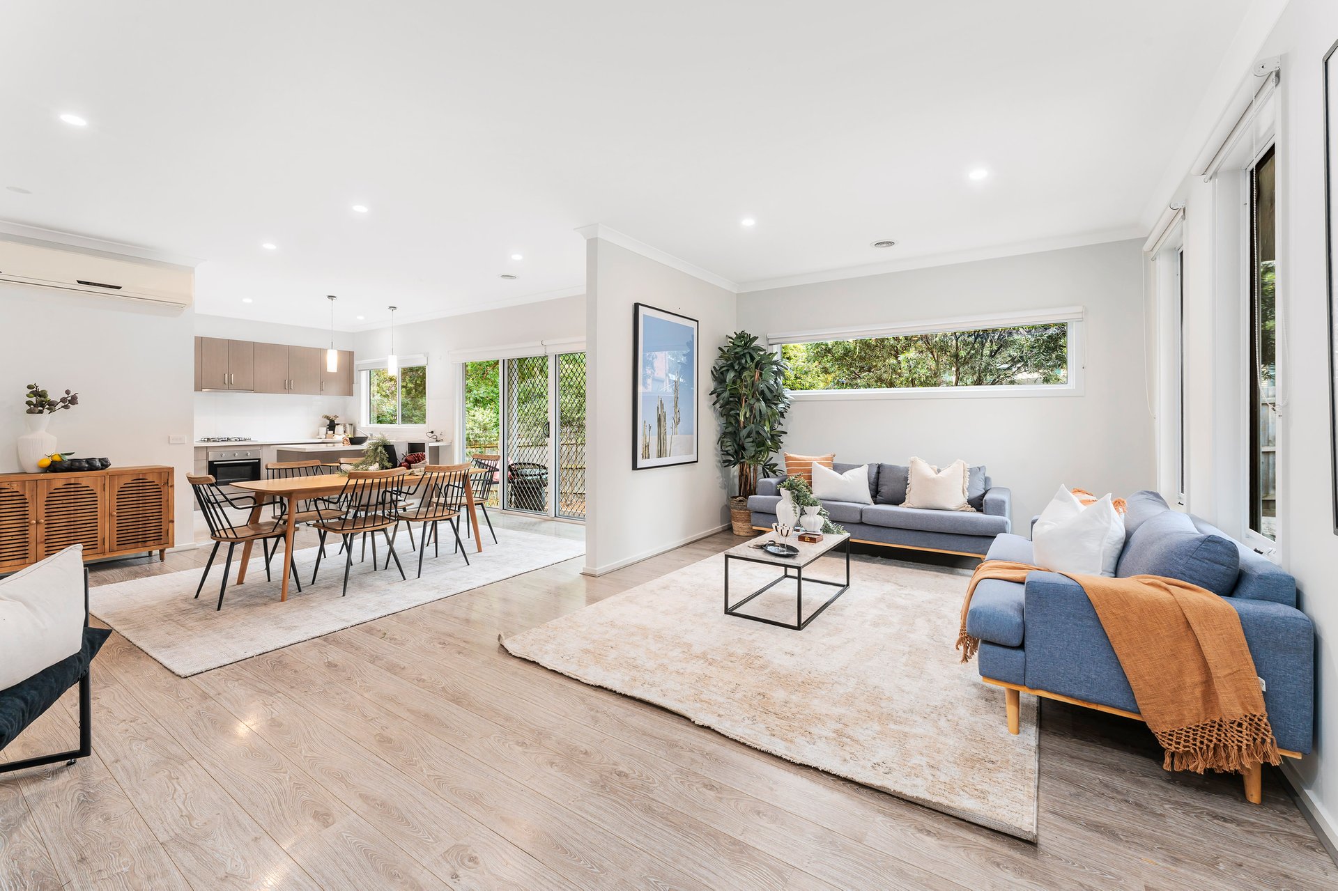 Nestled at the rear of a dual-occupancy allotment on approximately 636sqm, this pretty-as-a-picture home is private, peaceful and presented to impress. Lofty and light-filled, you’ll immediately feel comfortable in the expansive living and dining room, highlighted by tall ceilings and overseen by a stylish kitchen with stainless steel appliances, generous storage and Caesarstone benches. Twin glass doors with flyscreens slide across to a covered and lit breakfast deck, extending the calming space to a secure backyard with a serene treed outlook.