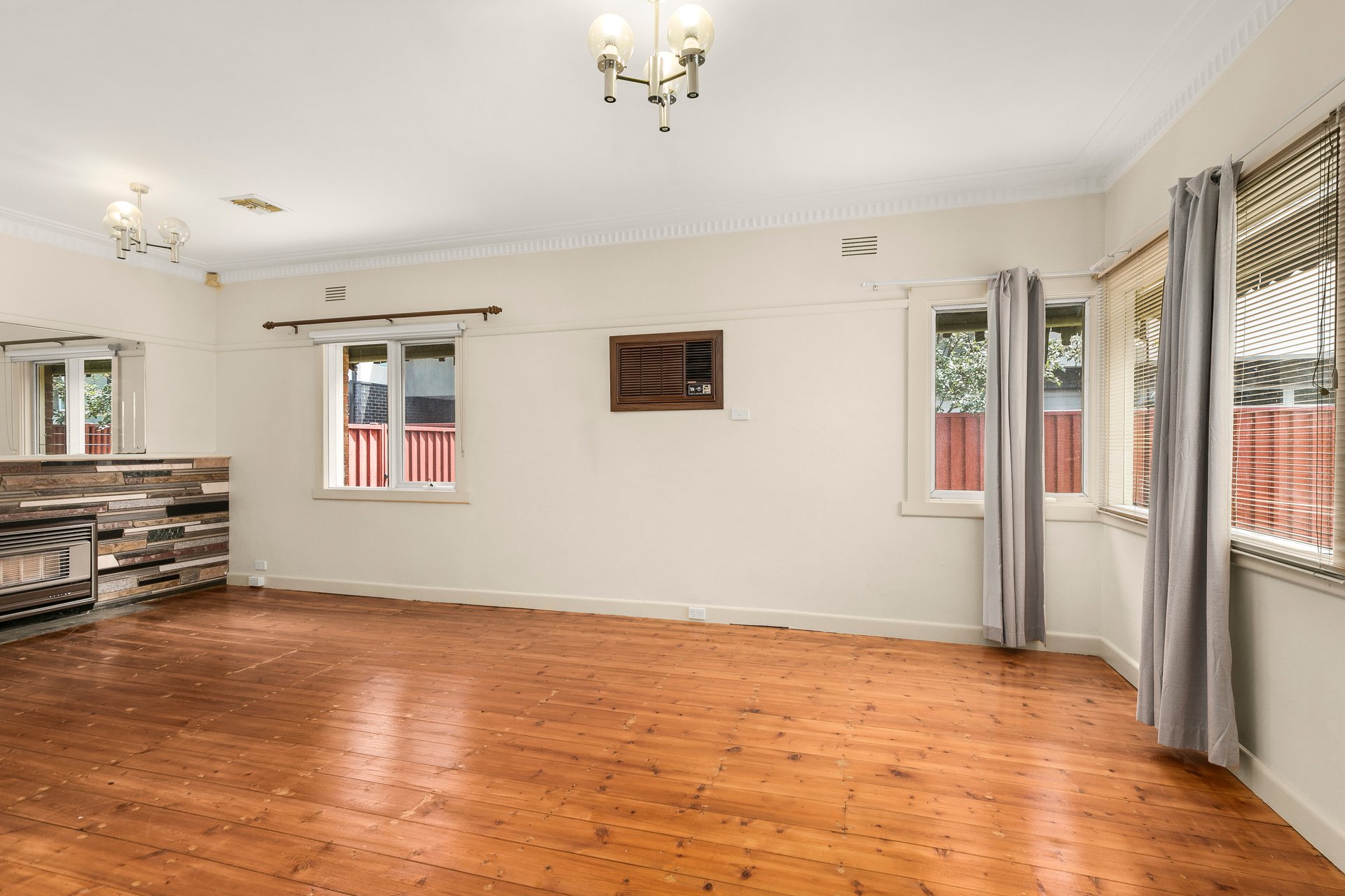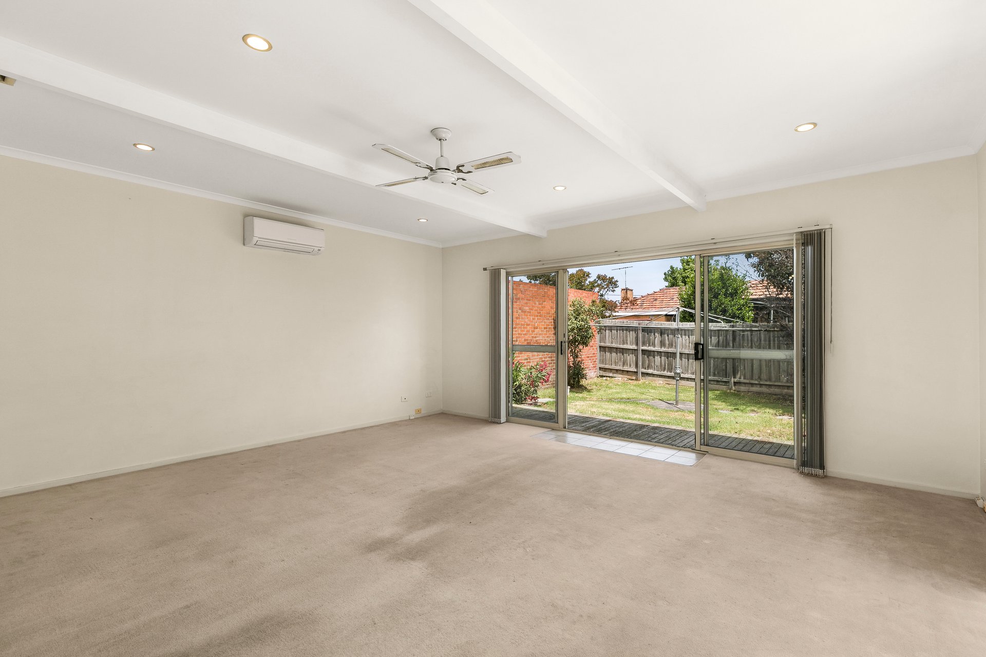 - Open plan living and dining area with split system and ceiling fan