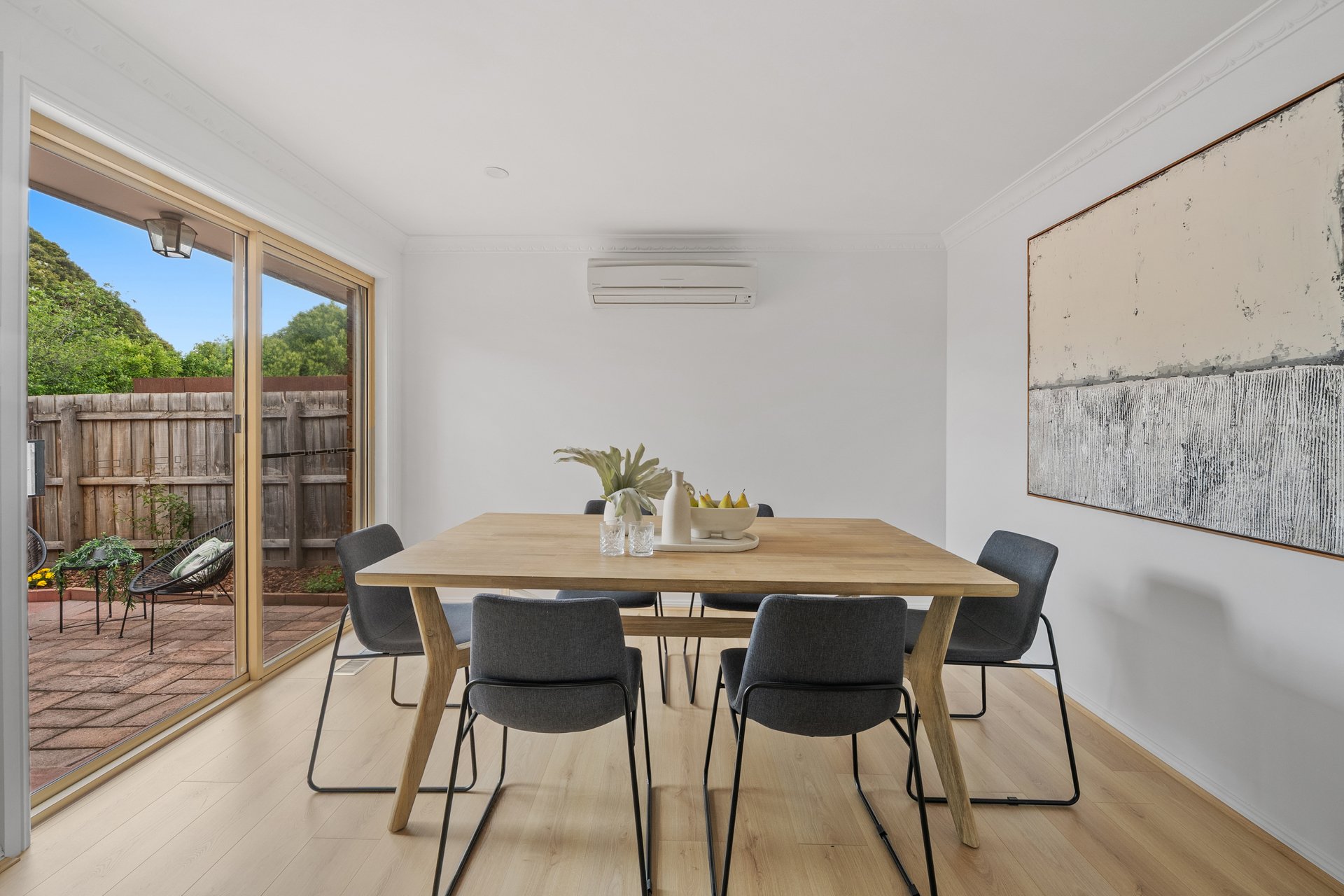 The well-appointed kitchen includes gas cooking, a dishwasher, and an adjoining dining space. Stylish floorboards flow throughout, complemented by gas ducted heating, split-system cooling, and a secure lock-up garage.