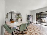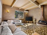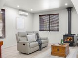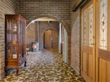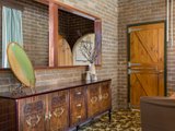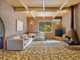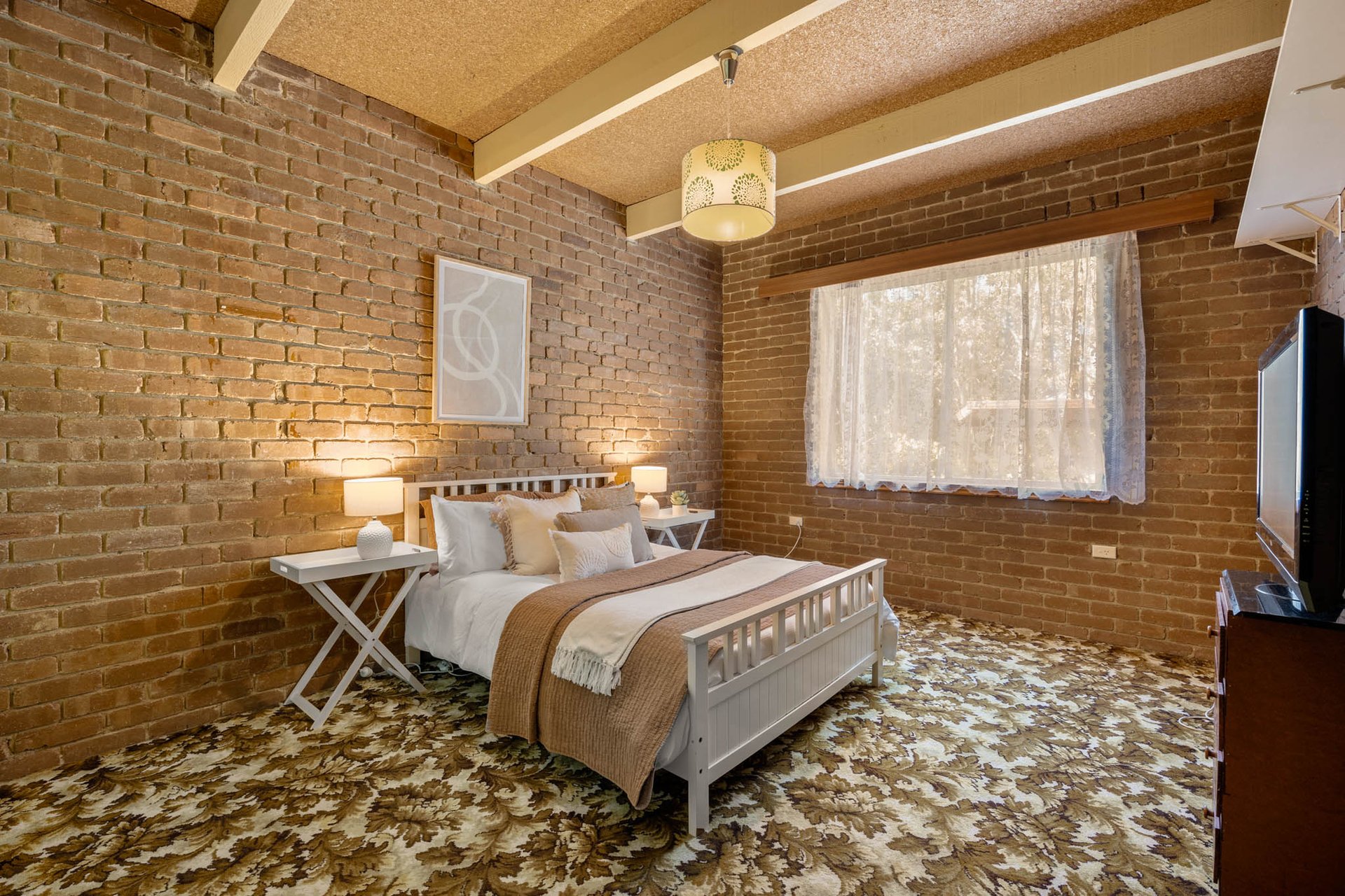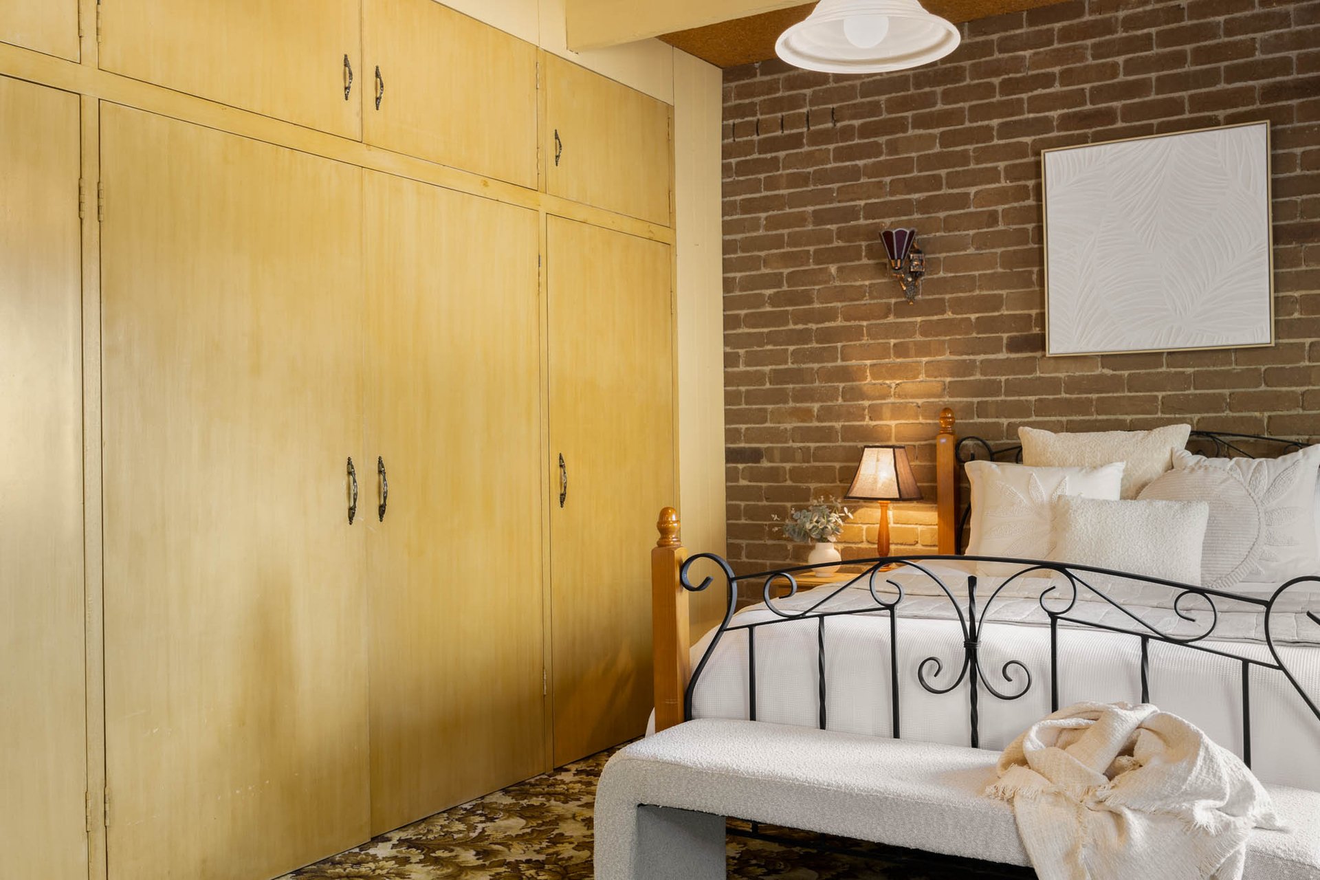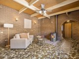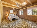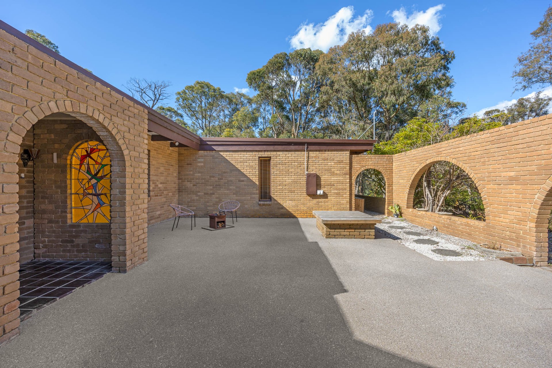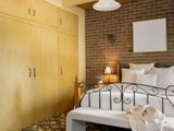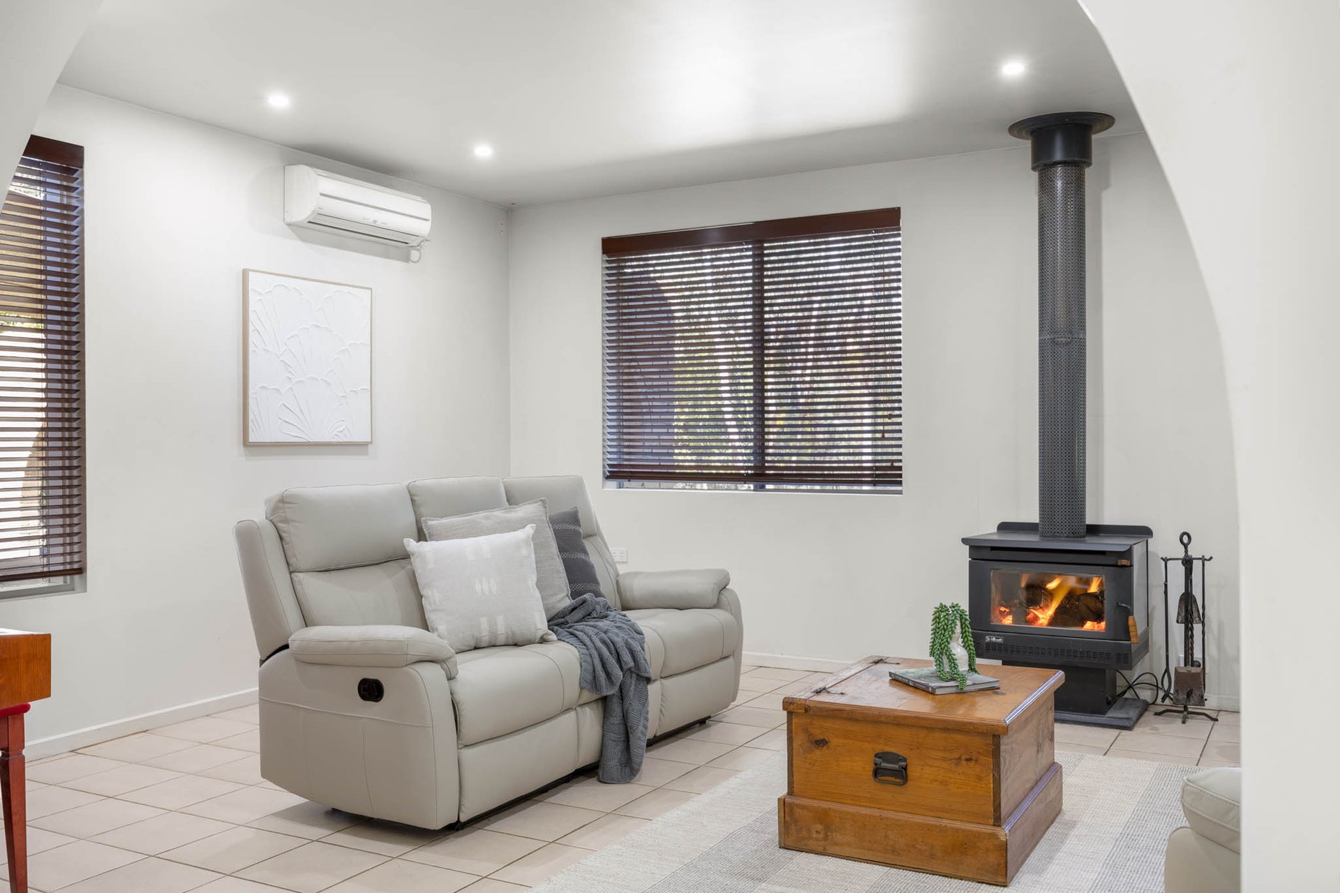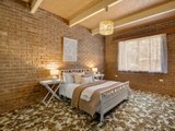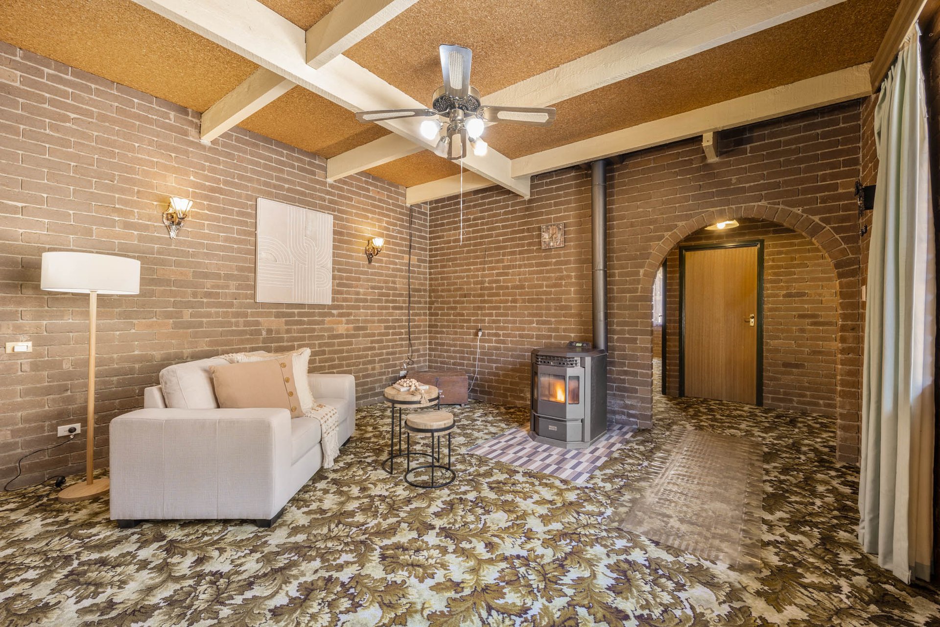 The main residence begins with an arched entrance leading to a private courtyard shaded by a sail and cleverly built above water storage. Leadlight windows decorate the portico, hinting at the character within. Once inside, exposed brick interiors and compressed straw insulated ceilings create both warmth and energy efficiency, while a series of inviting living spaces promise comfort in every season. The Firemaster pellet heater in the living area spreads gentle heat, the freestanding cone fireplace in the lounge offers a show-stopping retro centrepiece with sliding doors opening to the deck, and the family room glows with the charm of a Coonara wood heater.