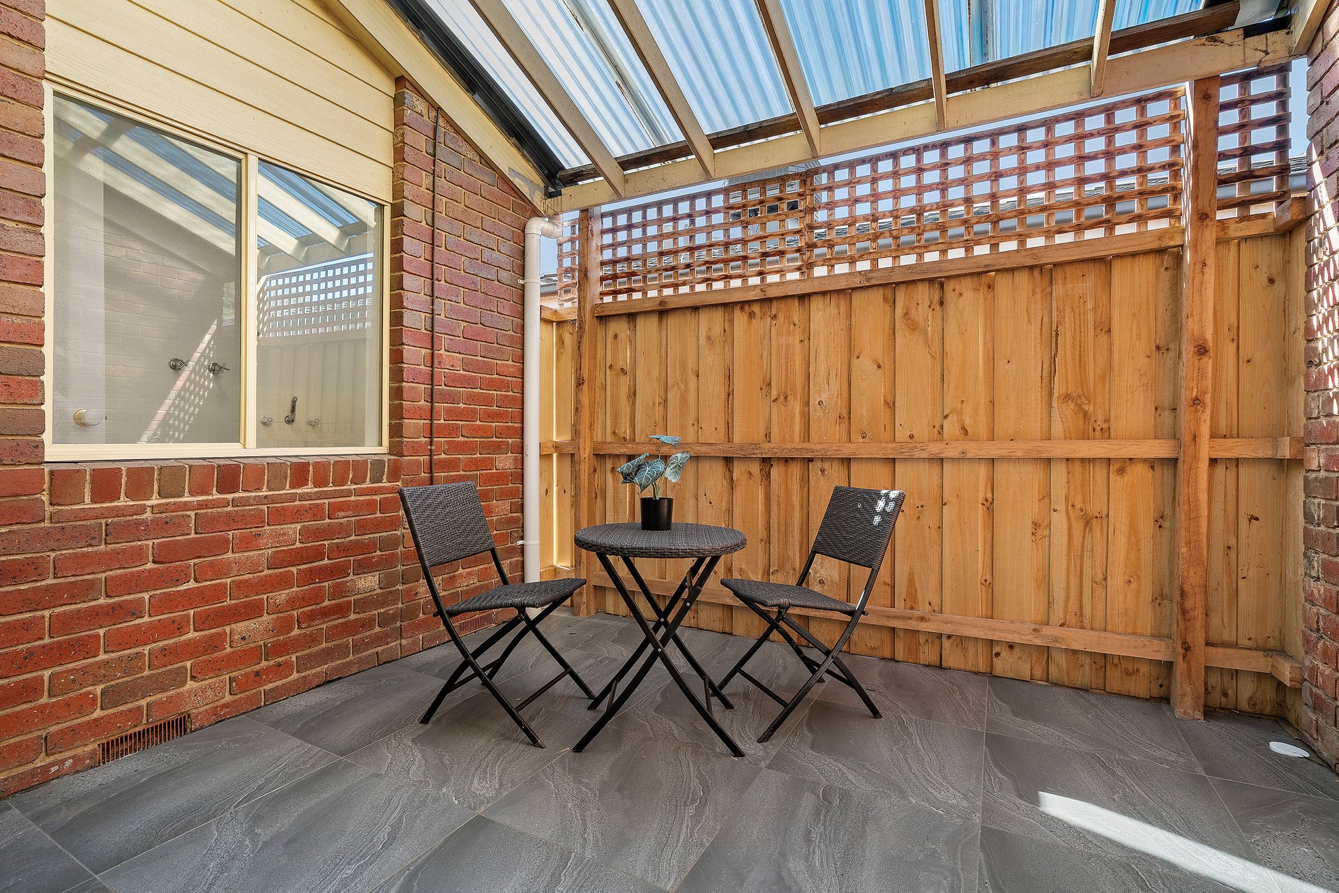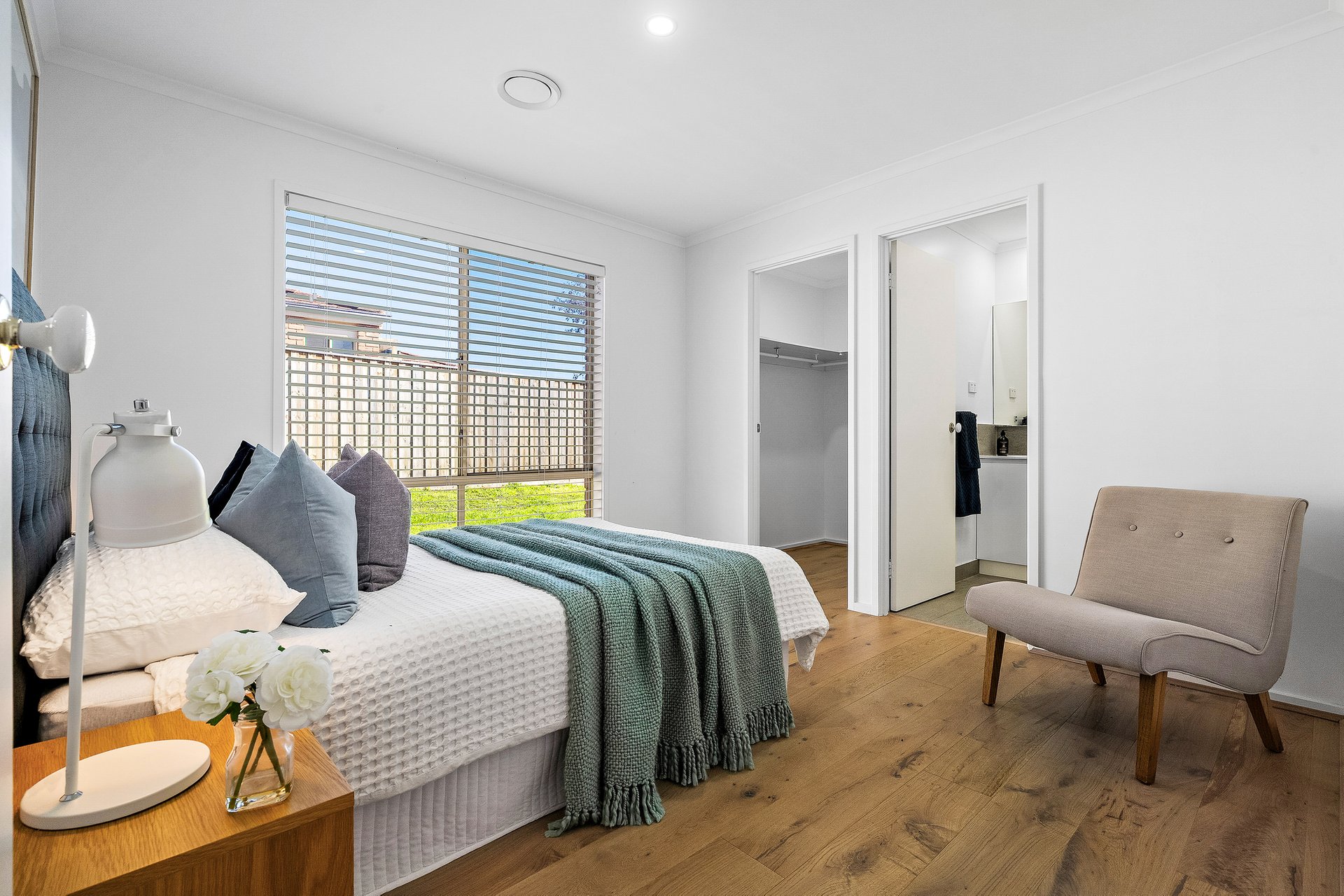 With straightforward simplicity that pleases, the home boasts a seamless stone kitchen with gas cooking and dishwasher. Flanked by a living room to one side and a dining to the other that opens onto a paved entertainer’s pergola overlooking the generous wraparound gardens.