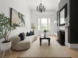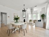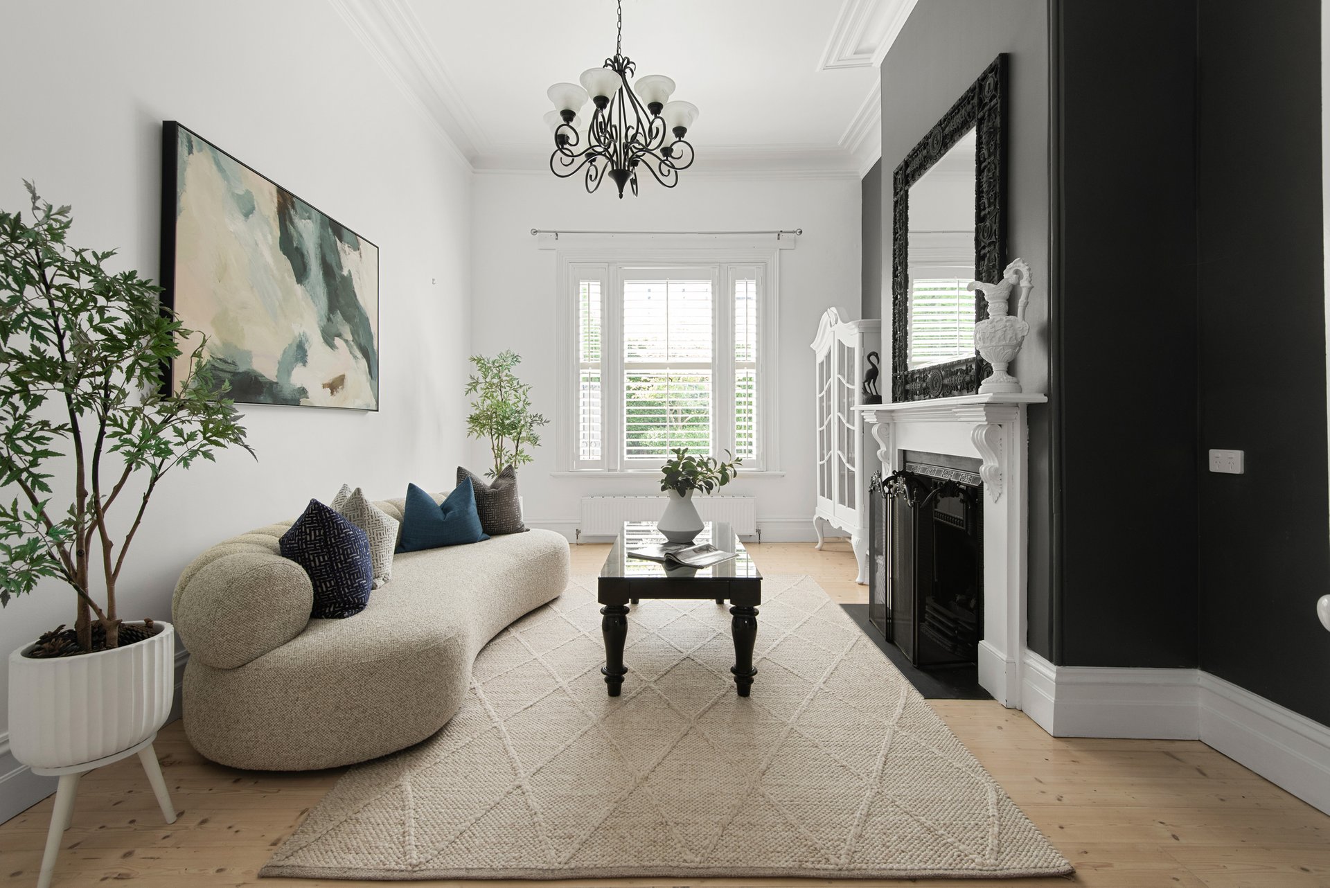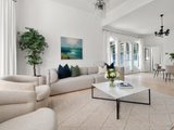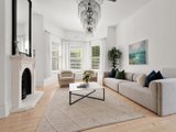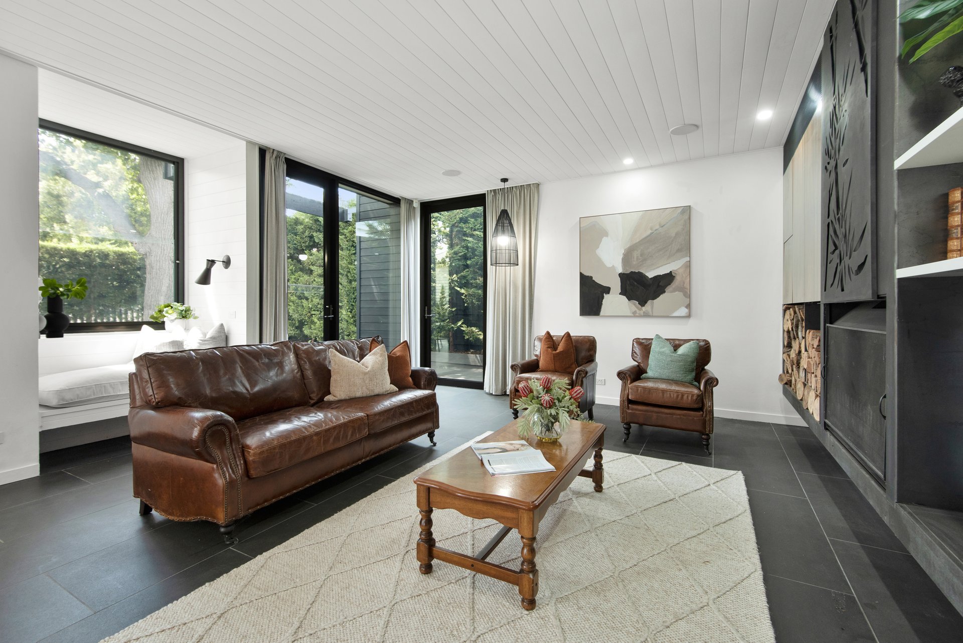 Elegant formal living and dining rooms are enriched by north-facing period windows, an open fireplace and statement chandelier, with French doors opening to the outdoor entertaining zone — perfect for hosting on any scale.