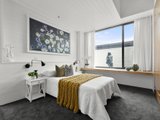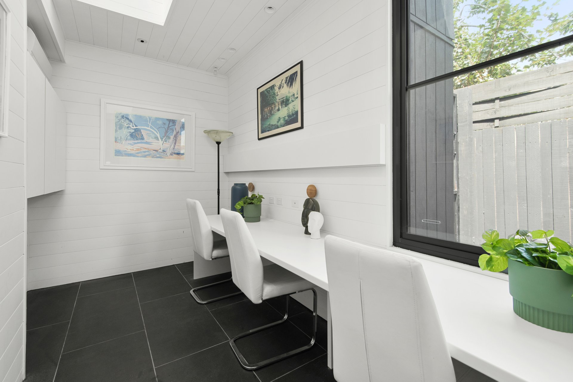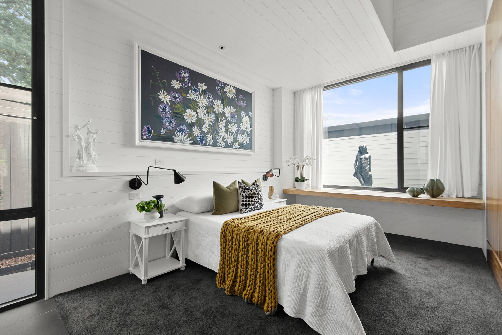 The privately positioned master suite is a true sanctuary, overlooking a tranquil courtyard and complemented by a light-filled ensuite with dual shower and generous vanity. A remarkable church window created by celebrated Australian artist and former owner David Boyd forms a stunning focal point, adding artistic significance and historical depth.