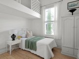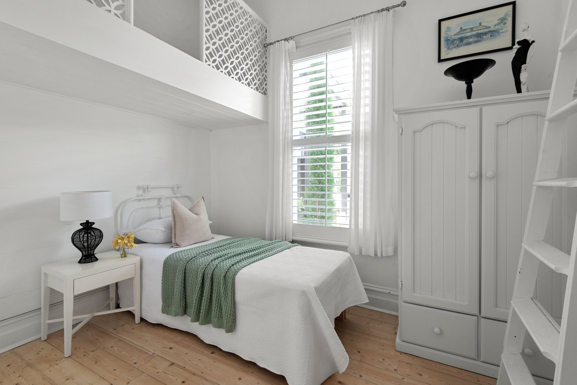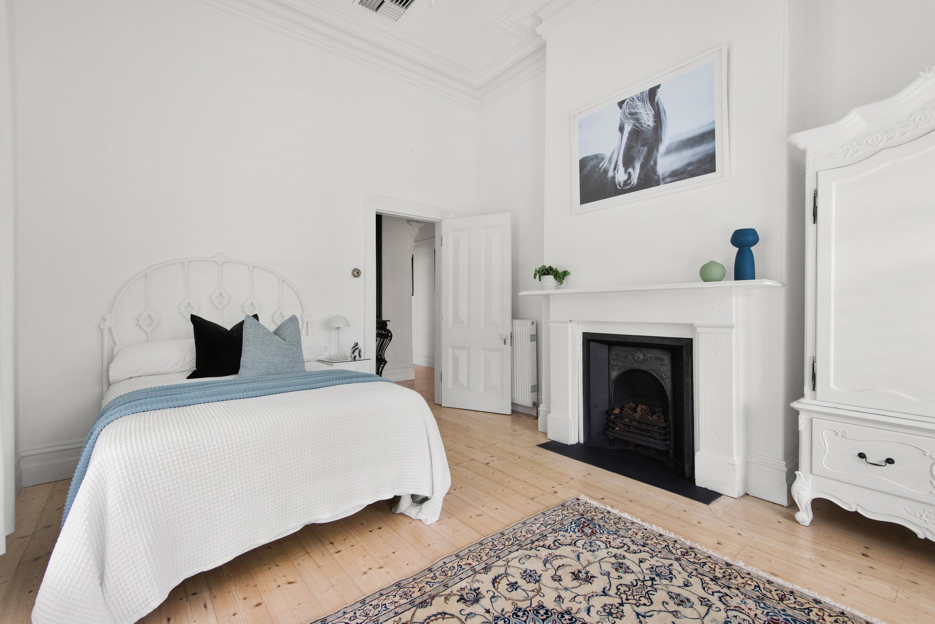 Four additional bedrooms provide outstanding accommodation, each finished with polished timber floors and plantation shutters. Two retain original fireplaces, while one features a charming mezzanine retreat. A stylish, fully tiled central bathroom services the family wing, and a substantial study offers flexibility as a fifth bedroom if required.