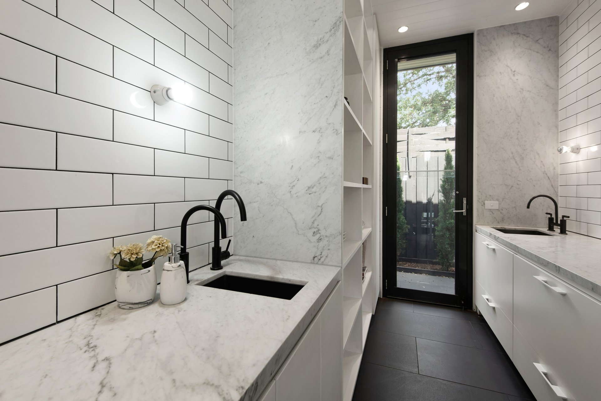 The oversized laundry combines practicality and style, enhanced by subway tiles, warm timber panelling and abundant cabinetry. Landscaped gardens maximise the prized northern aspect, blending structured elegance with lush greenery, mature trees and tranquil water features to create a serene oasis.