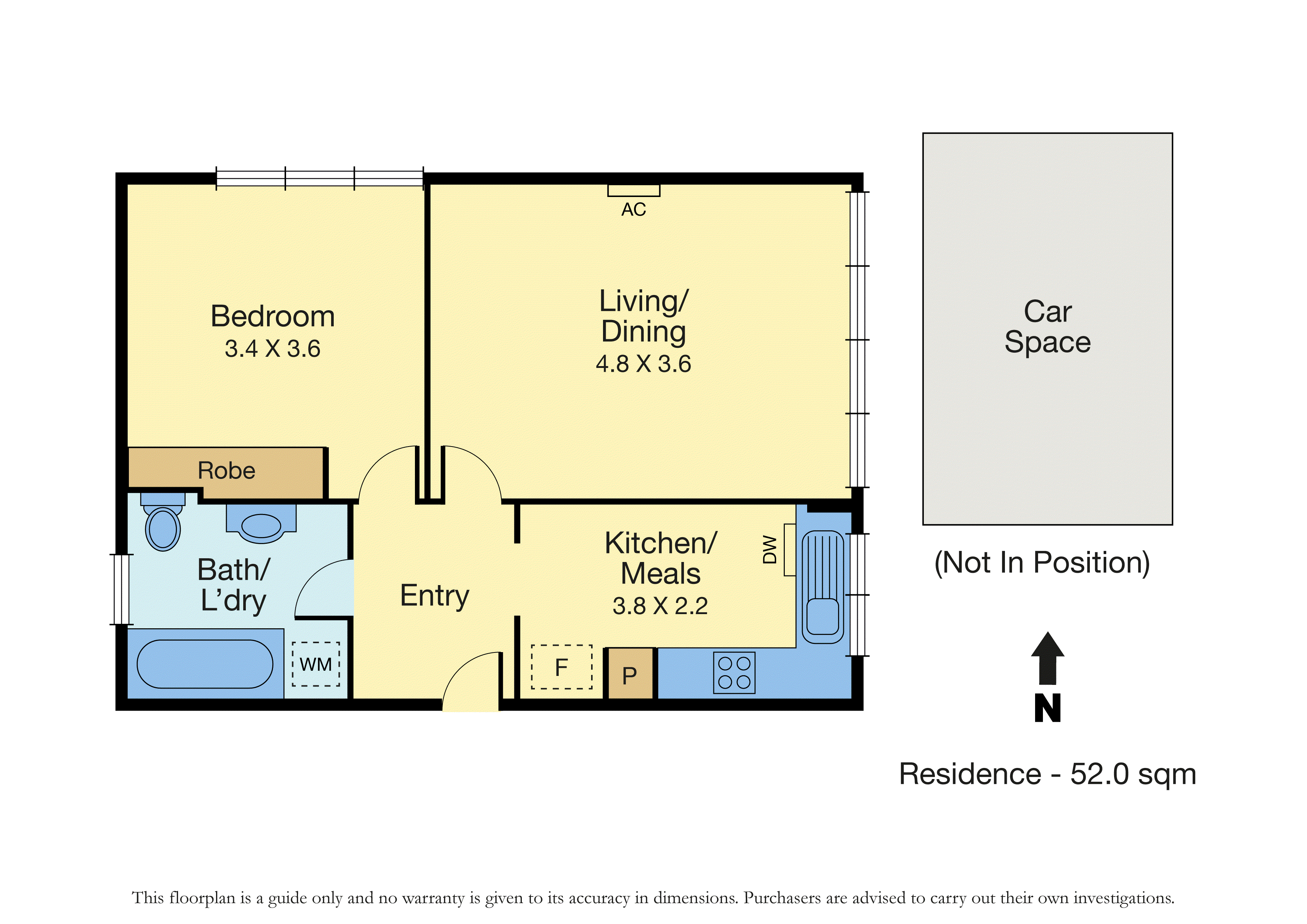 The bedroom includes built-in robes. The bathroom features a shower over bath and laundry taps. A split system air conditioner, car space and secure intercom entry add further value.